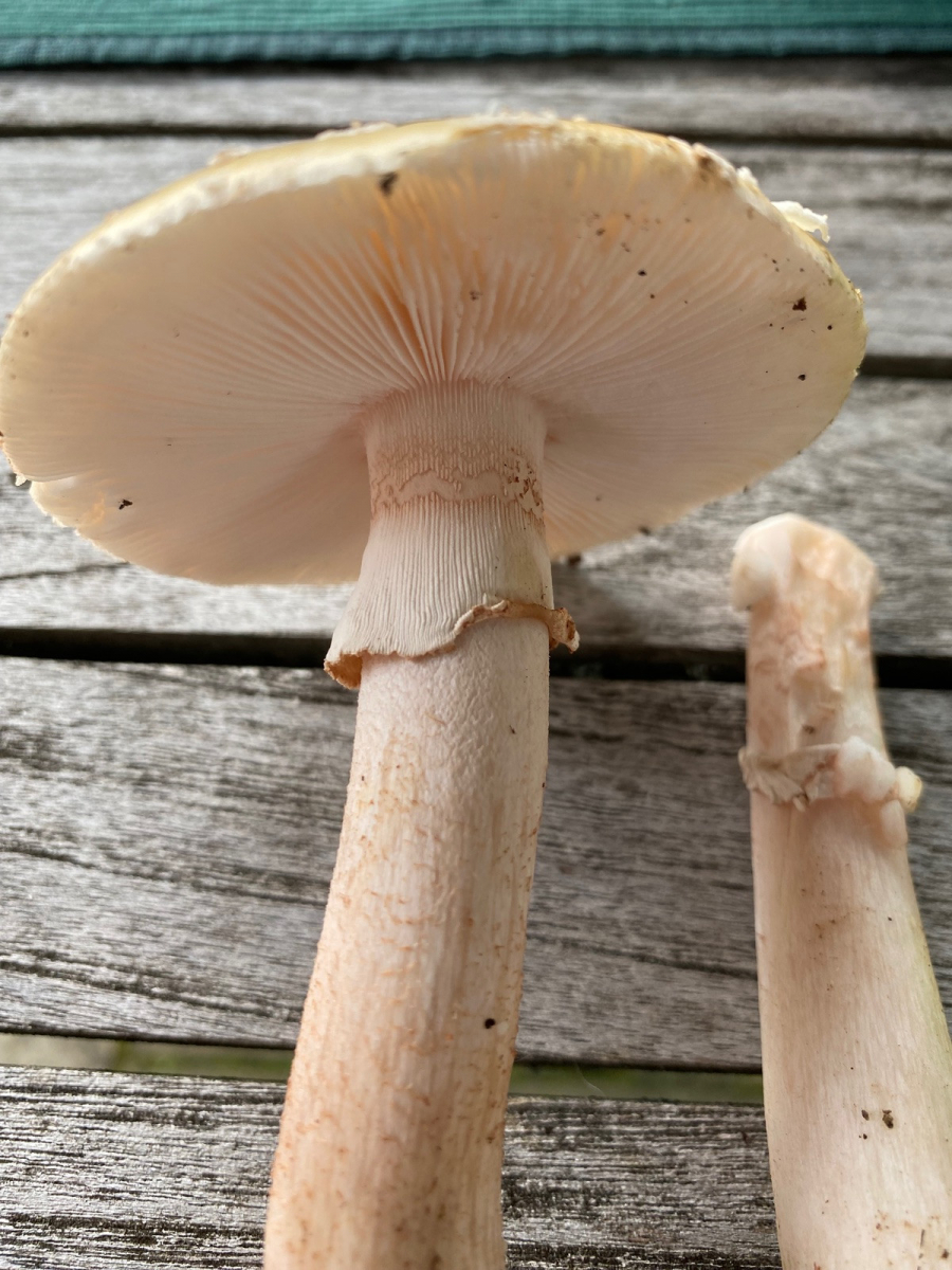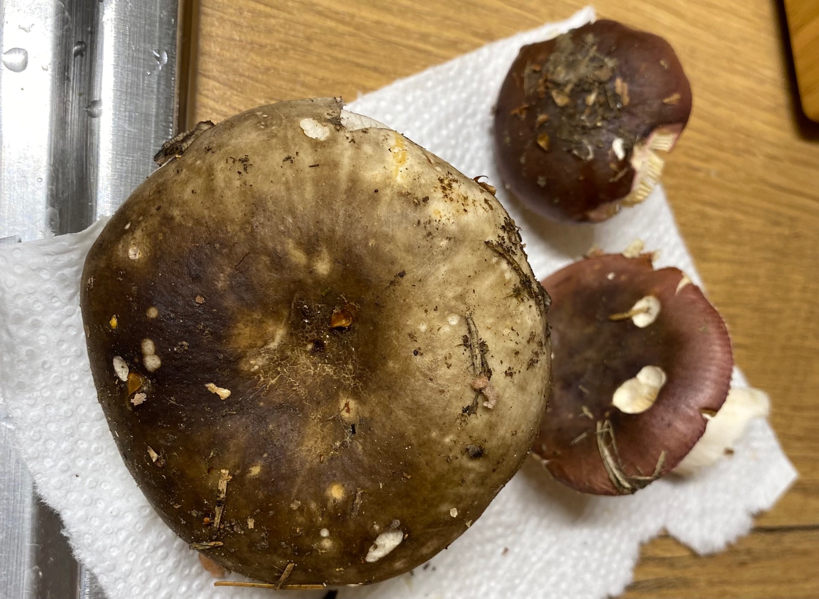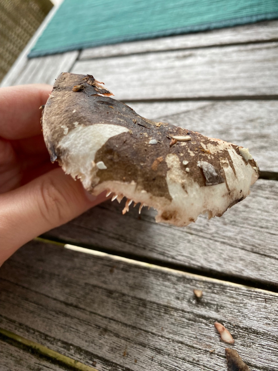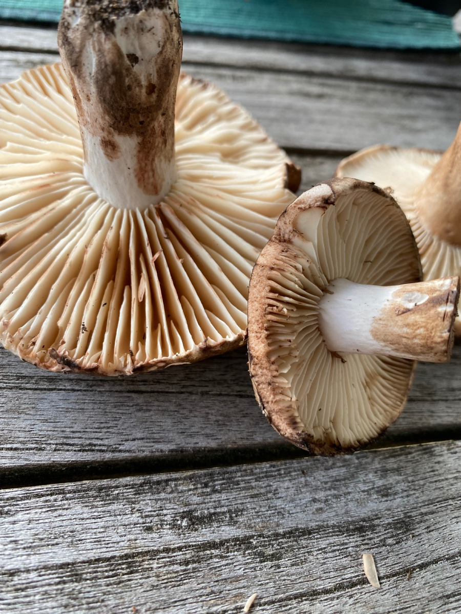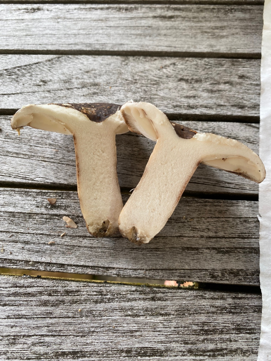 2) evtl. Rotstieliger Ledertäubling? Harter Hut. Stiel ist mürbe (wegen Alter?), leicht fasrig, hauptsächlich bröcklig (siehe Bild). Hutdurchmesser 16,5cm. Stiel hellgelb und lila überhaucht. Lamellen leicht brechend in hellgelber Farbe analog zum Stiel. Geschmacksprobe angenehm. Geruch süßlich angenehm.