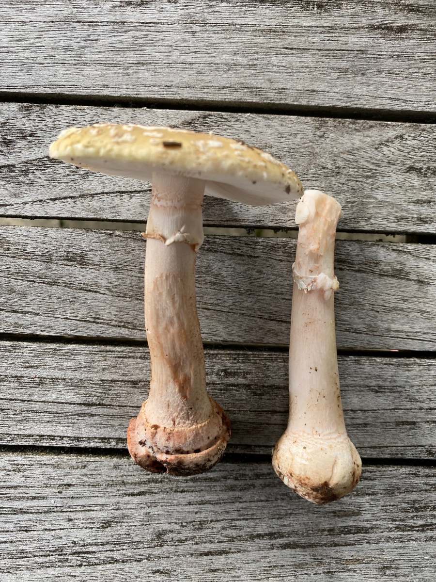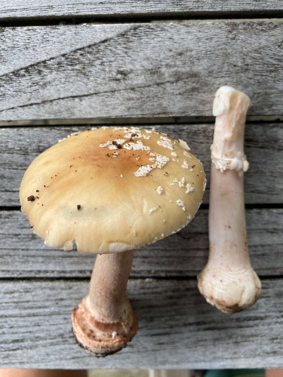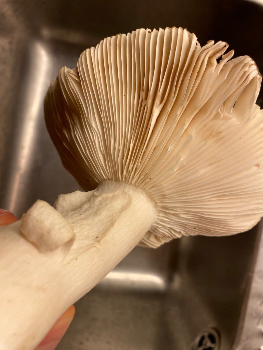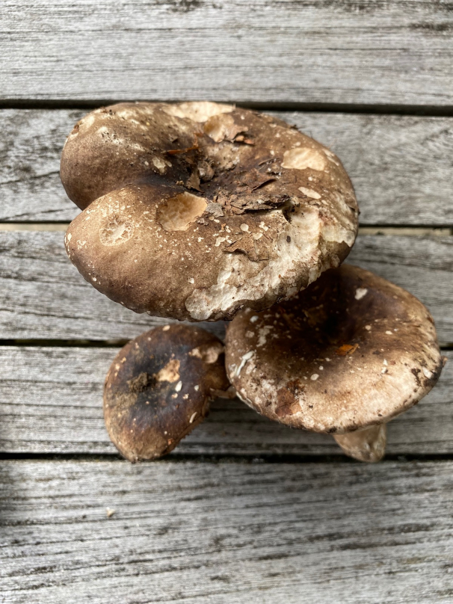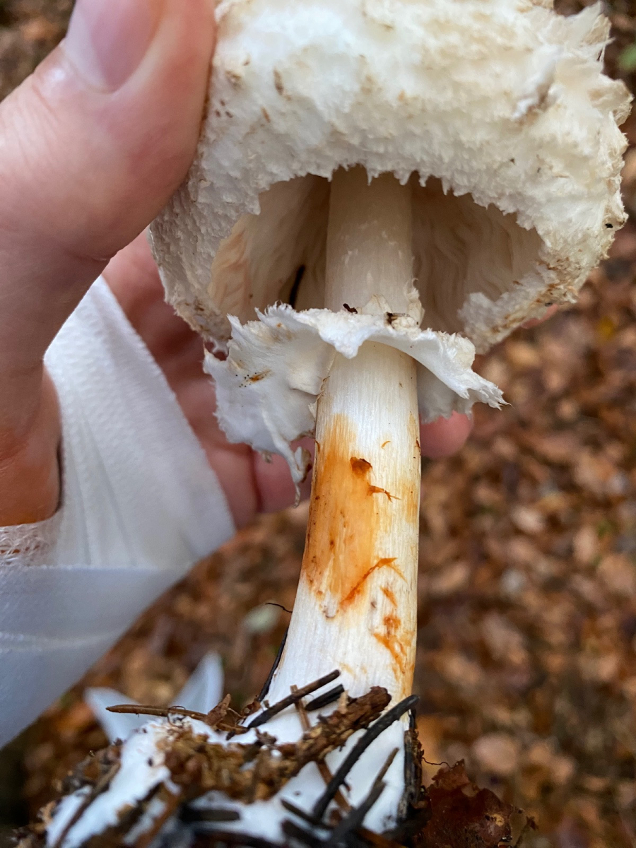 2) evtl. Rotstieliger Ledertäubling? Harter Hut. Stiel ist mürbe (wegen Alter?), leicht fasrig, hauptsächlich bröcklig (siehe Bild). Hutdurchmesser 16,5cm. Stiel hellgelb und lila überhaucht. Lamellen leicht brechend in hellgelber Farbe analog zum Stiel. Geschmacksprobe angenehm. Geruch süßlich angenehm.