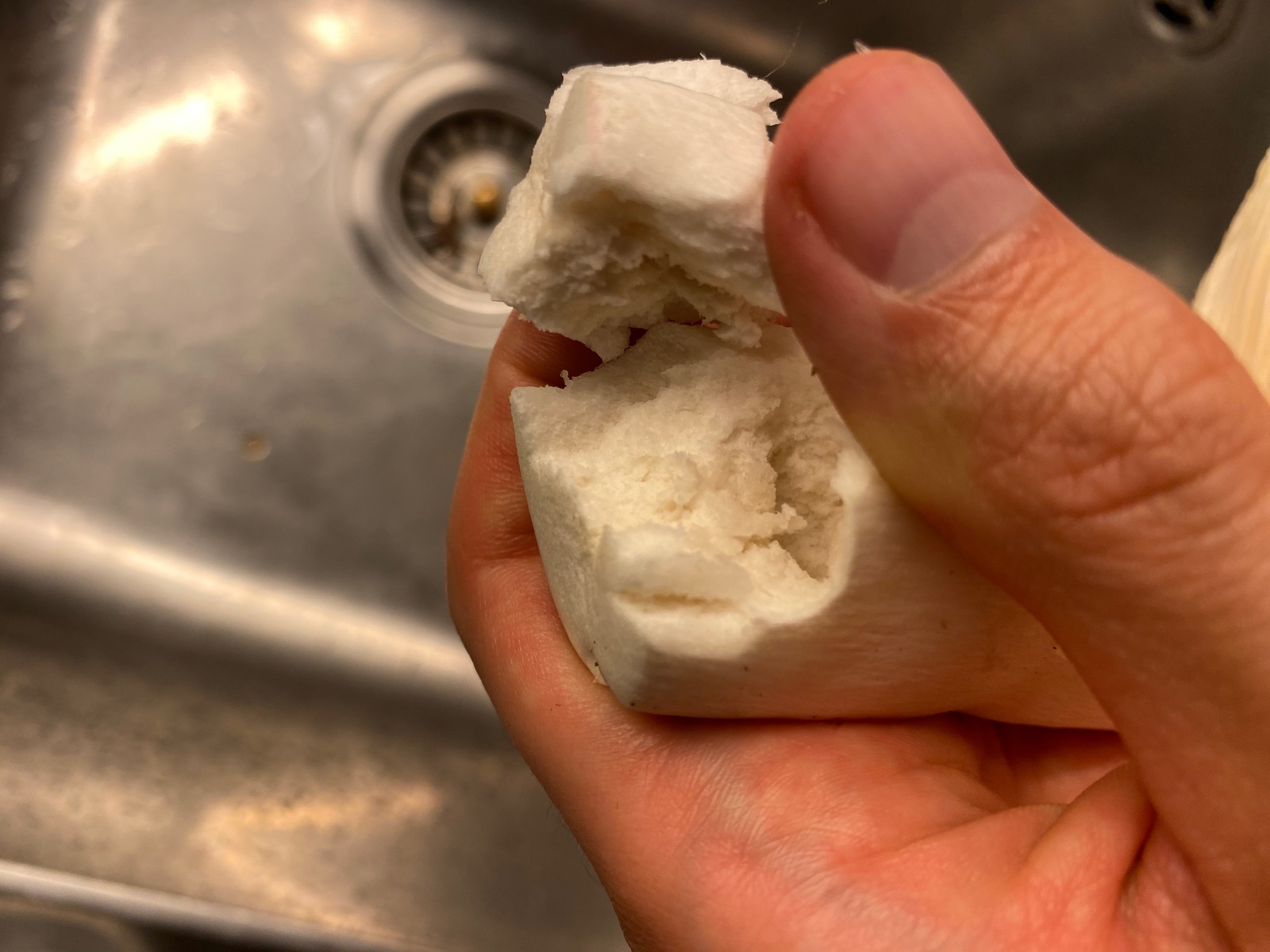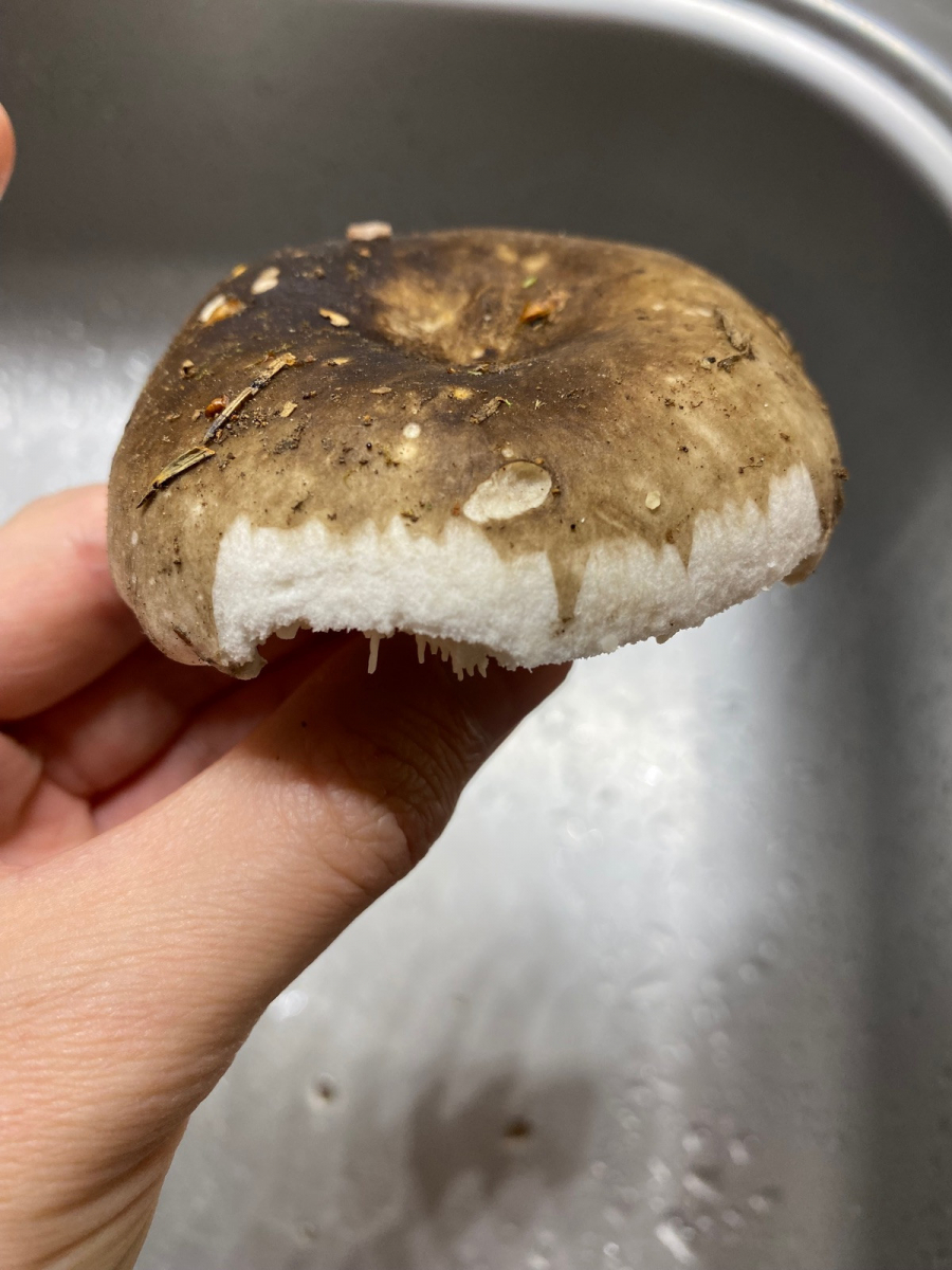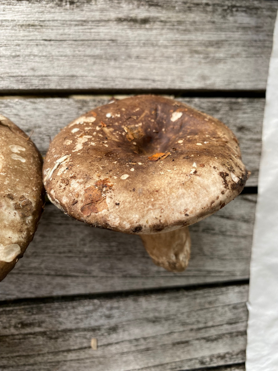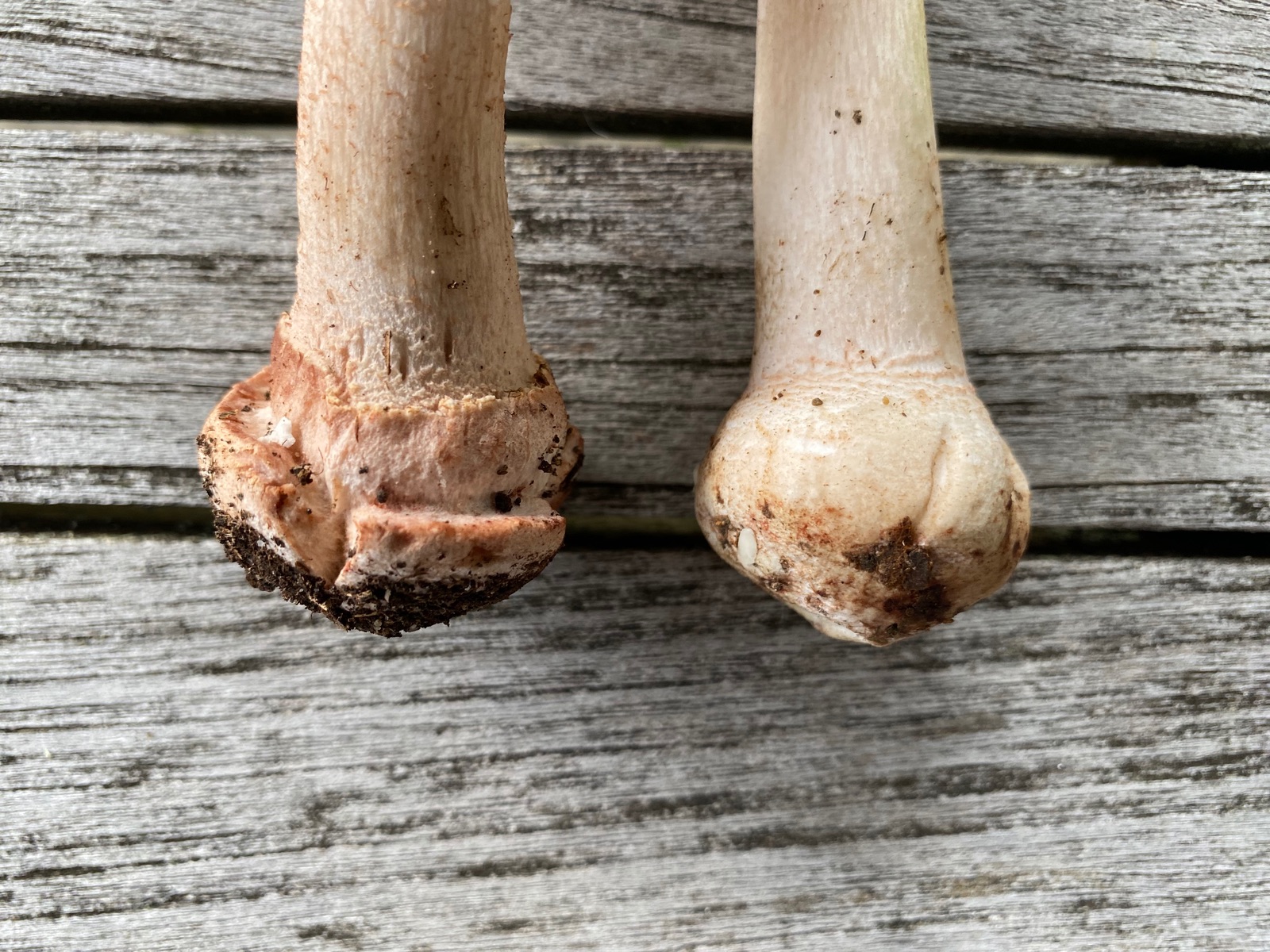 2) evtl. Rotstieliger Ledertäubling? Harter Hut. Stiel ist mürbe (wegen Alter?), leicht fasrig, hauptsächlich bröcklig (siehe Bild). Hutdurchmesser 16,5cm. Stiel hellgelb und lila überhaucht. Lamellen leicht brechend in hellgelber Farbe analog zum Stiel. Geschmacksprobe angenehm. Geruch süßlich angenehm.