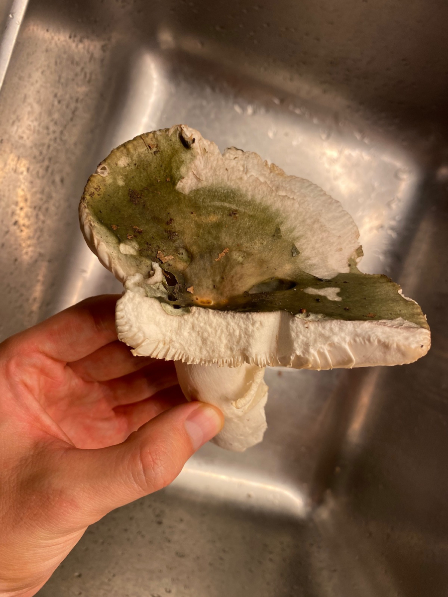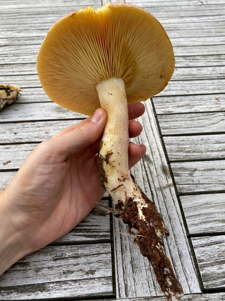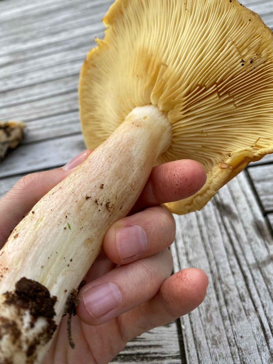 3) dachte hier von der Draufsicht an den Speisetäubling, hab aber keine Ahnung was das ist: Hutfarbe gelb-rosa-lila. Durchmesser 13,5cm. Ansicht von unten und Stilbasis deutet für mich zunächst auf Täubling. Lamellen hellgelb und sehr brüchig. Stiel mittelfest, rosa überhaucht, aber nicht brüchig sondern fasrig = kein Täubling normalerweise. Geruch angenehm pilzig. Keine Geschmacksprobe genommen.