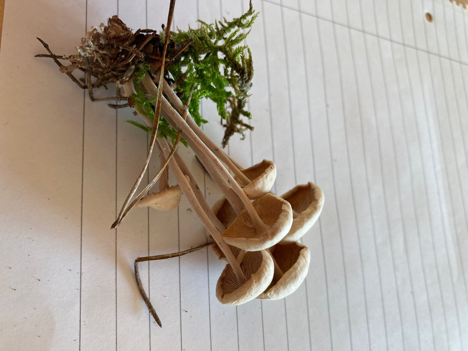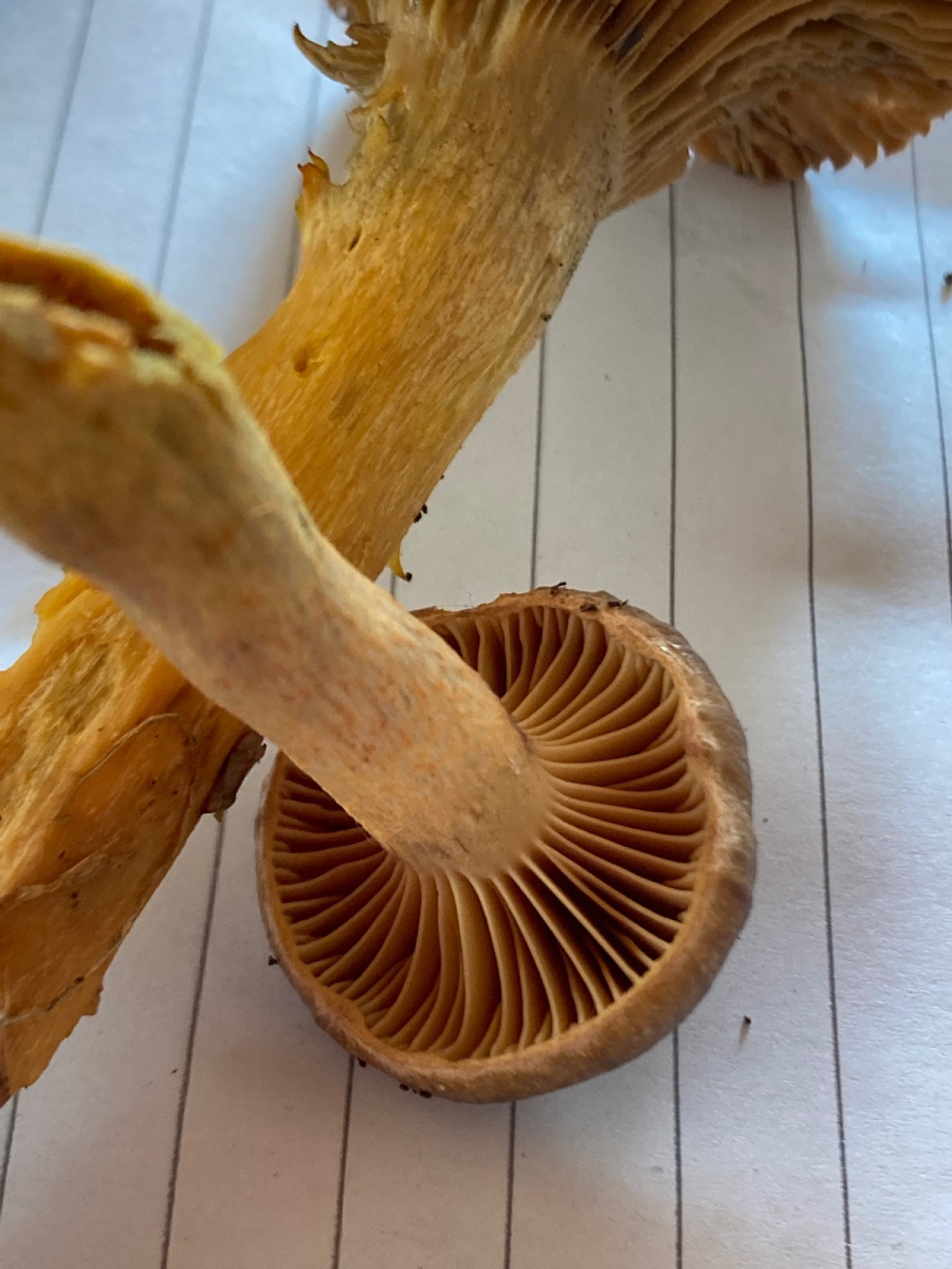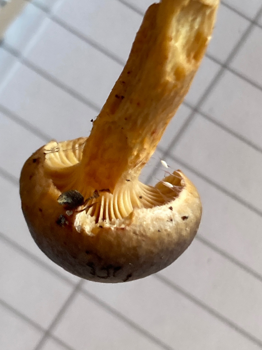 Lamellen: Sehr schmal angewachsen, sehr breit: Fast den gesamten, extrem dünnfleischigen Hut ausfüllend