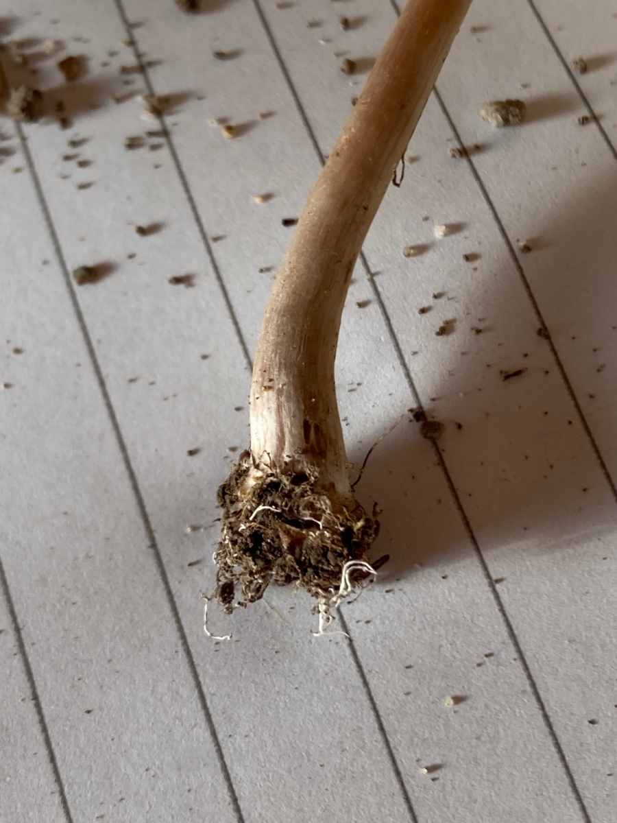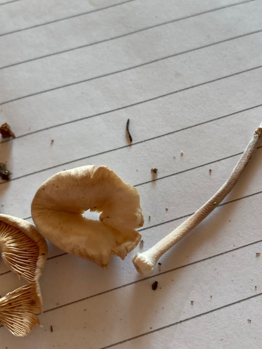 Stiel: Weiß befasert, am Lamellenansatz verdickt (zieht man den Stiel heraus, sieht der Hut wie ein Knopf aus), sehr elastisch, rüblingsartig