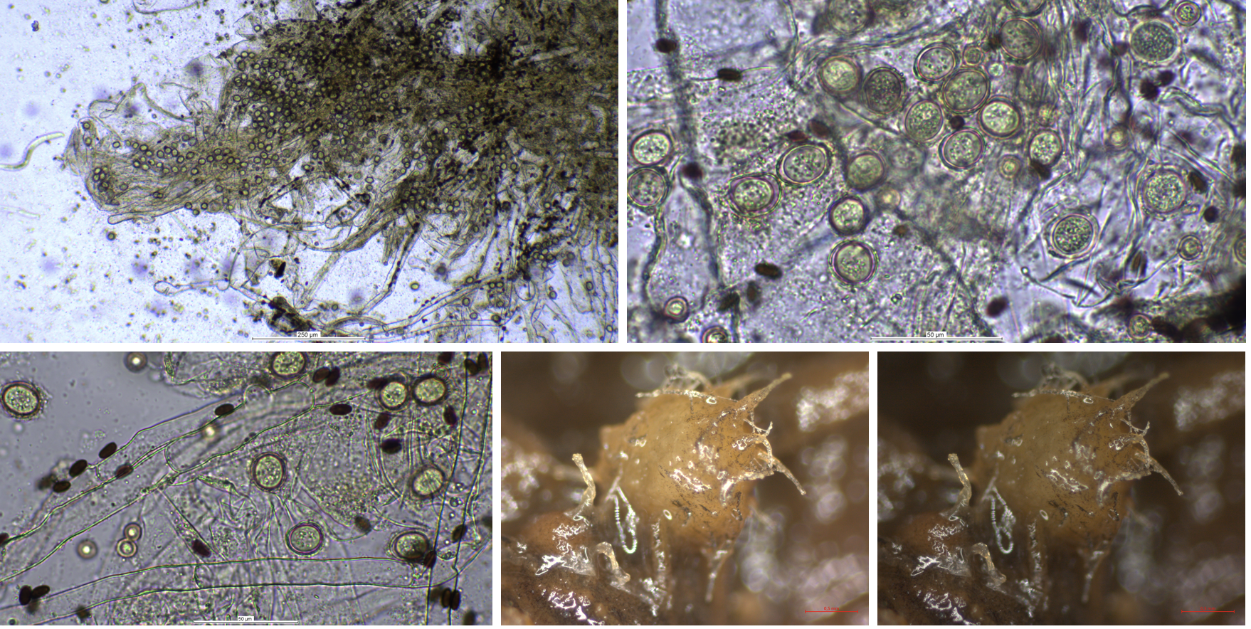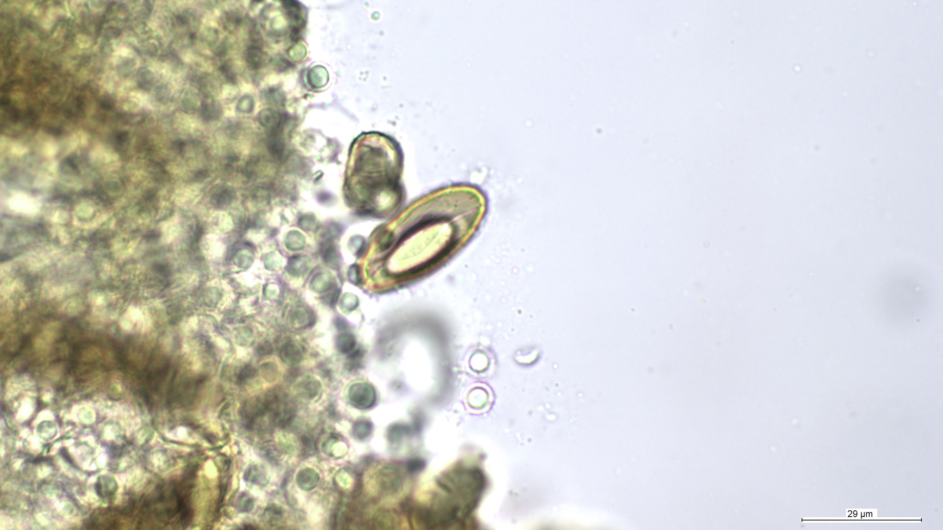 Vom Fruchtkörper habe ich leider keine Bilder, aber er sieht dem Ascobolus albidus sehr ähnlich, mit einem hellem Fruchtkörper und hellen Sporen.