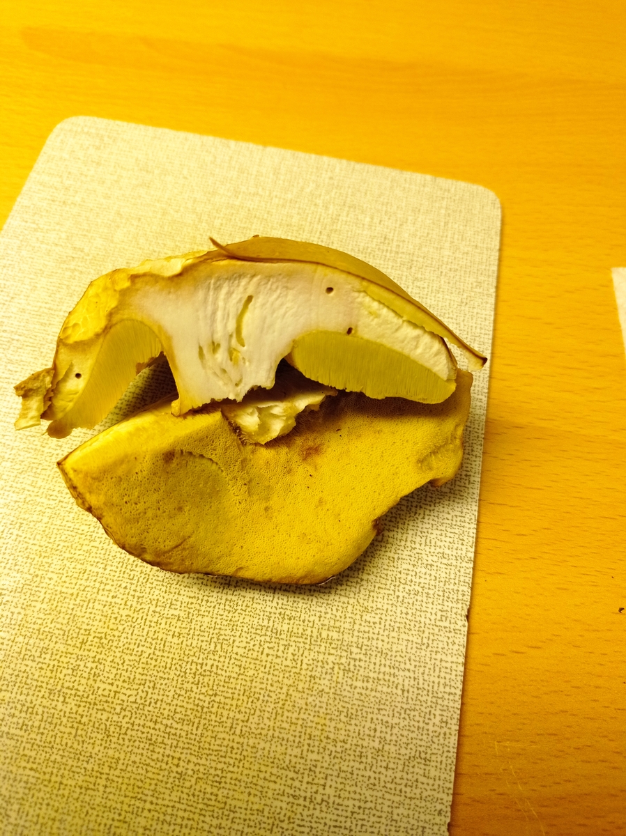 Der Weiße: Den konnte schon man aus 20m am Baum sehen. Weiß, unförmig, nichts an Stiel, Lamellen oder sonstwas zu erkennen. EInfach nur ein weißes etwas. Ich hab oben mal ein Stück angeschnitten. Sieht man auf dem Foto kaum, aber für mich auch eher nichtssagend. Ein poröses etwas.
