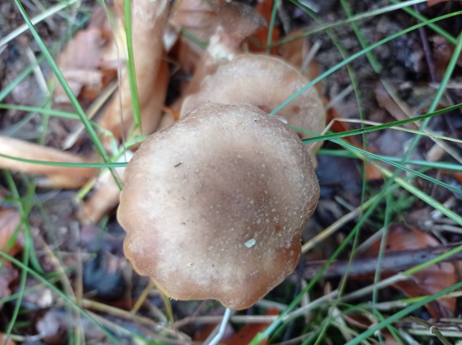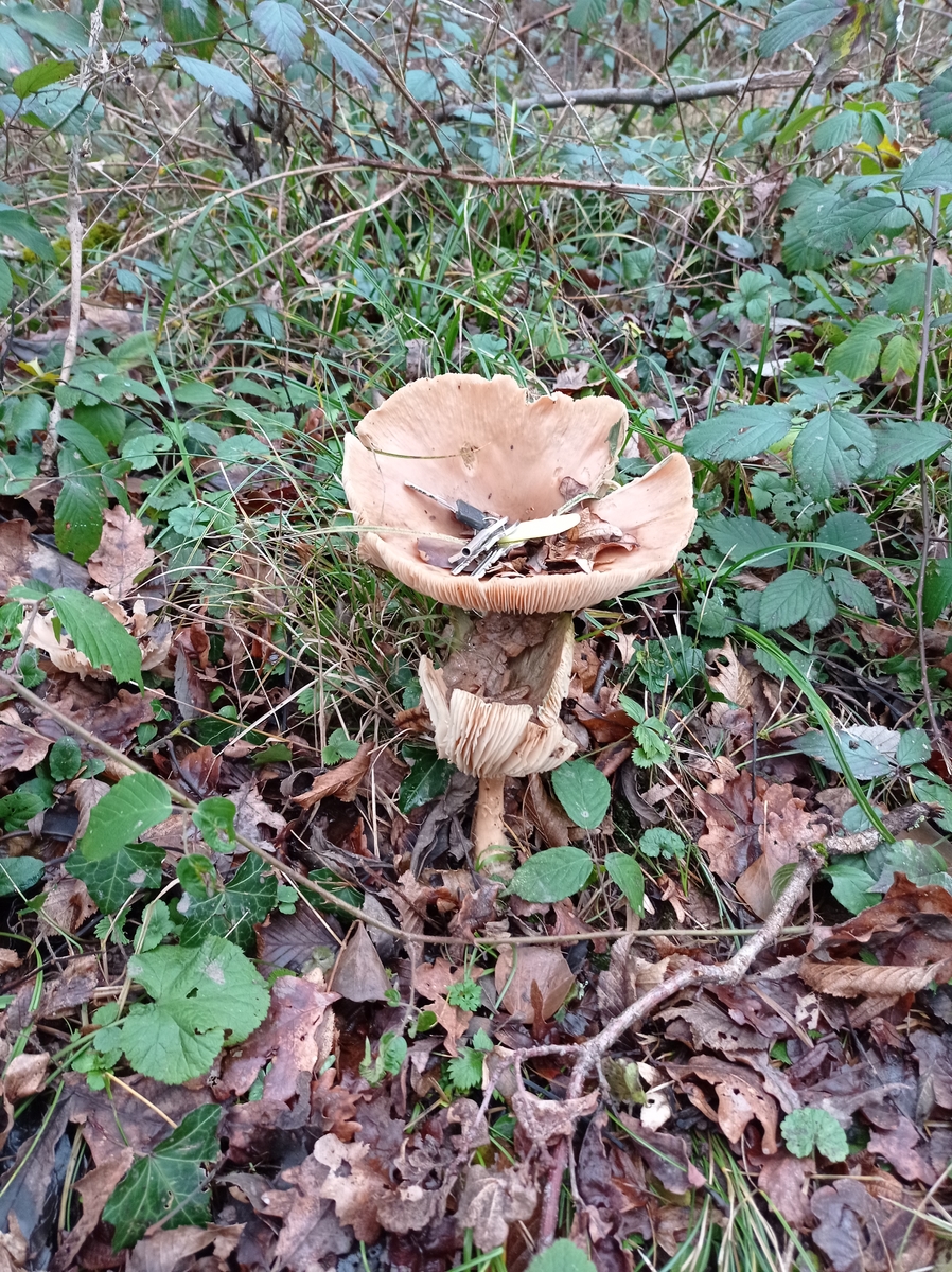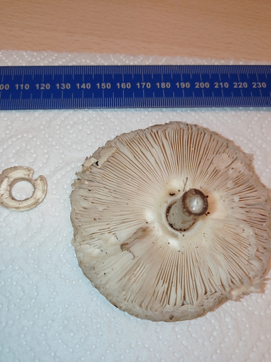 Der Große: Am Wegesrand stand der braune Lamellenpilz. Aufällig groß, zum Vergleich meinen Schlüssel beigelegt. Gerochen und geschnitten hab ich nix, da er mir zu schade und zu alt erschien. Es gibt also nur die Fotos.