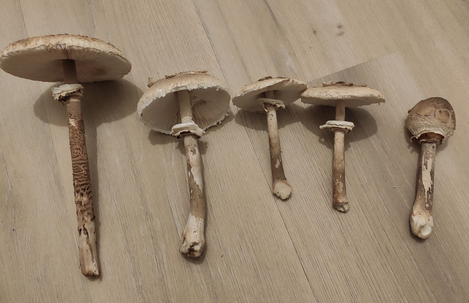 ich denke bei den zuerst gezeigten (1-8) auch an M. rhodosperma. Dafür spricht eben die schwach ausgeprägte Stielnatterung, die geringe Größe und die leicht ablösenden Hutschuppen. Das am Schluß schaut mit den langen genatterten Stielen dann schon nach M. procera aus.
