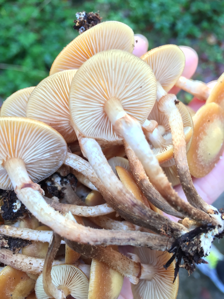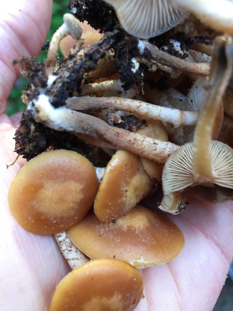 Ich möchte mich gerne auch mit zwei Fotos von unseren heute gesammelten 99%-Stockschwämmchen beteiligen. Die Hüte liegen schon im Dörrautomat, aber bevor wir sie uns schmecken lassen, würde ich gerne noch das OK eines echten Kenners abwarten.