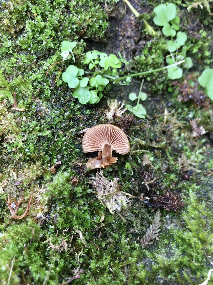 1) Hutdurchmesser ca. 1 cm, trichterförmig, auf stark vermooster Sandsteinmauer wachsend: