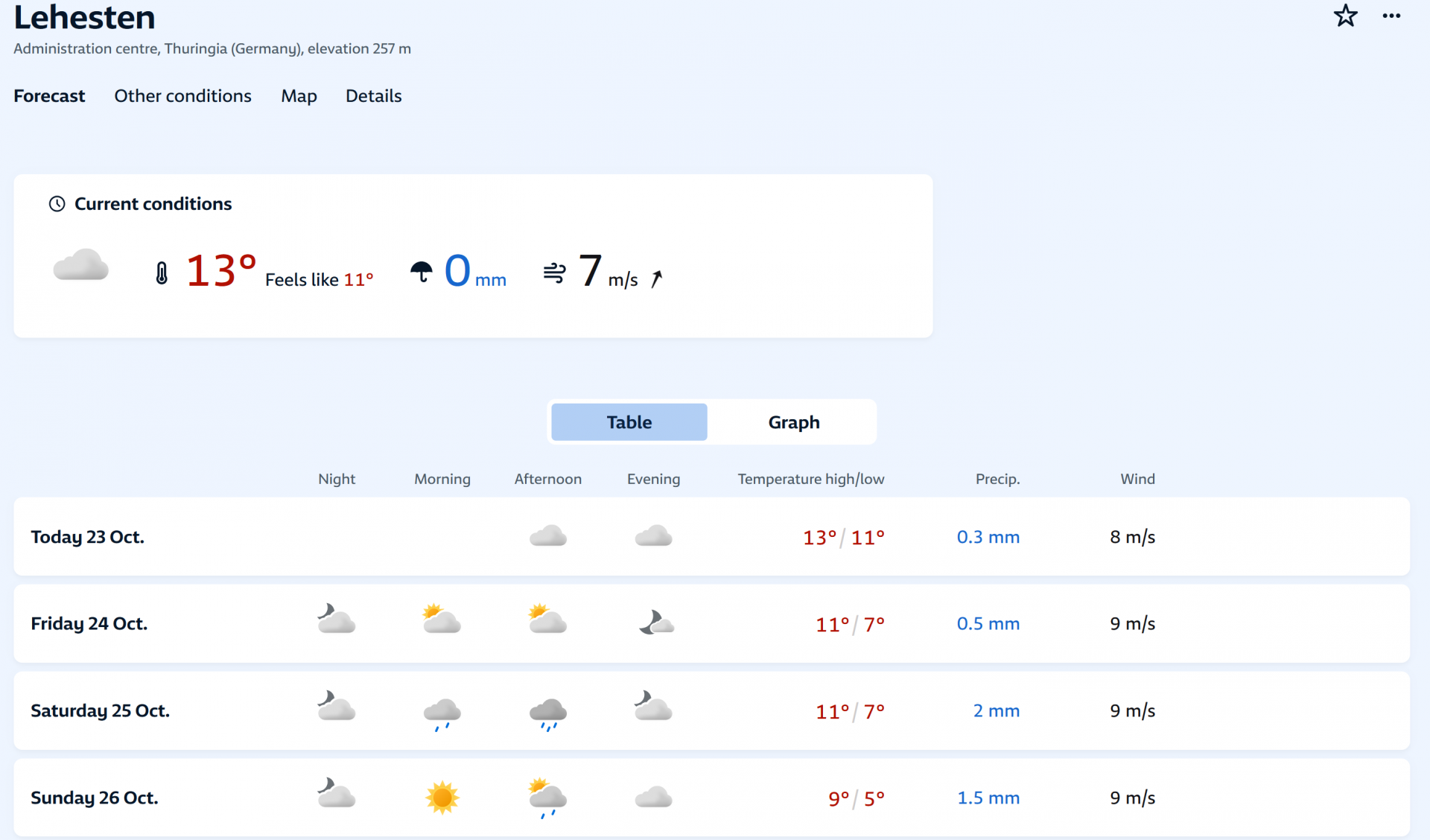 nachdem ich nun weiß, dass es in Thüringen 2 Lehesten gibt, haben wir in „unserem“ Lehesten heute laut YR vormittags Regen.