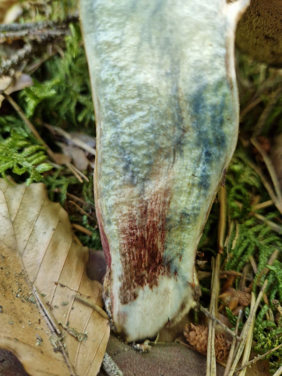 Meine Vermutung war zuerst Wurzelnder Bitterröhrling, aber hier haben wir ein deutliches Stielnetz und eine rote Stielbasis die verjüngt ist. Das wäre für mich neu bei einem WuBi.