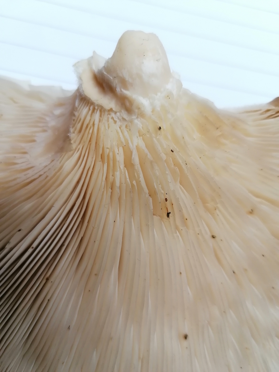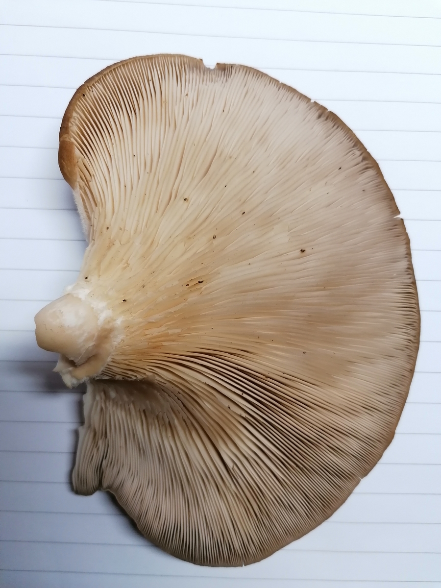 Meine erste Idee wäre der Austernseitling gewesen. Hat jemand einen anderen Tipp? Anbei ein paar Bilder, die hoffentlich helfen. Den Geruch würde ich als angenehm pilzig beschreiben. Beim Sporenpulver kann man in echt sehr zarte Rosatöne erkennen