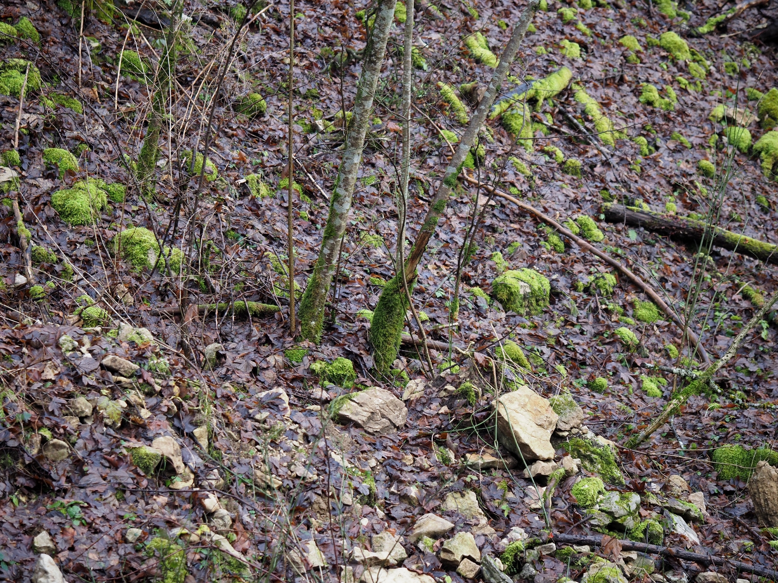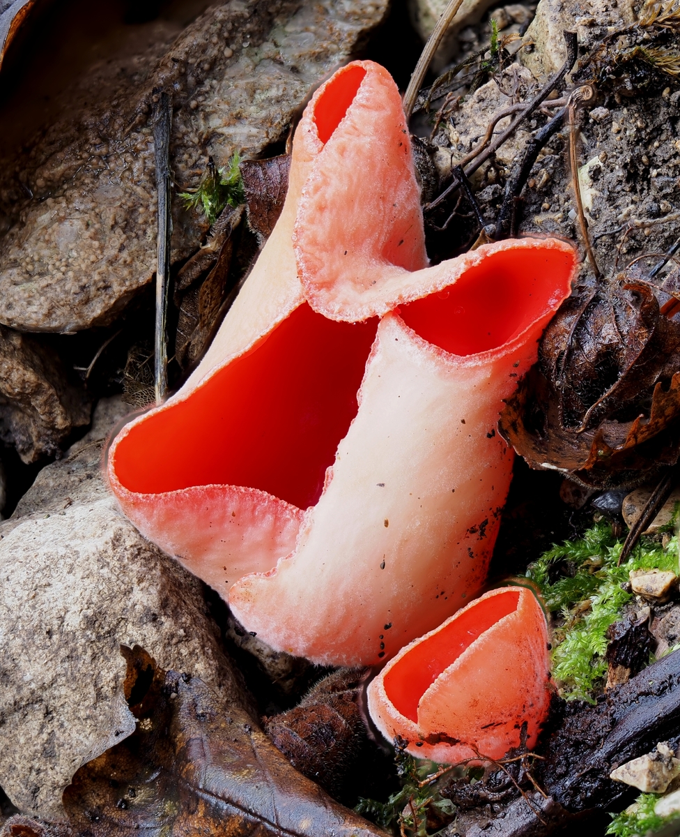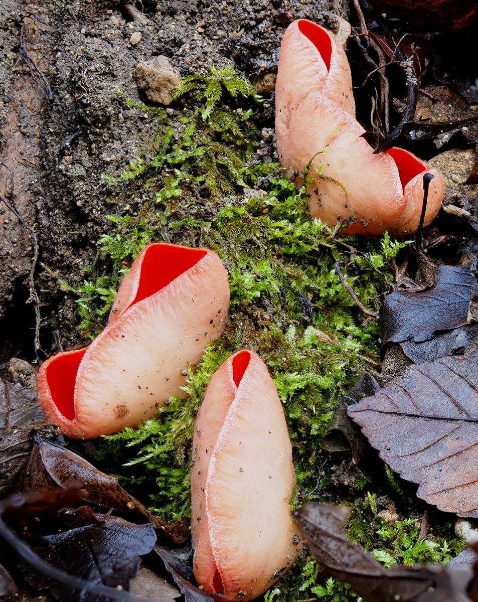Jedenfalls konnte man ohne sich gross anzustrengen beim Bergan laufen viele FK aus Distanz anschauen und die schönsten Fotomotive aussuchen. Ich kannte die Stelle schon vom Februar 21 und sie wird von vielen Mykobegeisterten gerne besucht da es sich um ein schönes Habitat handelt mit dem Kalkschotter und den farbigen Bechern am Hang.