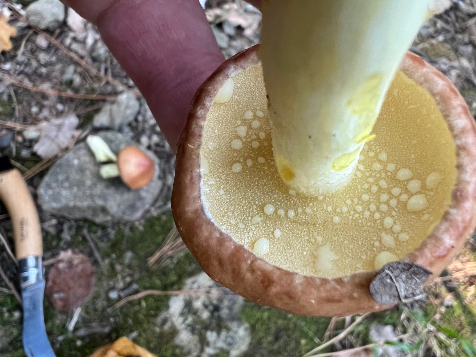 habe heute im Garten unseres Urlaubsdomizils in der Nähe von Nantes diesen Pilz gefunden. Standort parkähnlich zwischen Kiefer und Kastanie, Wiese, Splitt. Sehr festfleischig, Stiel voll, fleisch nicht verfärbend. Stiel bricht wie bei einem Täubling, Lamellen sind aber recht biegsam und geschmeidig und splittern erst bei größerem druck. Interessant finde ich auch die Gutation. Kann die theoretisch bei jedem Pilz auftreten?