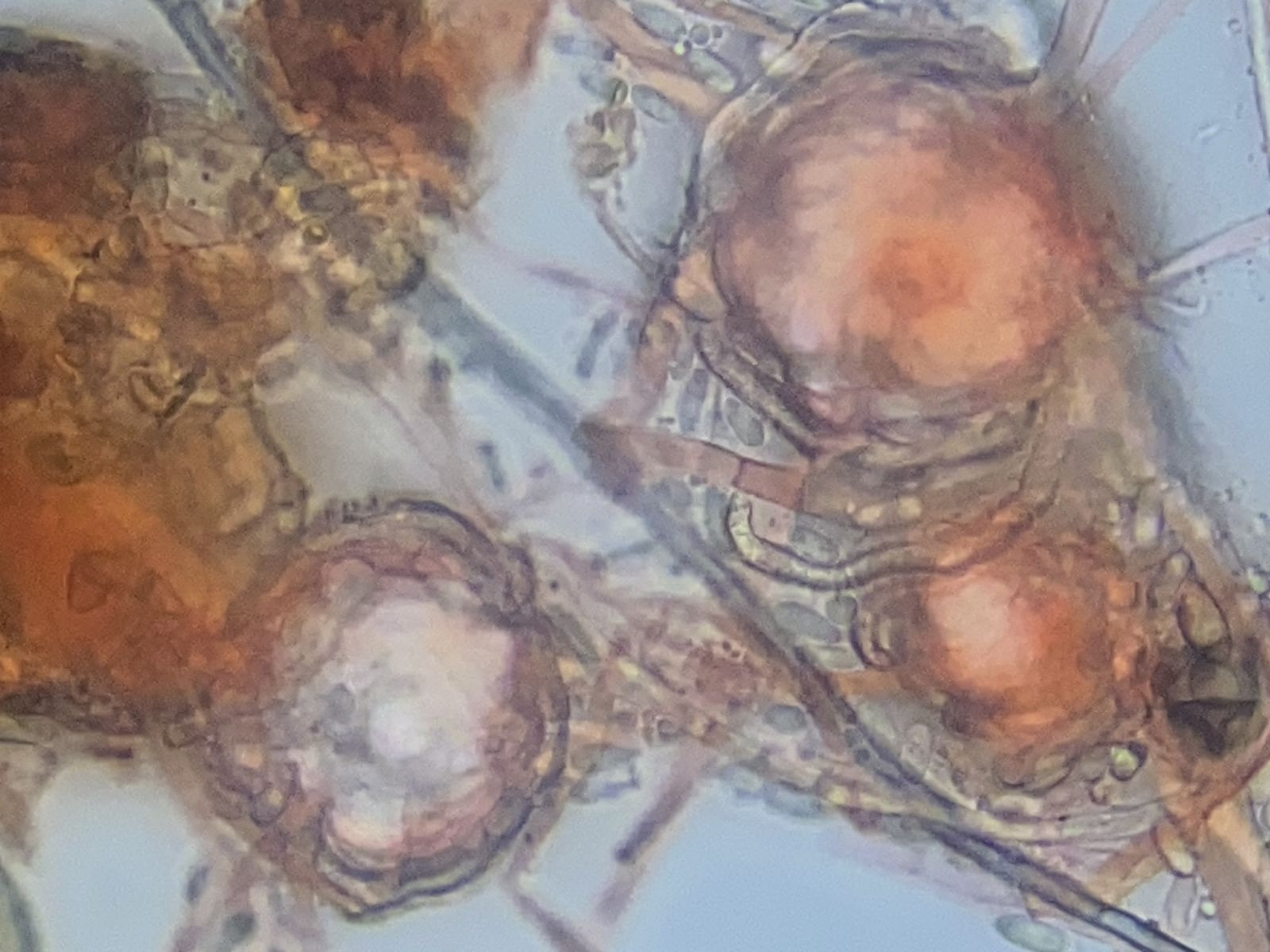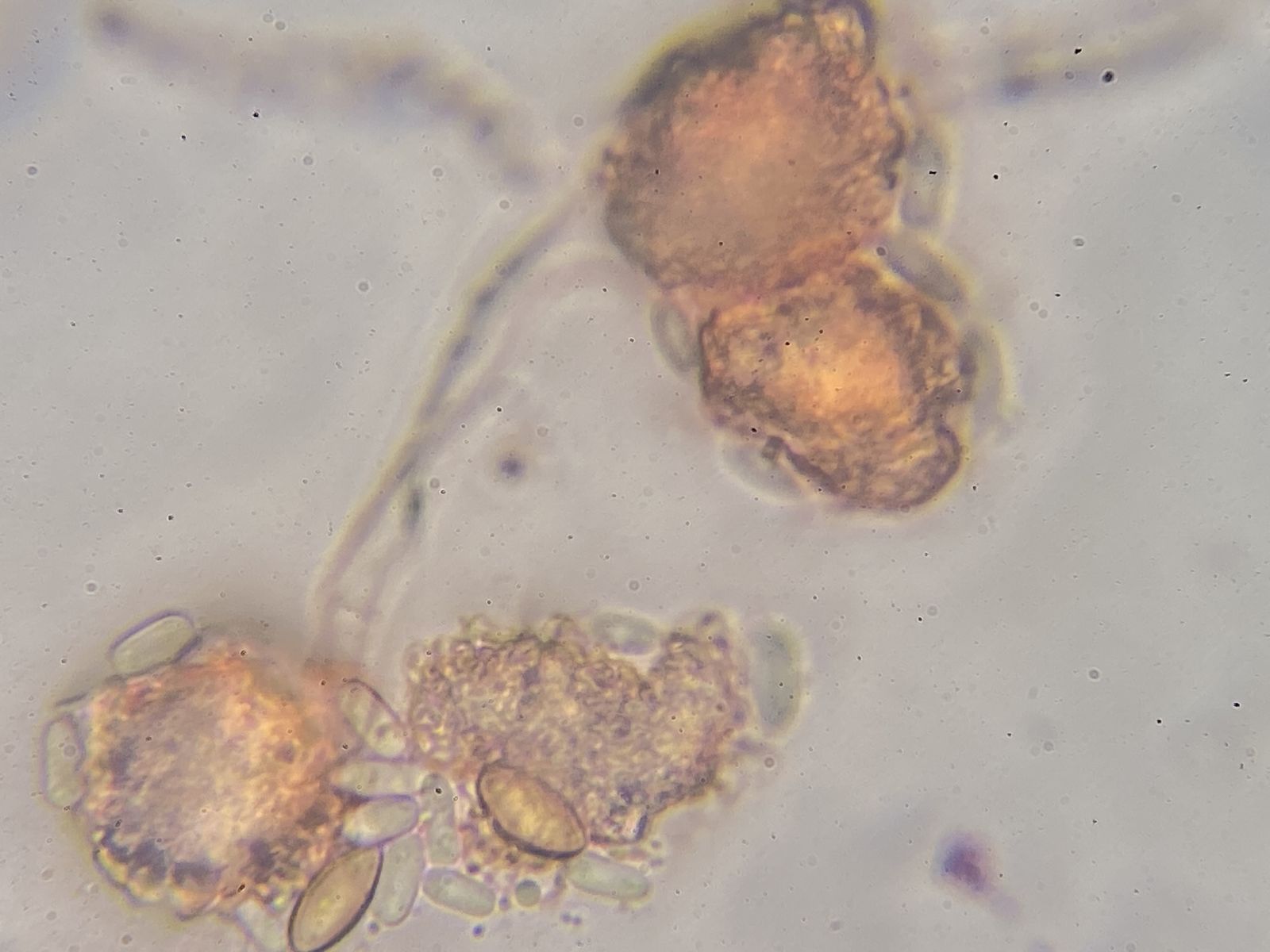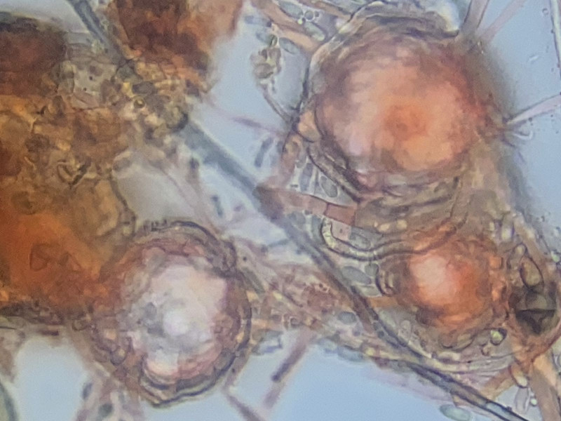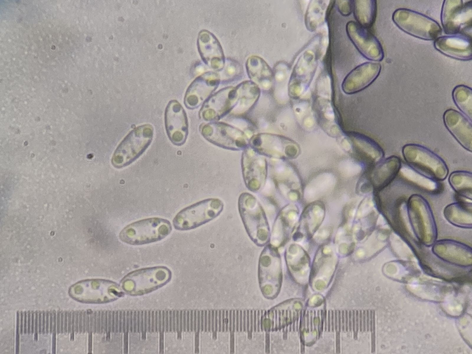 2) Das dürfte in Richtung Penicillium oder gar Flahaultiella gehen. Interessant sind die ameromorphen Sporen (9-10 x 5-6 µm). Diese zeigen zwei jeweils endständige Guttulae. Mit Baumwollblau färben sich die Umrisse und der Steg in der Mitte zwischen den beiden Guttulae, was man als didymomorph fehlinterpretieren könnte. Aber ich denke eher, dass sich hier ein anderer Gattungsname finden lässt.