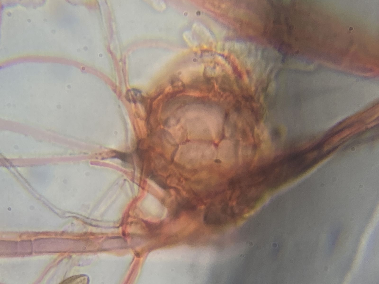 ich denke, dass es sich bei den Hyphopodien um die Gattung Clasterosporium (C. caricinum) handelt. Bei Ellis (Microfungi of land plants, Abb. 1989, Text S. 535) ist diese Art beschrieben. Es wird auf nasses Gelände verwiesen und die passenden Konidien fand ich in den Proben auch. Ebenfalls bei Seifert et. al. (Abb. 241A) sind Hyphopodien bei dieser Art skizziert. Bem meinem zweiten Foto hier kann man sogar schemenhaft die Hyphopodien erkennen.
