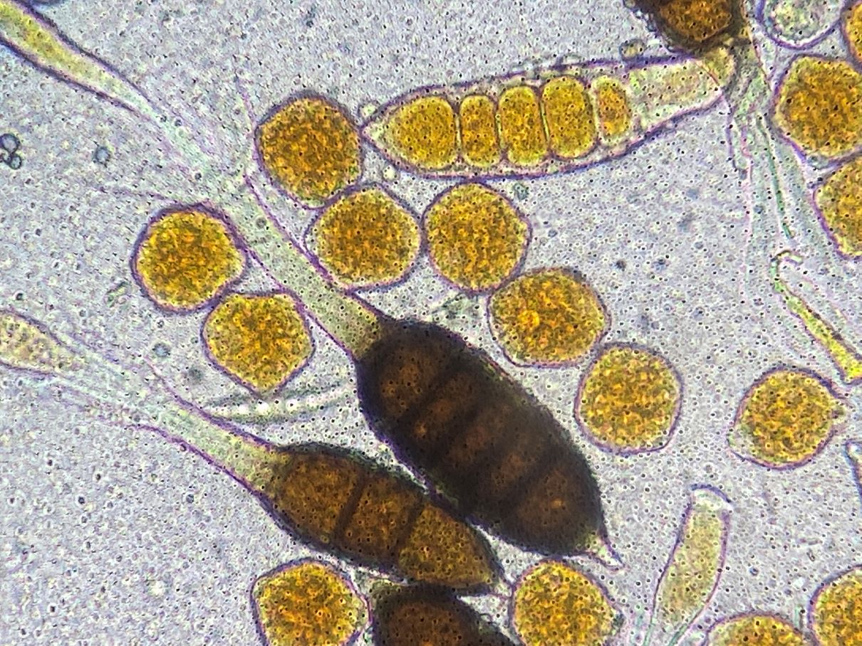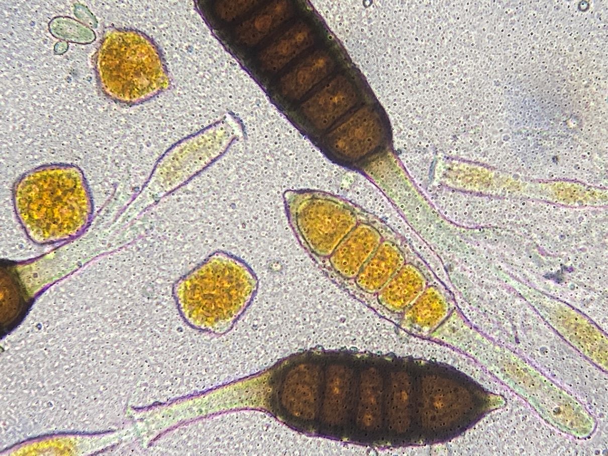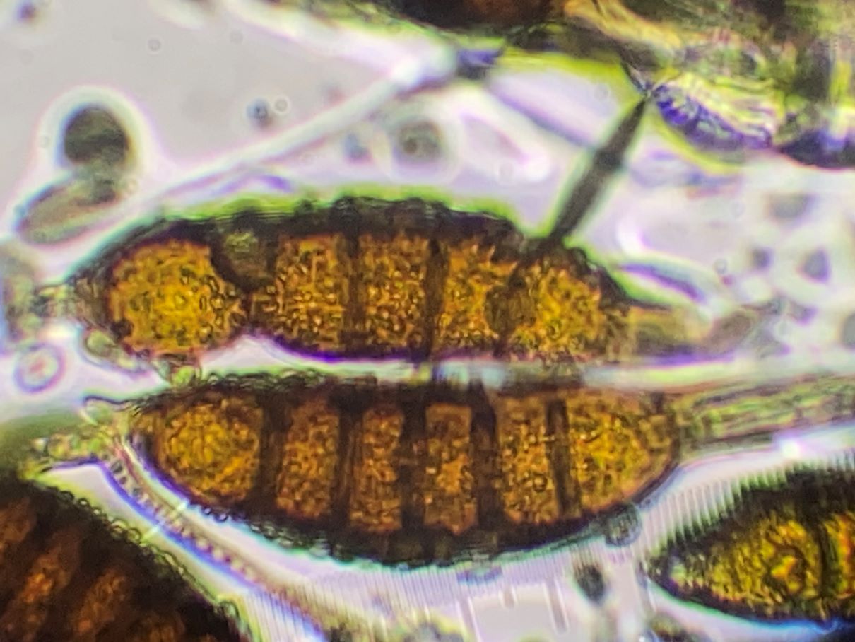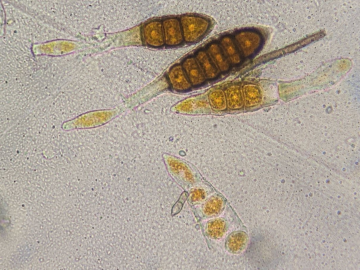 Aber daneben waren auch noch andere, auf dunklem Untergrund kaum zu sehende interessante Pilze mit dunkelbraunen Seten und hyalinen, sichelförmigen Konidien. Diese identifizierte ich als Rattania sp. (2). Mein Problem mit dieser Bestimmung ist, dass sie nicht mit der Beschreibung bei Seifert et. al. (Eine Species in Indien nachgewiesen) übereinstimmt . Zudem sah ich auch die Anhängsel (polar setulae) an den Konidien nicht.