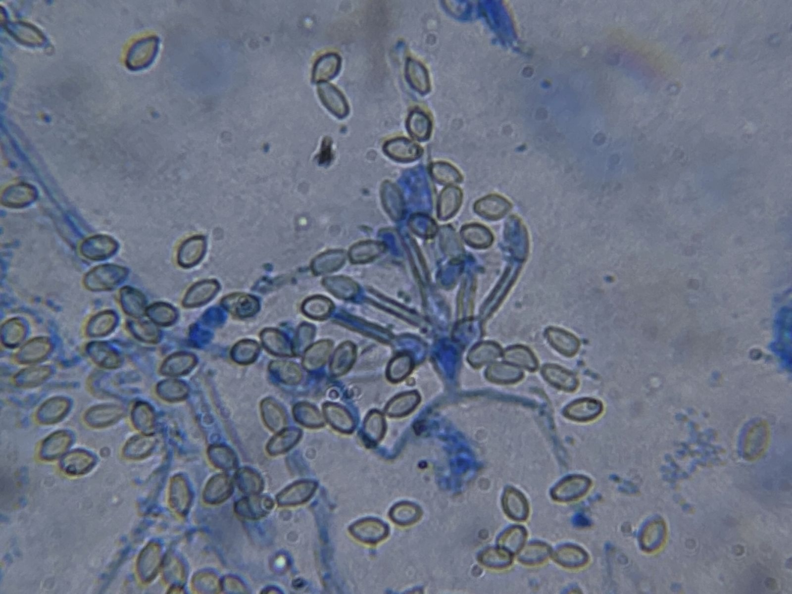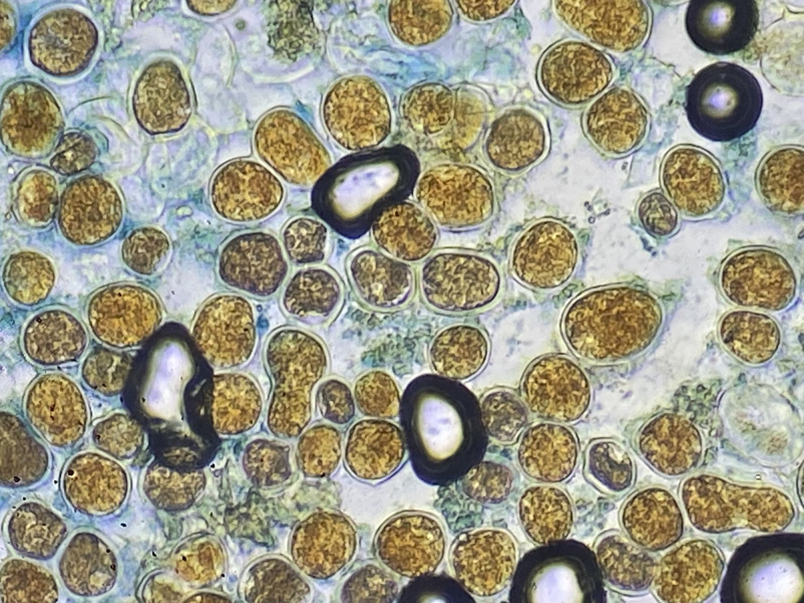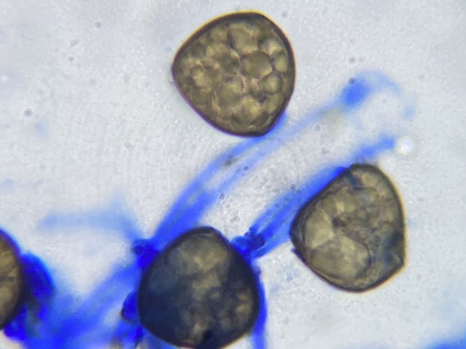Nr. 2 zeigte sehr viele kugelige Sporen/Konidien mit kurzen Stielchen an nicht gegabelten Endhyphen, wie ich es ähnlich vom Geweihförmigen Schleimpilz (Ceratiomyxa fruticulosa) kenne. Allerdings waren die Sporen mit ca. 3-5 µm (Stiele ca. 1 x 1,5) kleiner als dort.