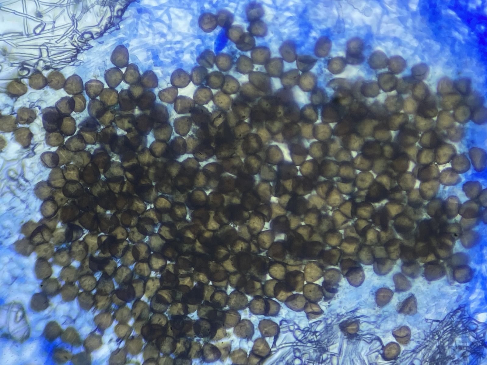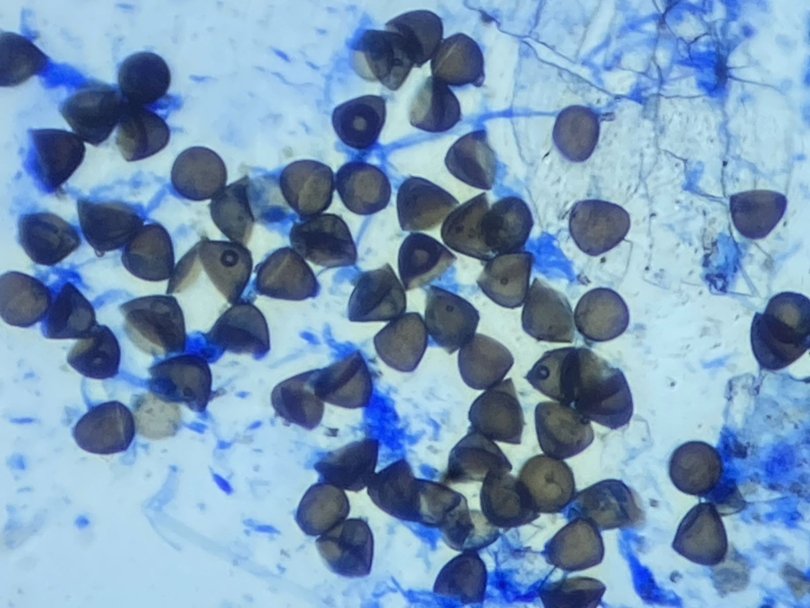 an Bambusstielen fand ich diese Sporen/Konidien - allerdings ohne überzeugende Hyphenstränge. Wenn ich einen Namen hätte, könnte ich gezielter nach mehr suchen. Die Konidio/Ascosporen bilden gemusterte Dreiecke, die sich beim Trocknen zu Hütchen verformen. Sie sitzen an kurzen Stielchen, die an der Hütchenspitze ansetzen, Oft sind Massen davon zu sehen, als ob sie aus Ascomata kämen. Die Maße sind ca. 20 x 18 µm. Hat da jemand einen Namen?