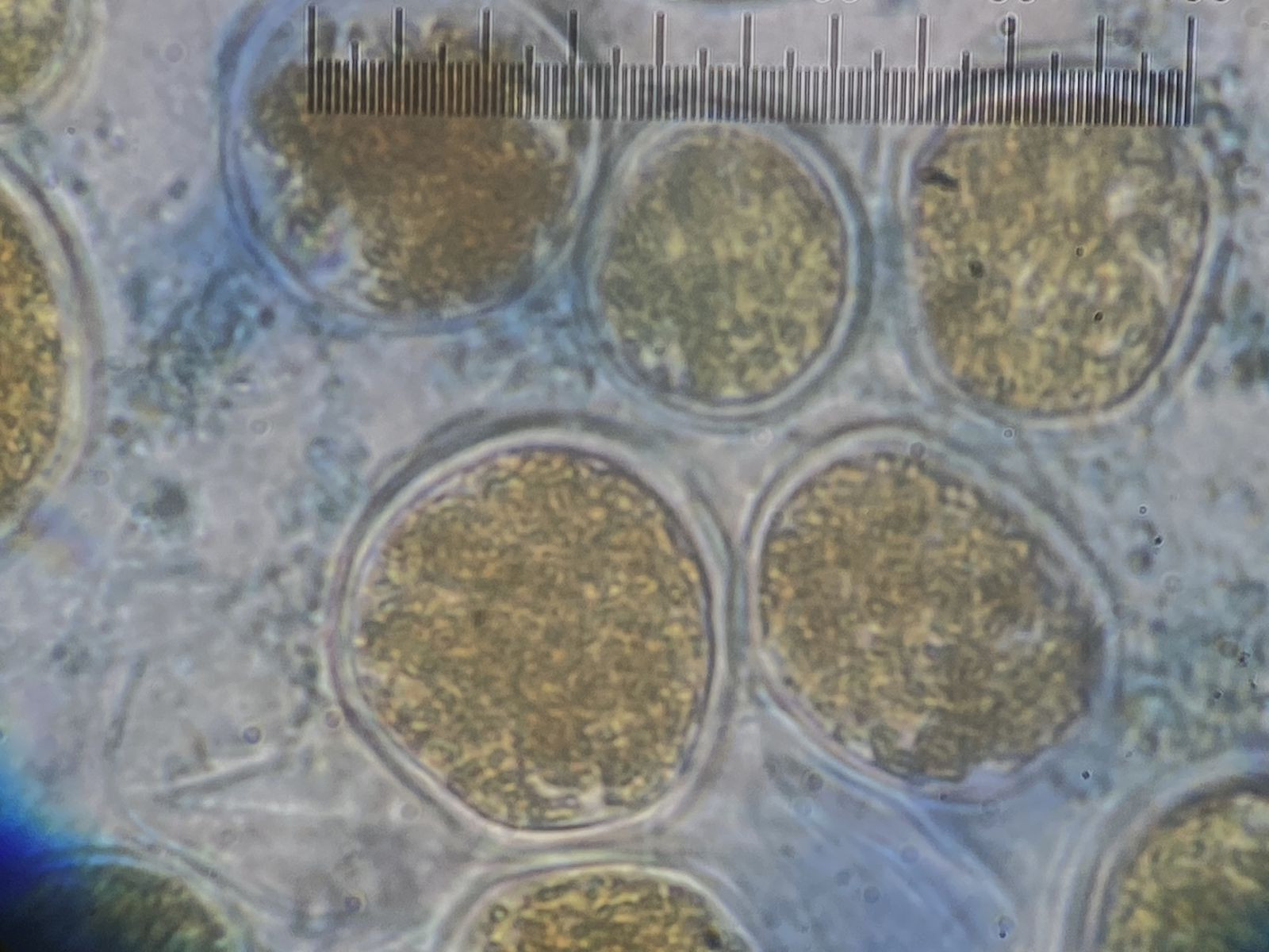 Mir ist ein Irrtum unterlaufen. Sorry. Ich fotografierte zwar die Sporen mit 100 x 10, aber die Asci waren zu groß dafür. Also nahm ich 20x10. Dennoch wertete ich mit der Tabelle von 100x10 aus. Meine Nachmessung ergab nun viel größere Maße für Asci und Paraphysen. Somit sind diese für Iodophanus carneus stimmig.