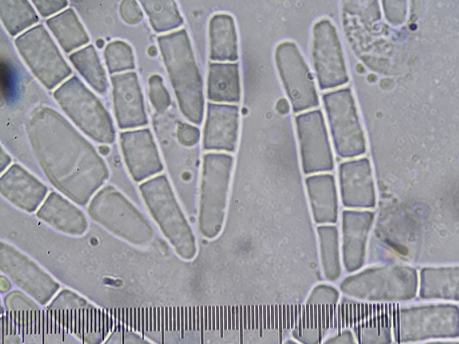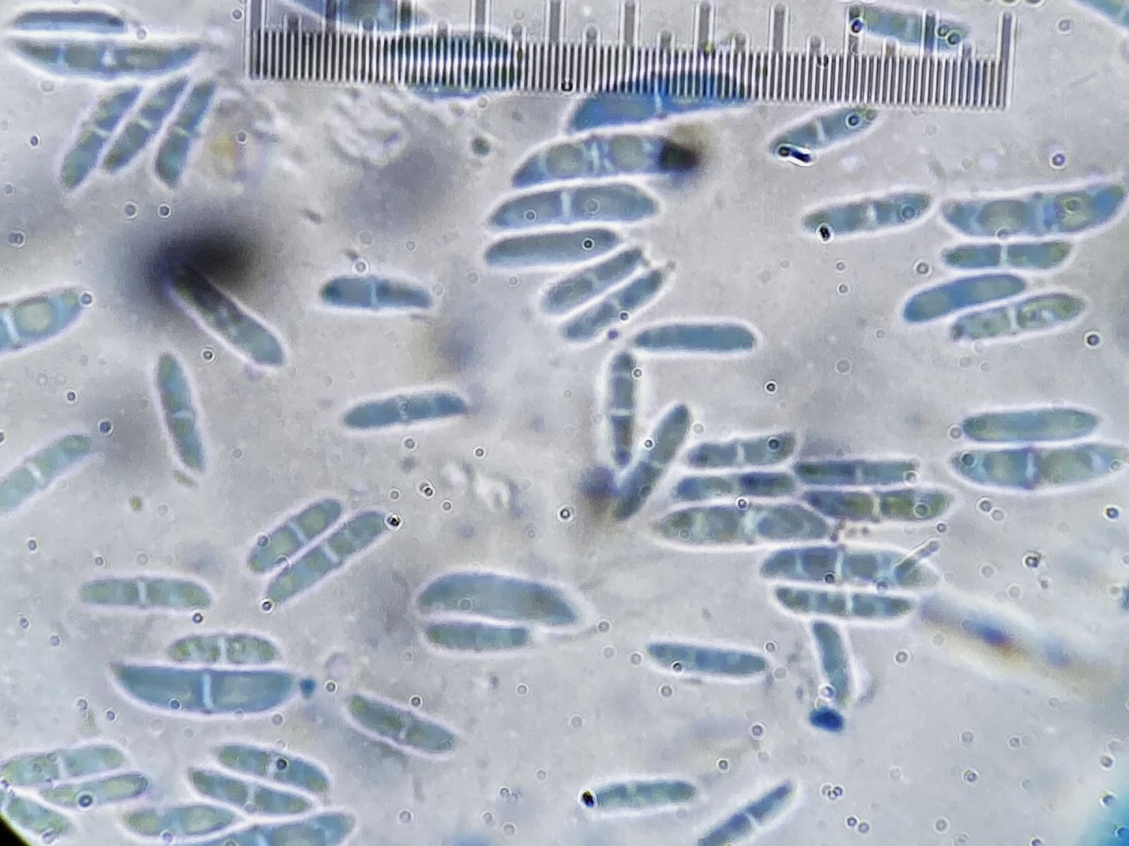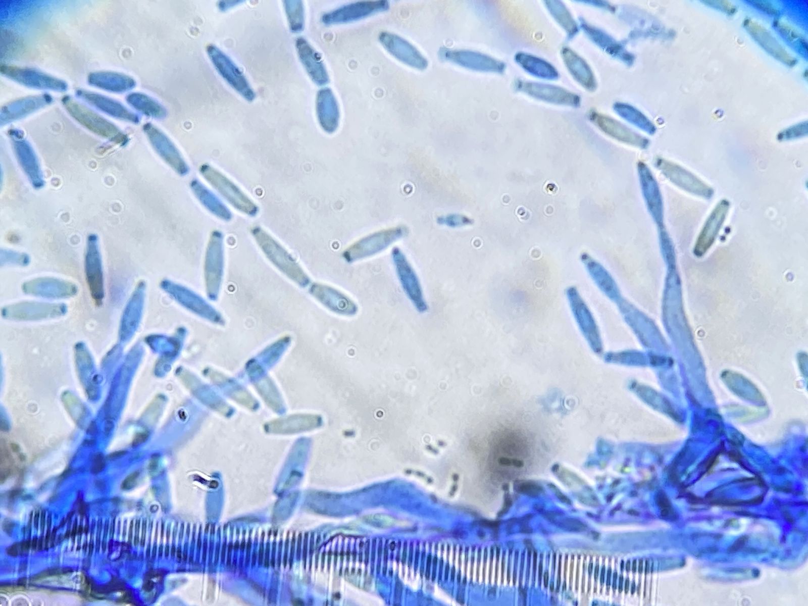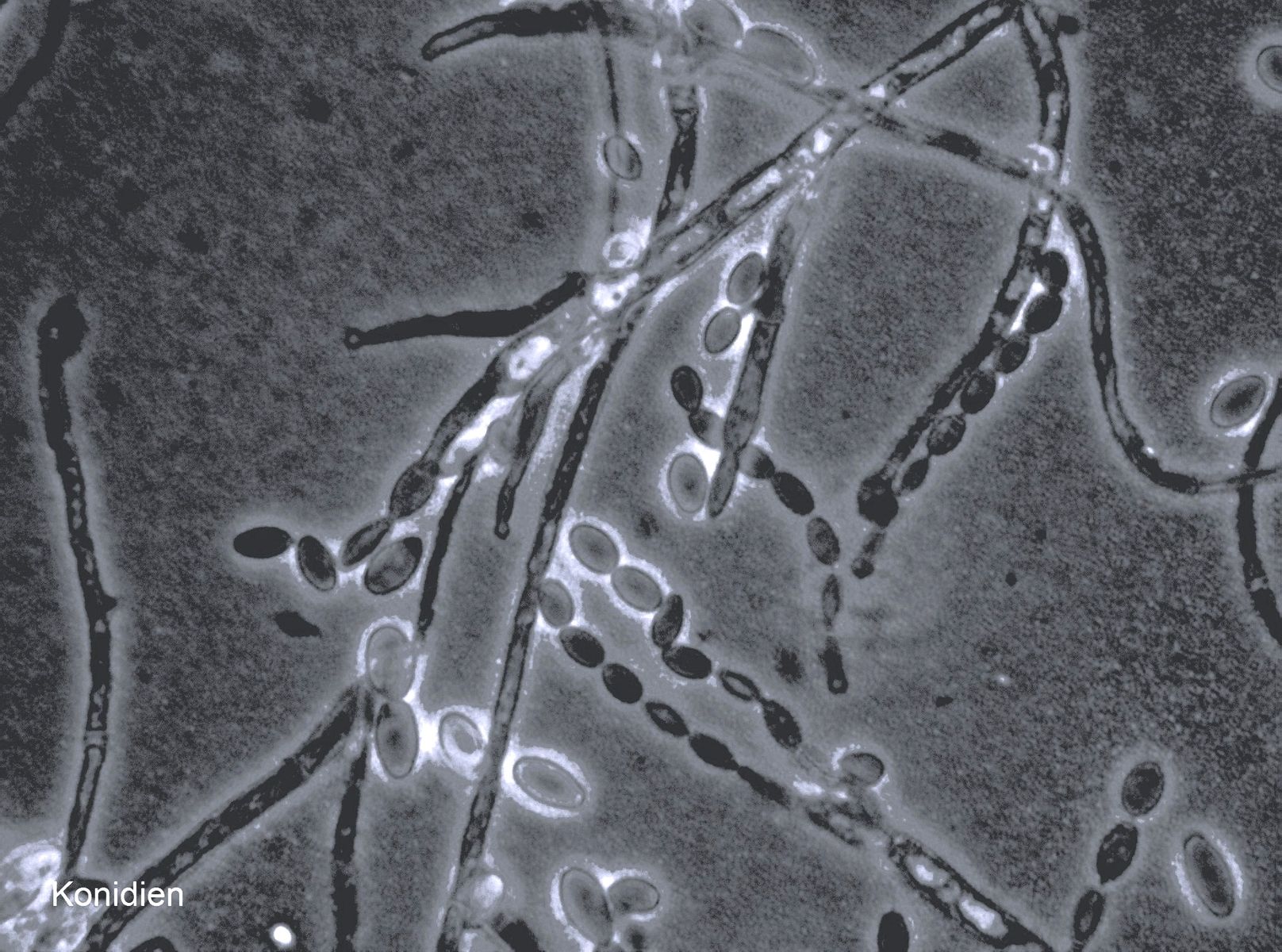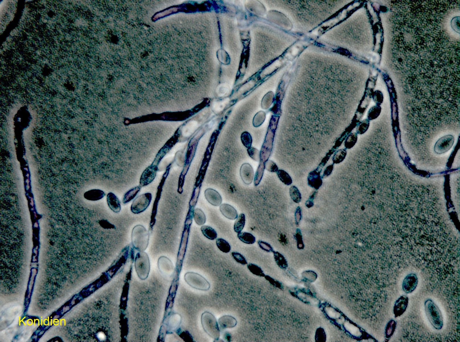 + Konidien hyalin, daher färbbar mit Baumwollblau + Milchsäure)