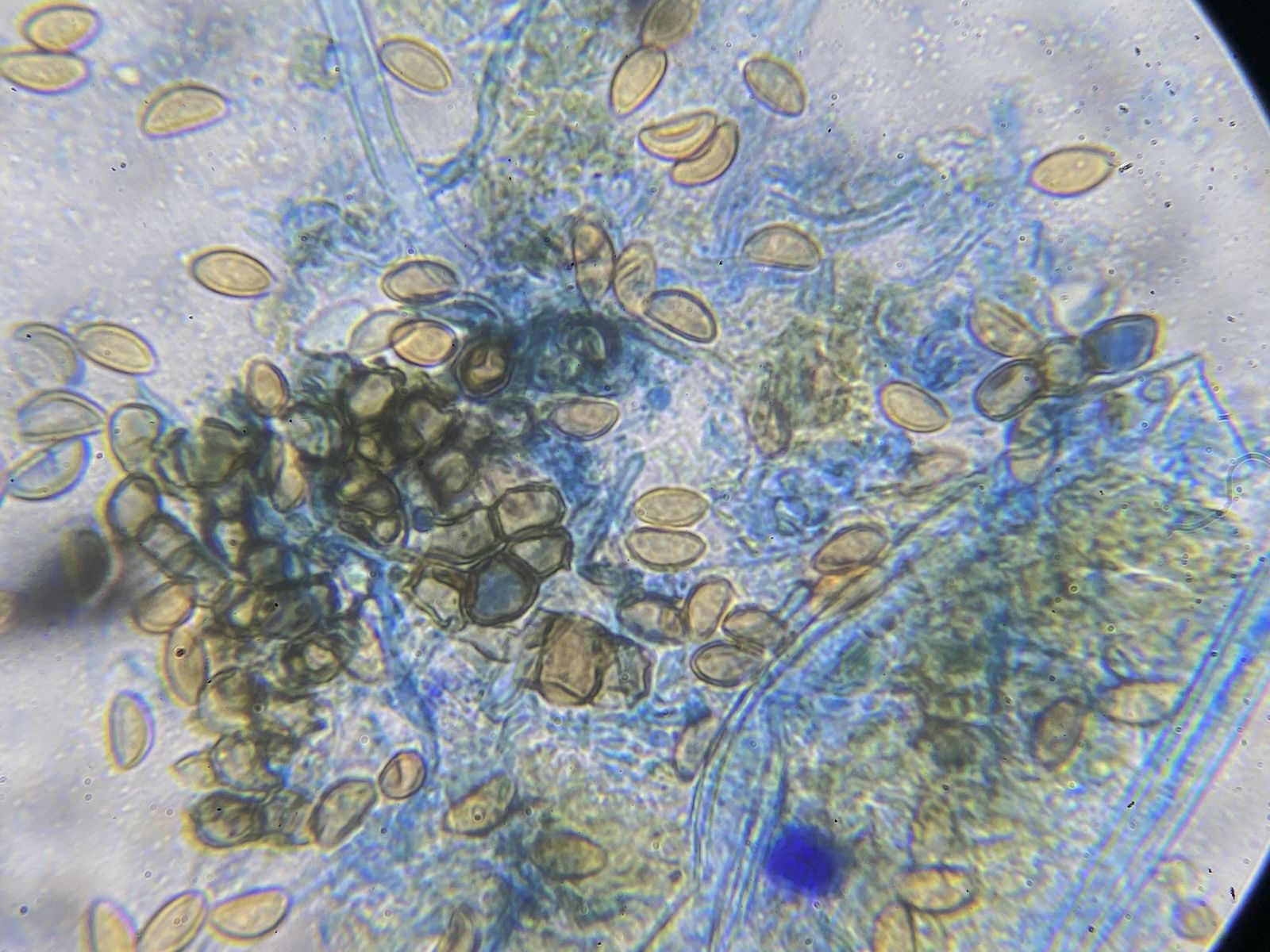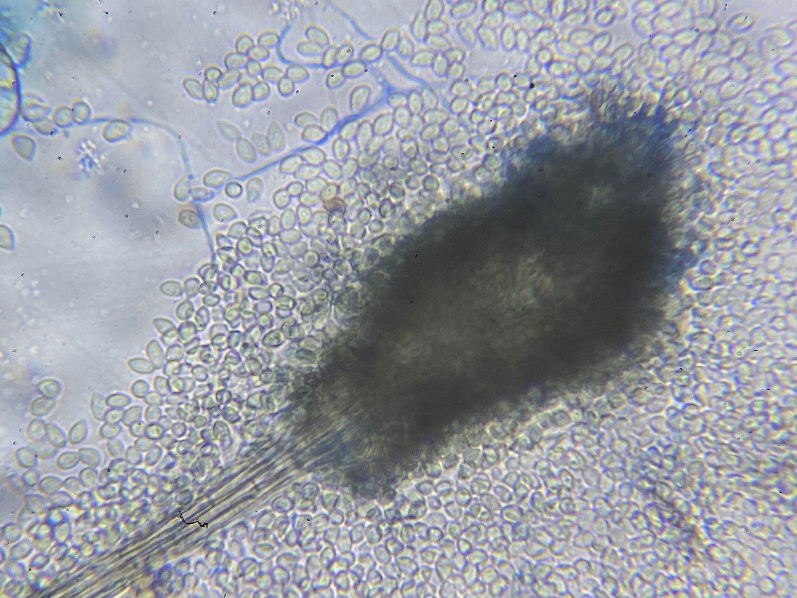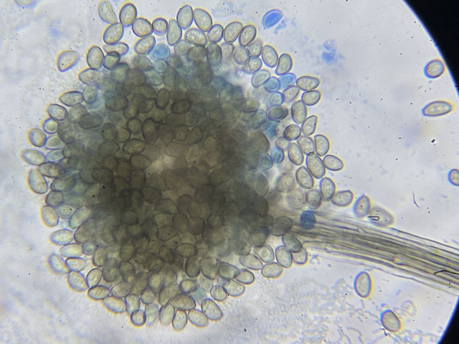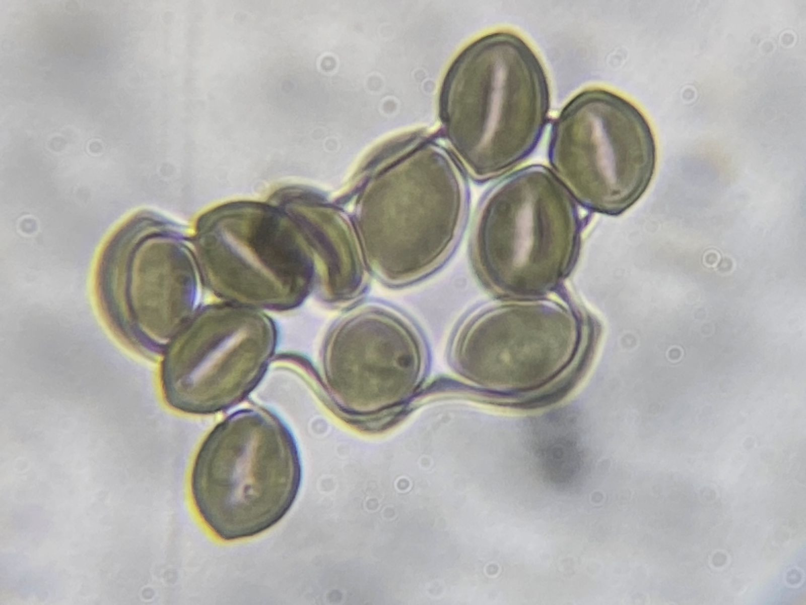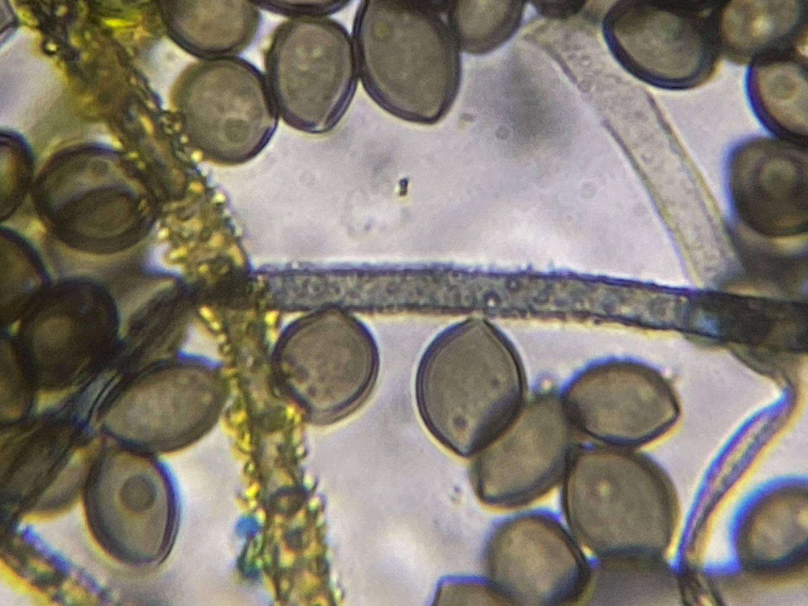 es lässt sich leider nicht immer vermeiden, dass man in einem Präparat auch noch Fremdkonidien hat. Aber das sollte nicht von dem Kern ablenken. Ich nehme an, dass Du schon erkennst, auf was es mir ankommt. Ich könnte auch noch das Foto so bearbeiten, dass die Fremdobjekte gelöscht werden. Aber das ist etwas aufwändig. Für eine Publikation würde ich den Aufwand schon betreiben. Aber nachdem meine letzten Anfragen ohne Bestimmungserfolg blieben..... Ich bleibe optimistisch! Die braunen Kugeln bitte einfach ignorieren!! Der Pilz wuchs auf Pflanzenmaterial - ist das hilfreich?