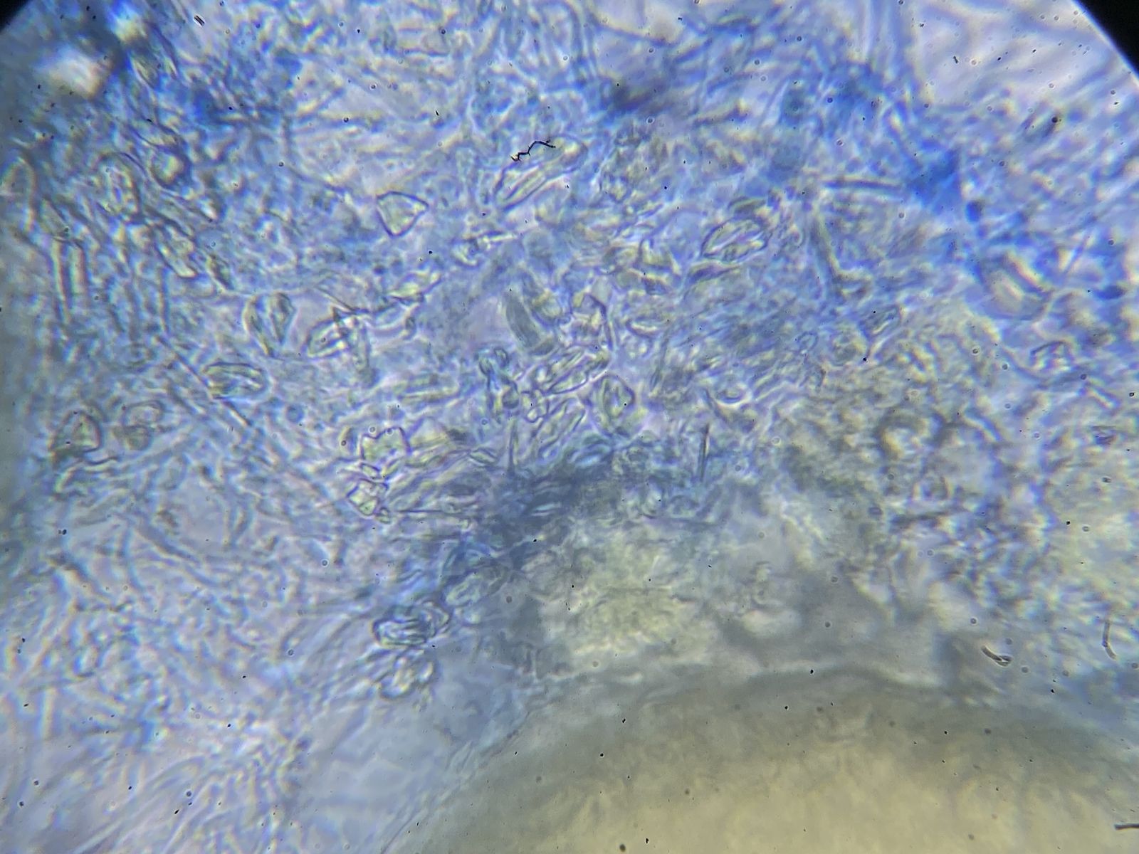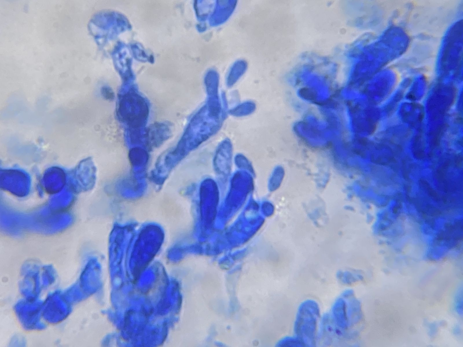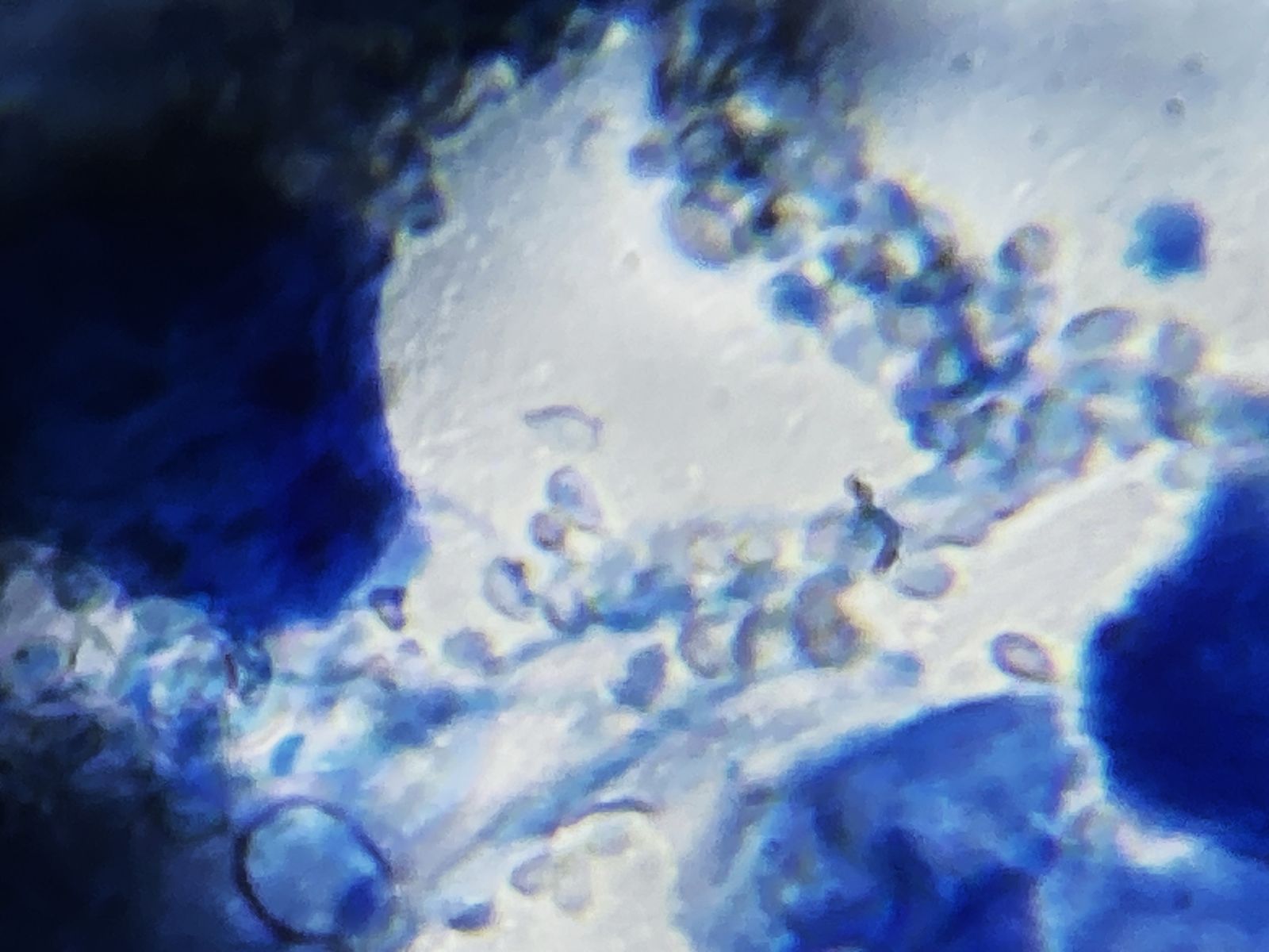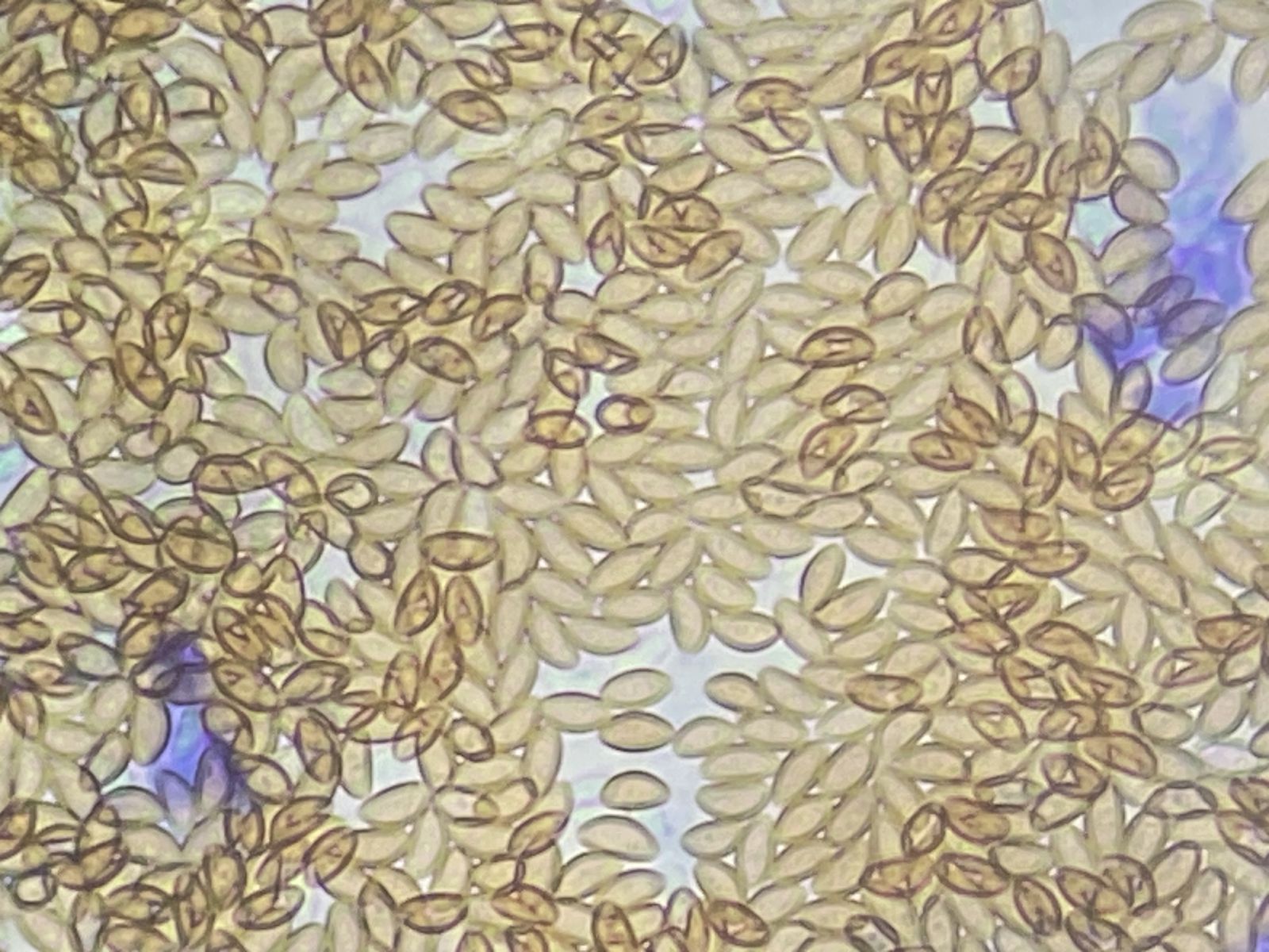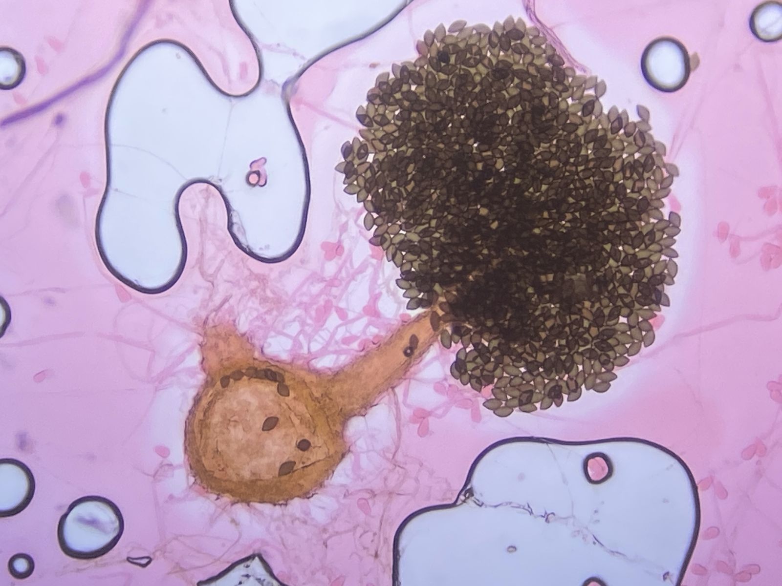 es lässt sich leider nicht immer vermeiden, dass man in einem Präparat auch noch Fremdkonidien hat. Aber das sollte nicht von dem Kern ablenken. Ich nehme an, dass Du schon erkennst, auf was es mir ankommt. Ich könnte auch noch das Foto so bearbeiten, dass die Fremdobjekte gelöscht werden. Aber das ist etwas aufwändig. Für eine Publikation würde ich den Aufwand schon betreiben. Aber nachdem meine letzten Anfragen ohne Bestimmungserfolg blieben..... Ich bleibe optimistisch! Die braunen Kugeln bitte einfach ignorieren!! Der Pilz wuchs auf Pflanzenmaterial - ist das hilfreich?