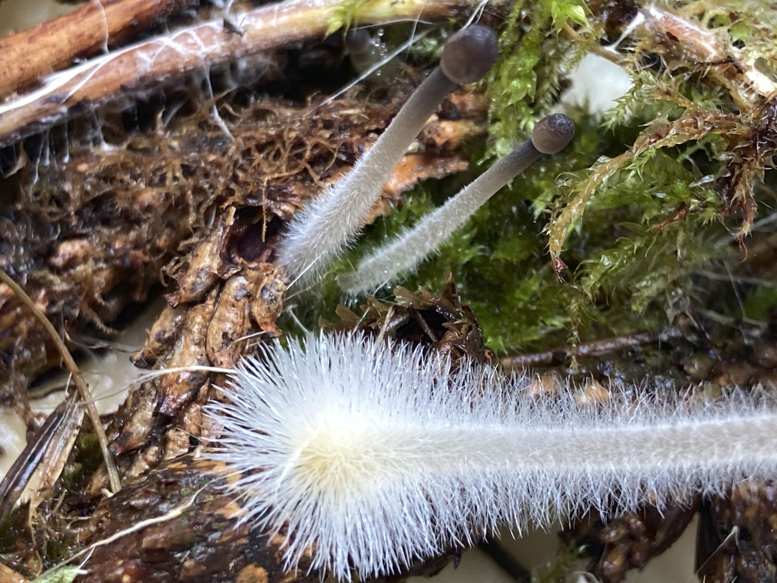 Könnte das eine Crinula sp. sein. Oder evtl. eine Stromatographium sp. Oder Arthrobotryum sp. etc. Jedenfalls kein Schleimpilz der Art Comatricha nigra, schon wegen der Konidien/Sporenform. Evtl. sind auch weiße und schwarze Köpfen jeweils etwas anderes.