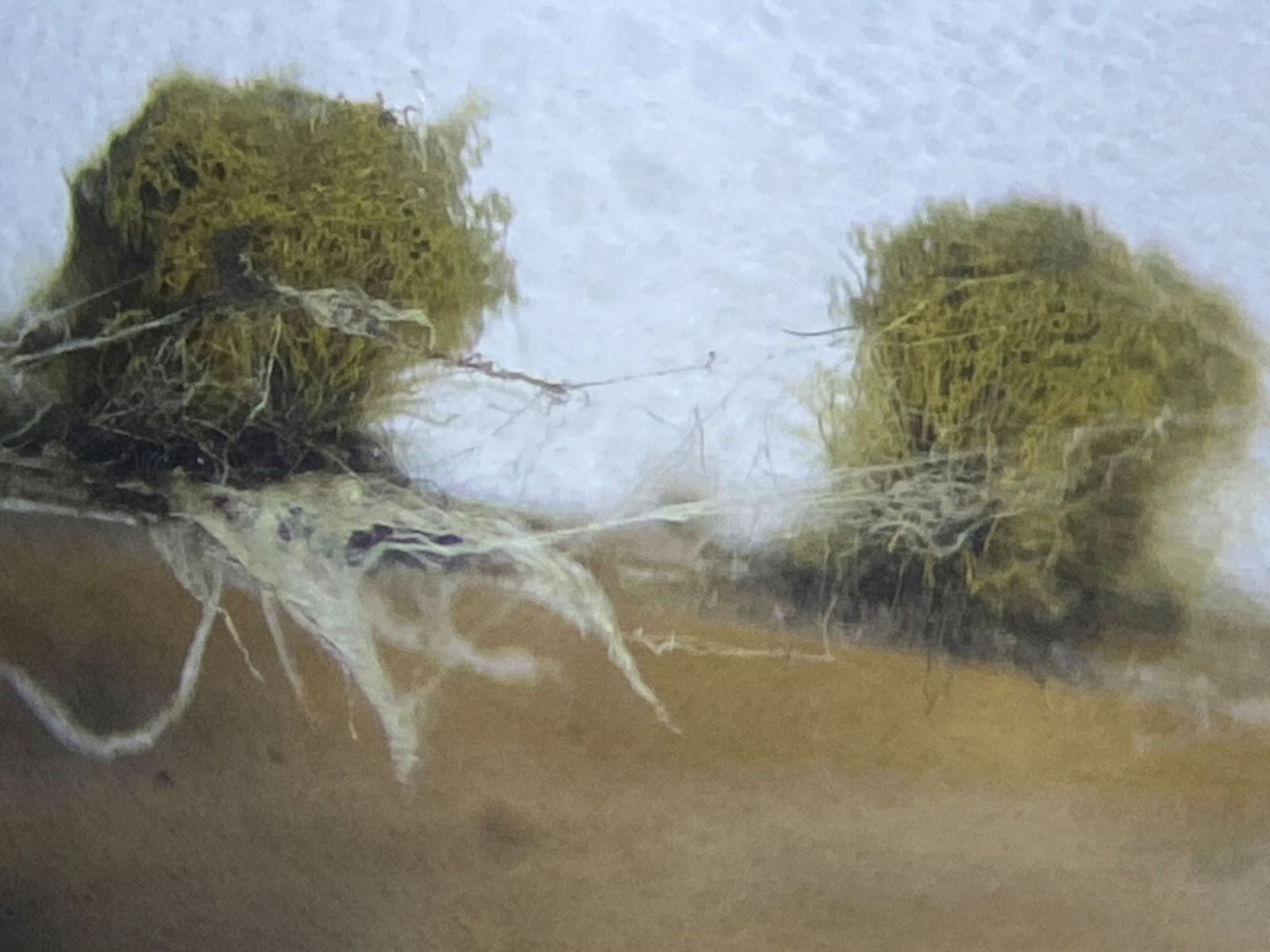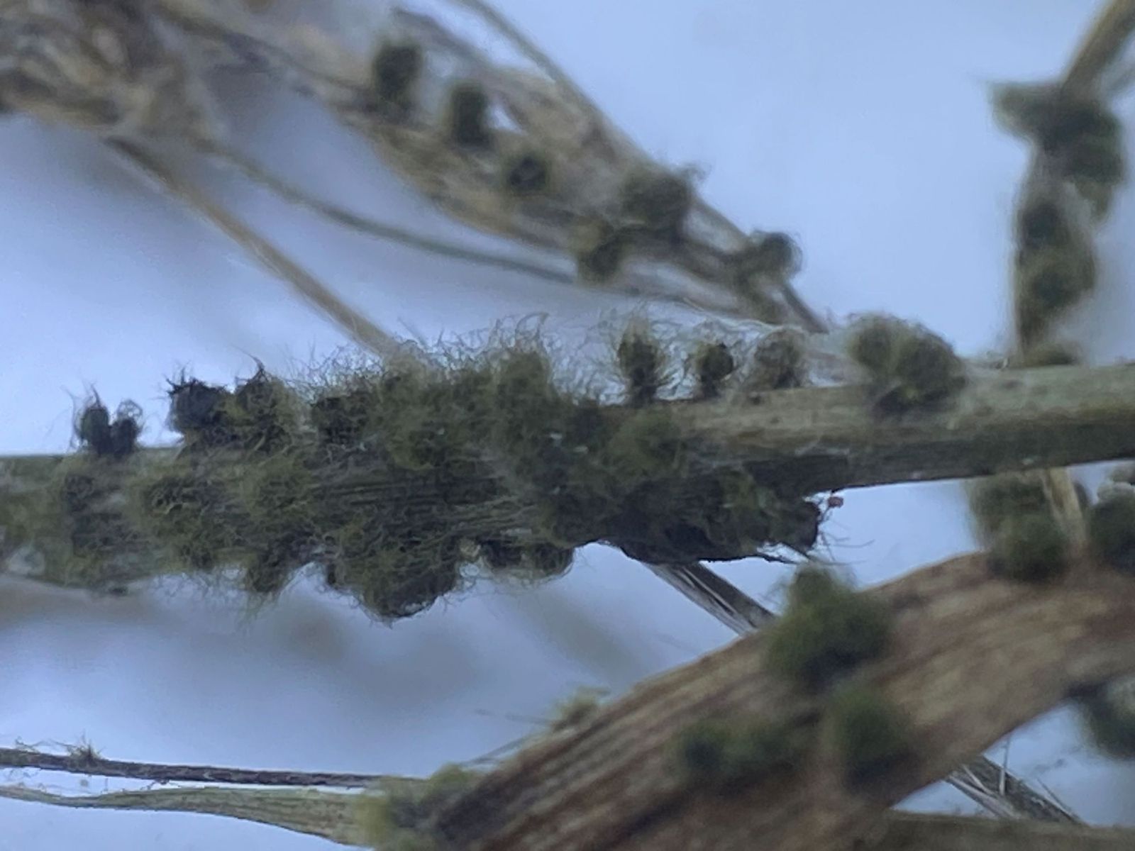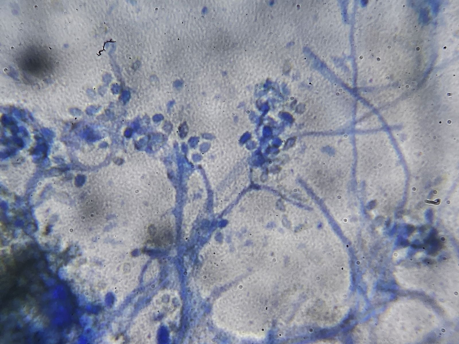 was meint Ihr zu dem Isolat von einer Weißdornblüte. Meine Bestimmung beruht auf der wedelartigen Makrostruktur, den braunen Synnemata-Hyhen und den tropfenförmigen hyalinen Konidien (3-3,5 x 2-2,5 µm). Allerdings konnte ich keine Konidienträger (CGC) sichtbar machen; ich habe dagegen den Eindruck, dass die Konidien direkt an den Hyphensträngen entspringen. Aber ich kann auch mit der Bestimmung völlig falsch liegen, daher meine Anfrage.