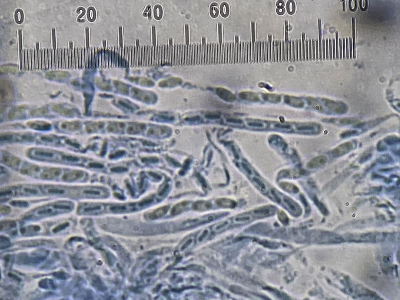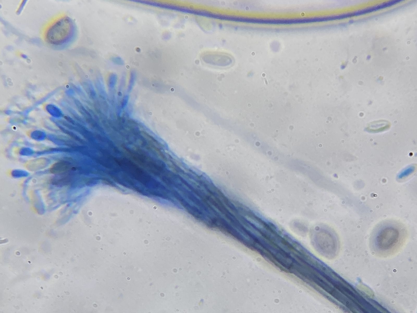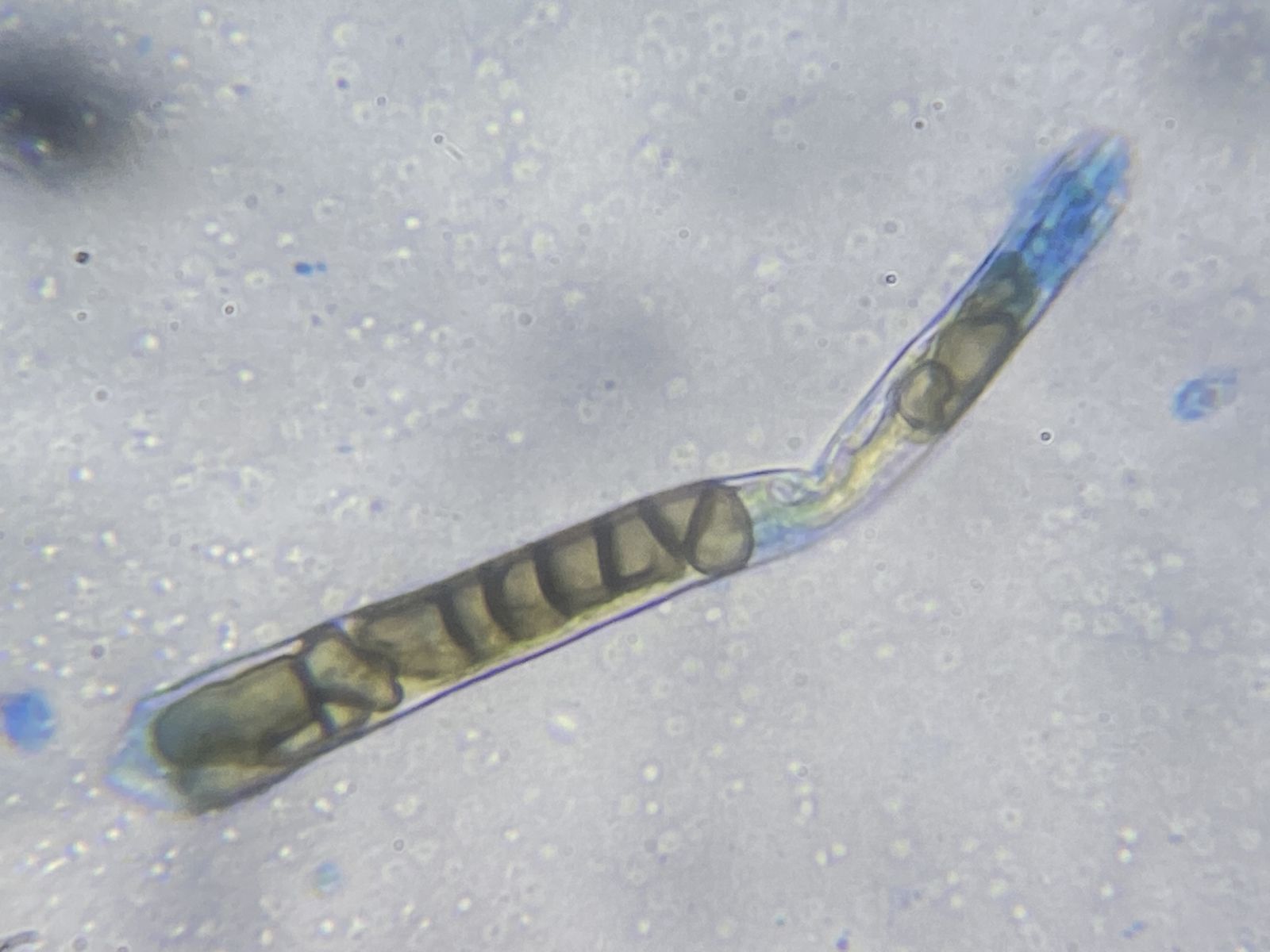 Sind denn die Kammerungen bei den Konidien nicht auf Septen zurückzuführen. Wenn das so wäre, müsste ich völlig umdenken. Ja es war Baumwollblau. Das Substrat waren Rapsstängel. Auswüchse an den Konidien waren nicht zu sehen. Ich hatte kürzlich den Fall, dass ich ein Präparat machte, es aber erst am nächsten Tag ansehen konnte. Da hatten viele Konidien bereits Keimschläuche ausgebildet. Aber das wirst Du wohl nicht meinen. Könnte KOH die Linse bei Kontakt schaden? Ich vermute, mein günstiges Mikroskop aus China hat Kunststofflinsen. Ich musste schon mal ein Objektiv wegen Kratzern ersetzen. Auswüchse an den Hyphen sah ich nicht.