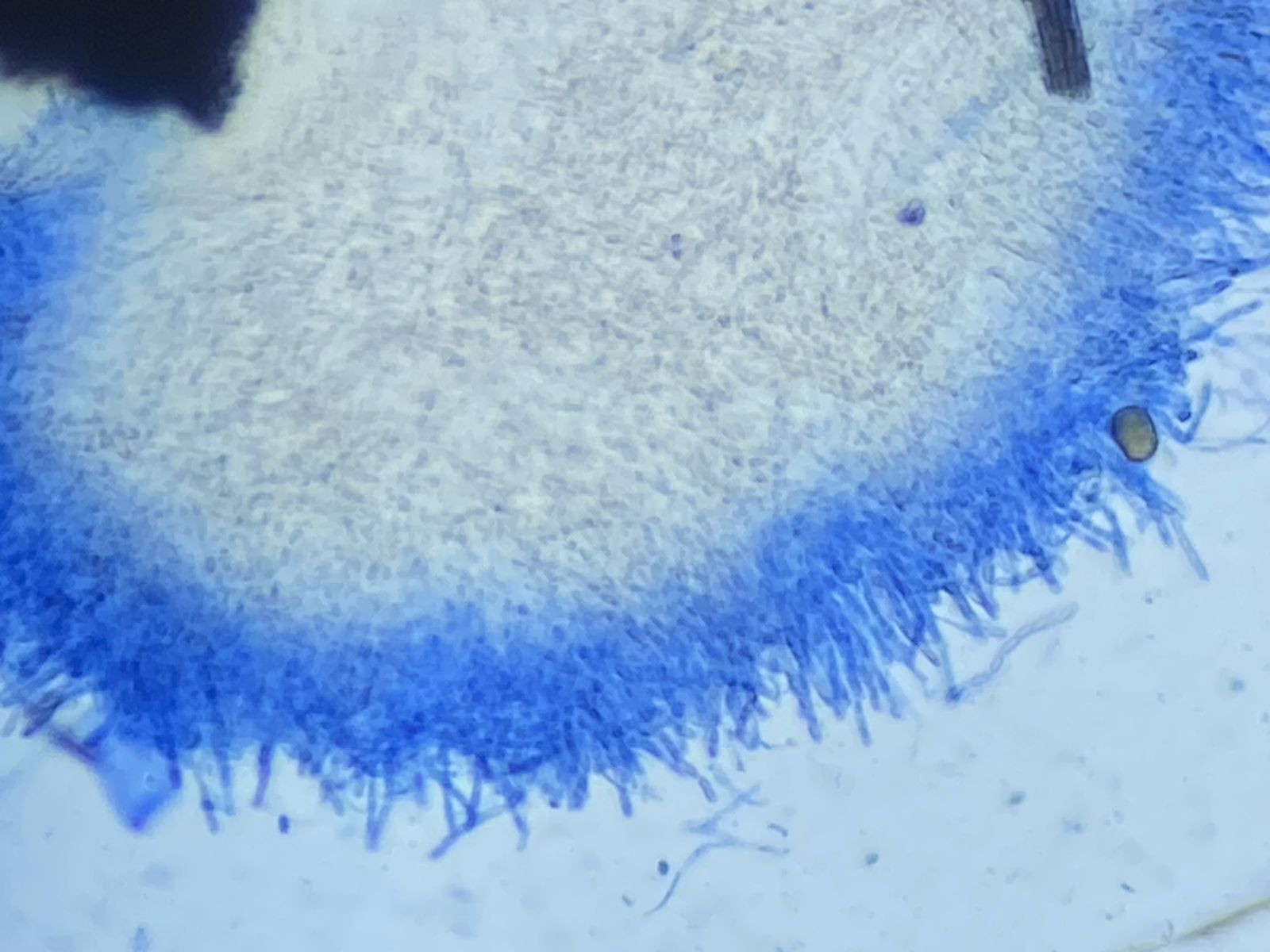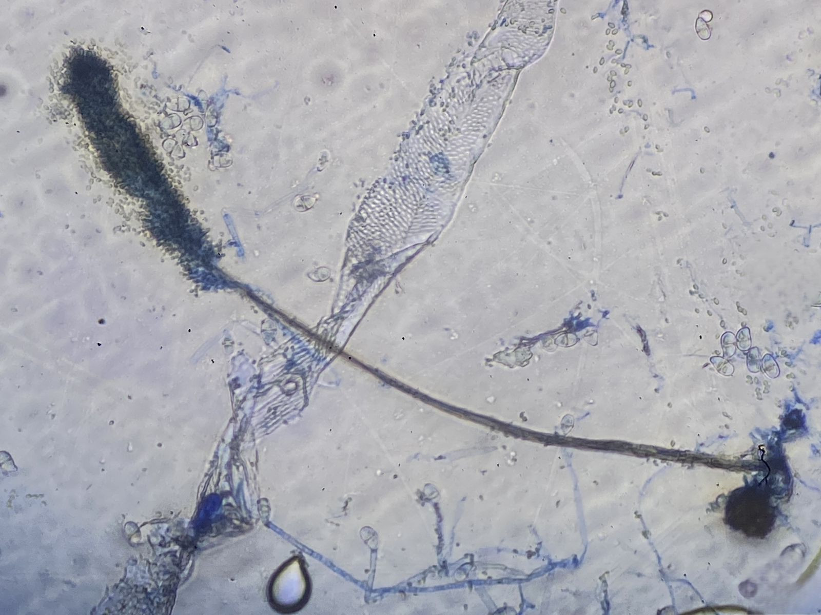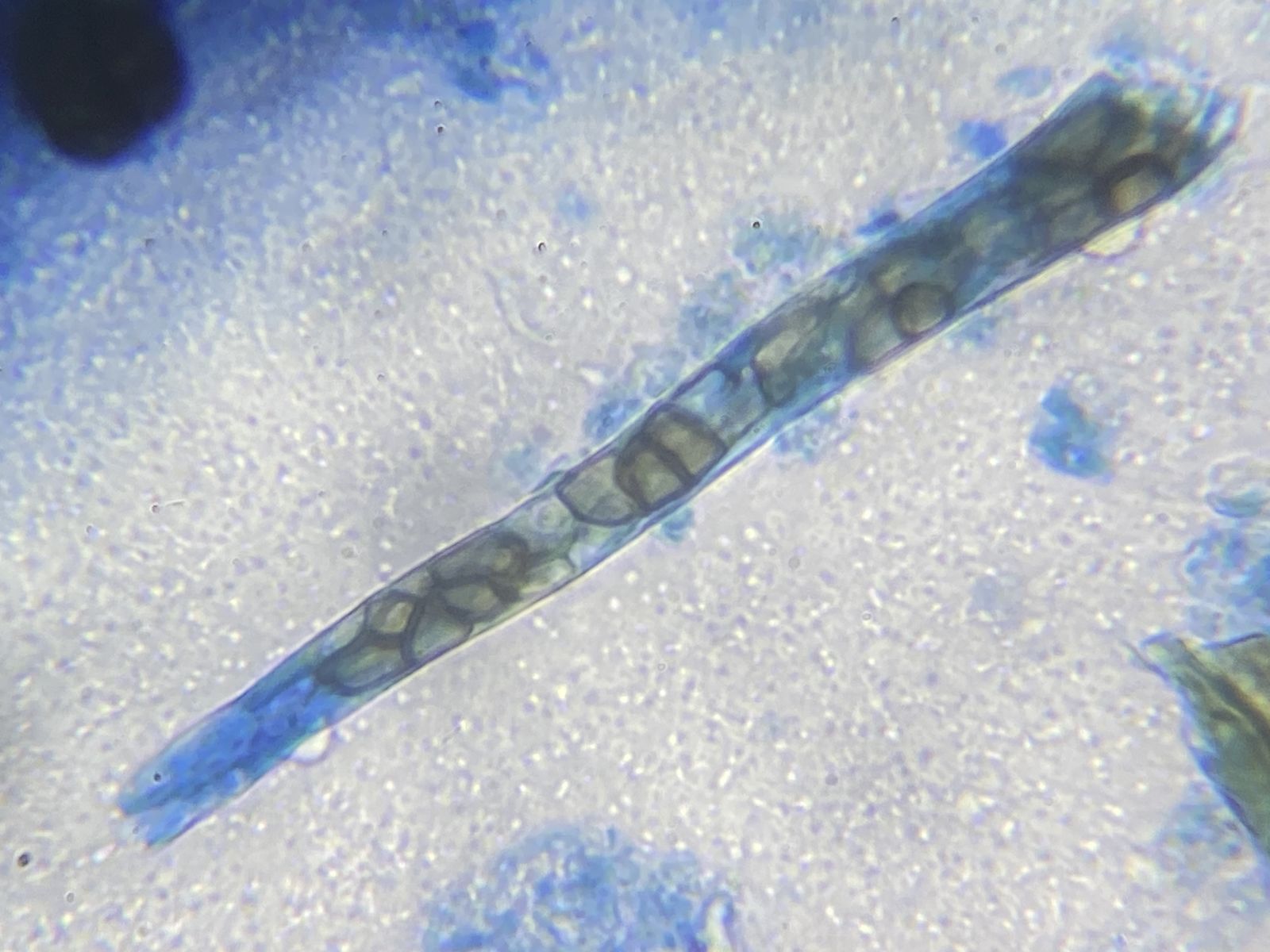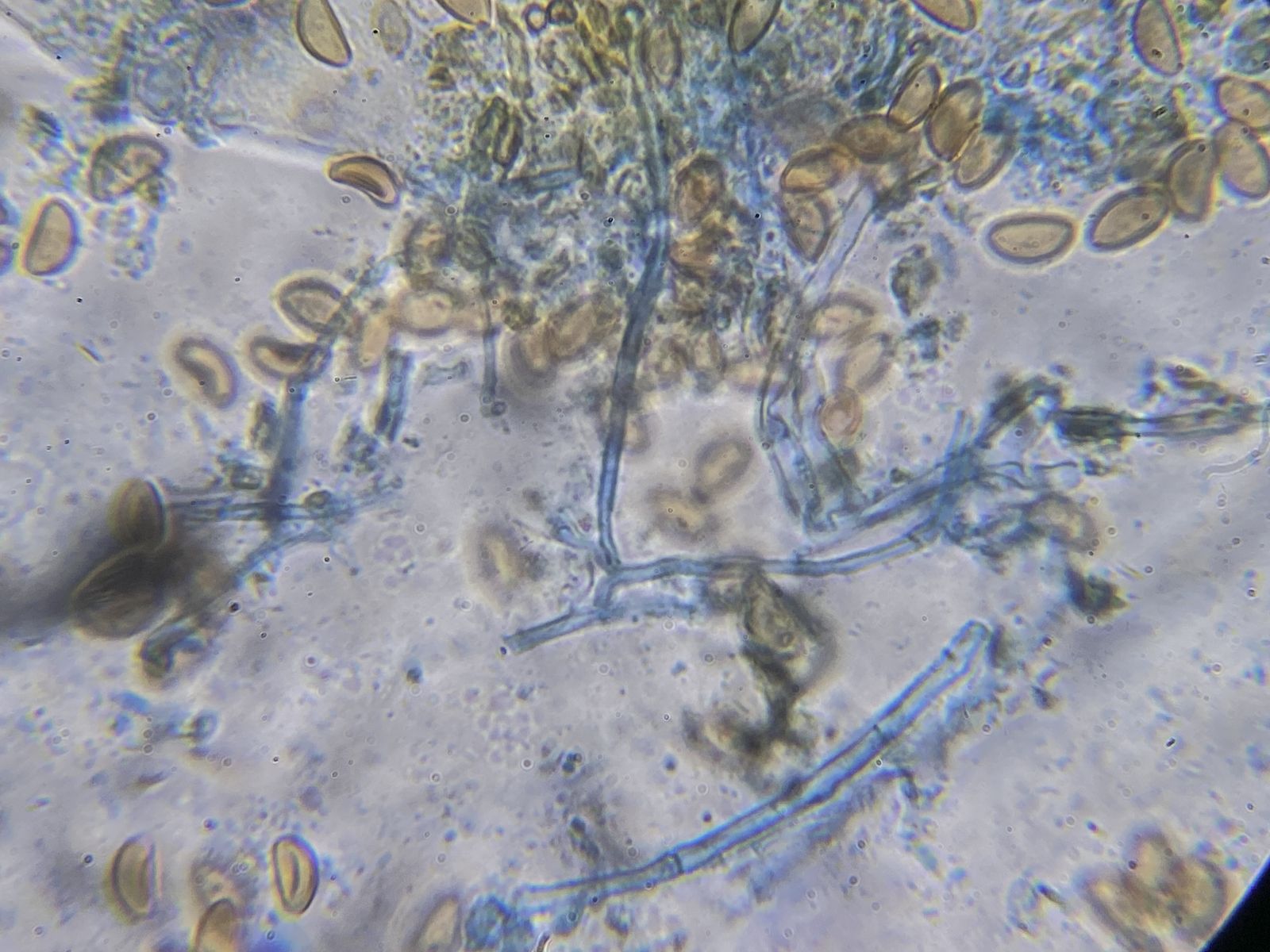 Sind denn die Kammerungen bei den Konidien nicht auf Septen zurückzuführen. Wenn das so wäre, müsste ich völlig umdenken. Ja es war Baumwollblau. Das Substrat waren Rapsstängel. Auswüchse an den Konidien waren nicht zu sehen. Ich hatte kürzlich den Fall, dass ich ein Präparat machte, es aber erst am nächsten Tag ansehen konnte. Da hatten viele Konidien bereits Keimschläuche ausgebildet. Aber das wirst Du wohl nicht meinen. Könnte KOH die Linse bei Kontakt schaden? Ich vermute, mein günstiges Mikroskop aus China hat Kunststofflinsen. Ich musste schon mal ein Objektiv wegen Kratzern ersetzen. Auswüchse an den Hyphen sah ich nicht.