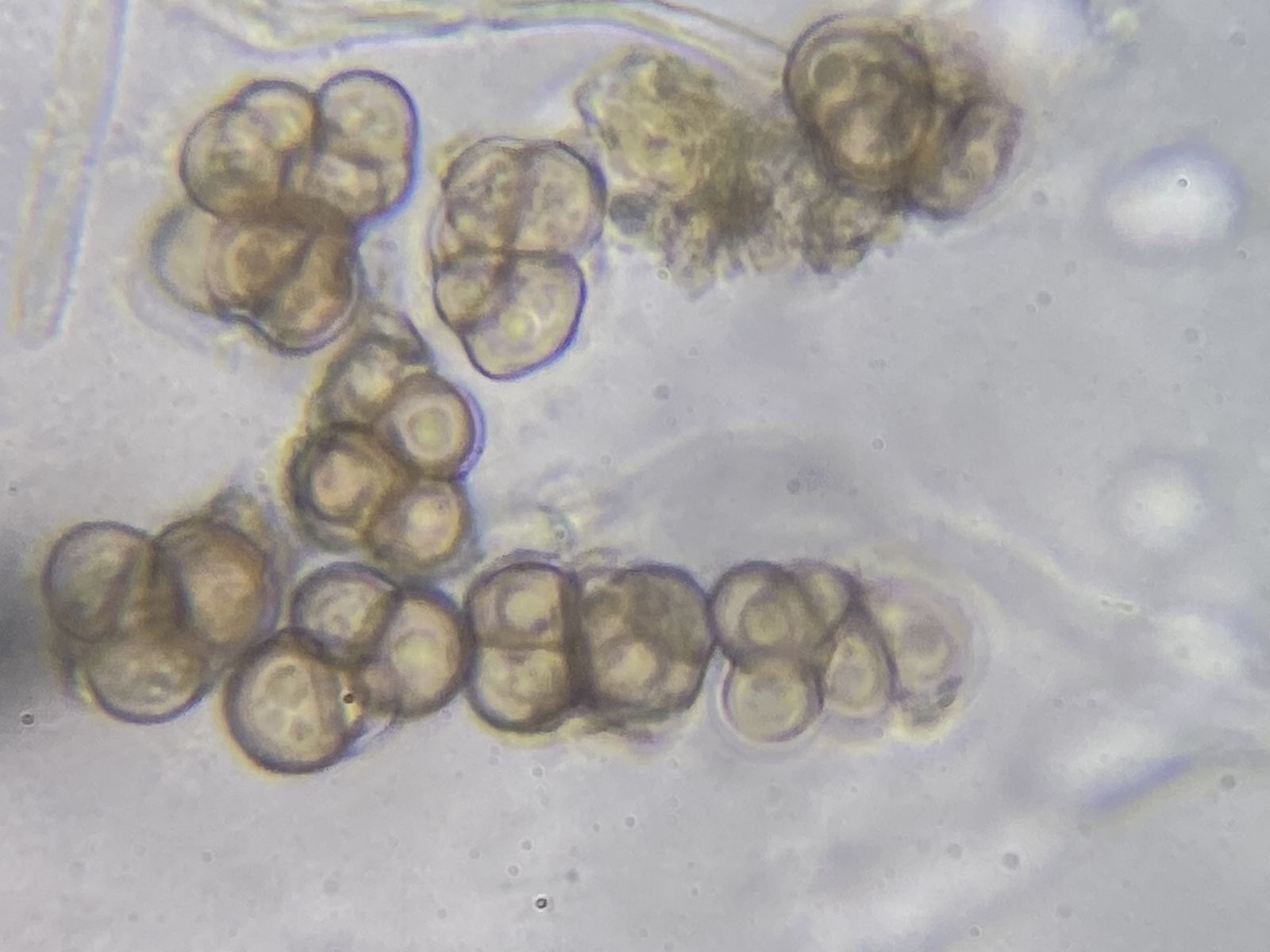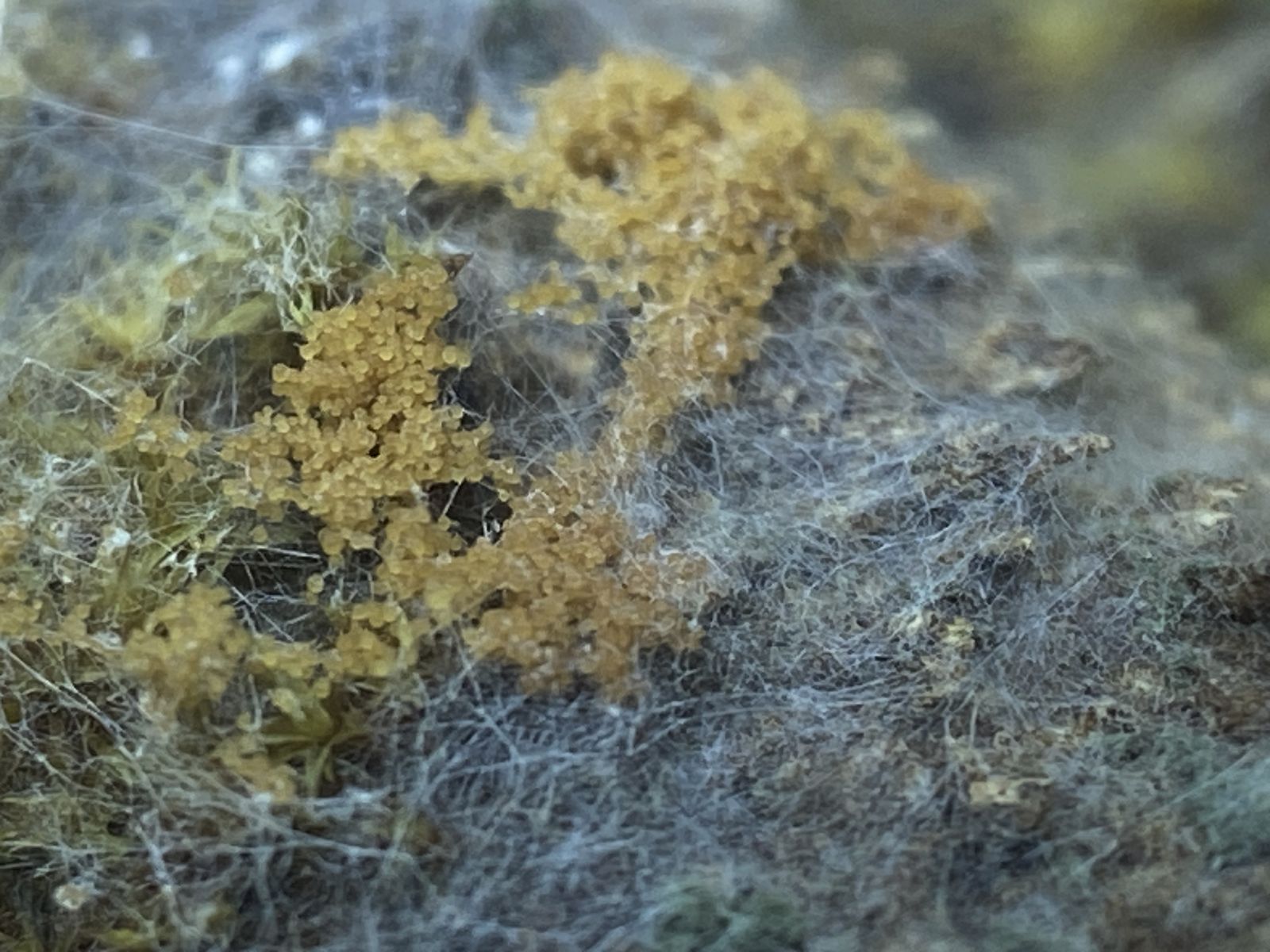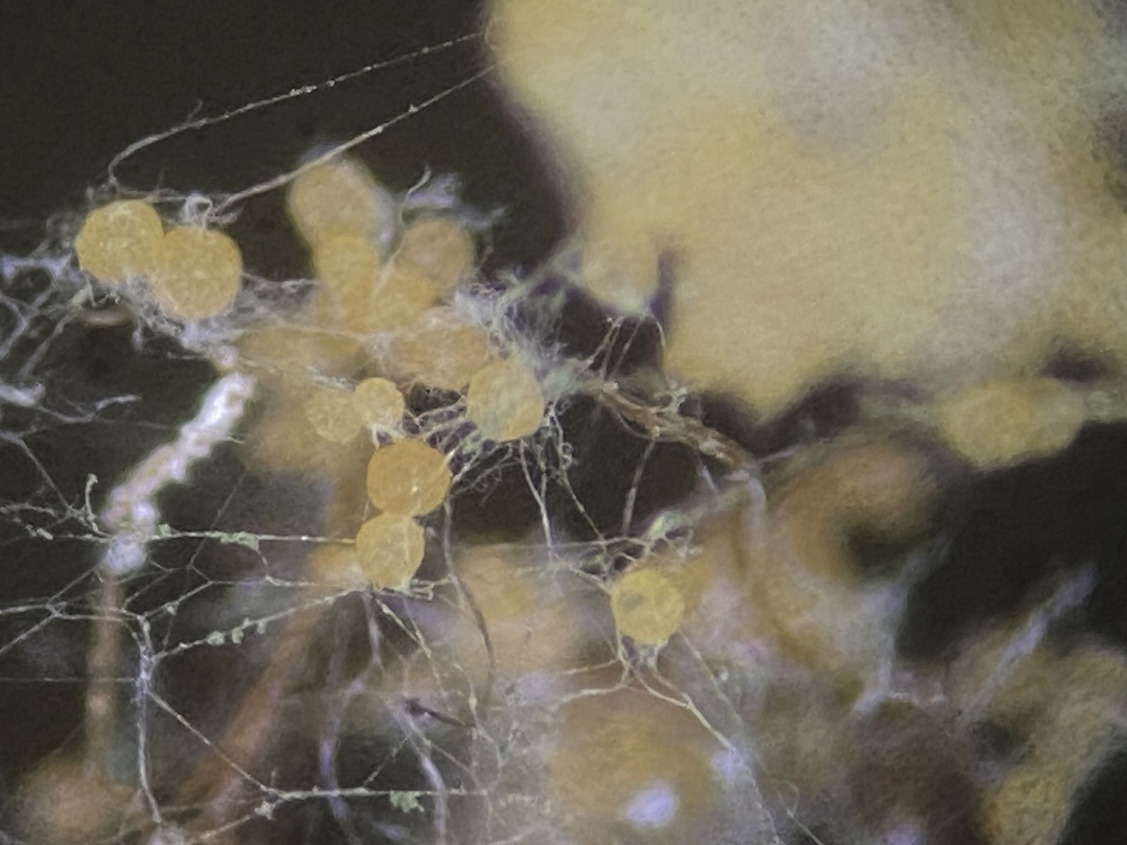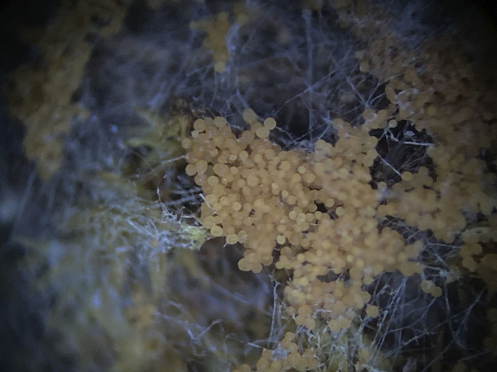 Diese Kugelmassen (40 -140 µm Ø pro Kugel) auf der Unterseite von Rinde sah ich ich erstmalig. Ich habe keine Ahnung, was das ist, und ziehe alles Mögliche in Betracht: Sklerotien, Pyknidien, Schleimpilzsporen, Insekteneier. Es gibt zwar viele Hyphen oder Spinngewebe, aber keine weiteren Strukturen. Wenn man die Kugeln zerdrückt, sieht man Kammerungen, die an Sporen oder Kalkplättchen erinnern.