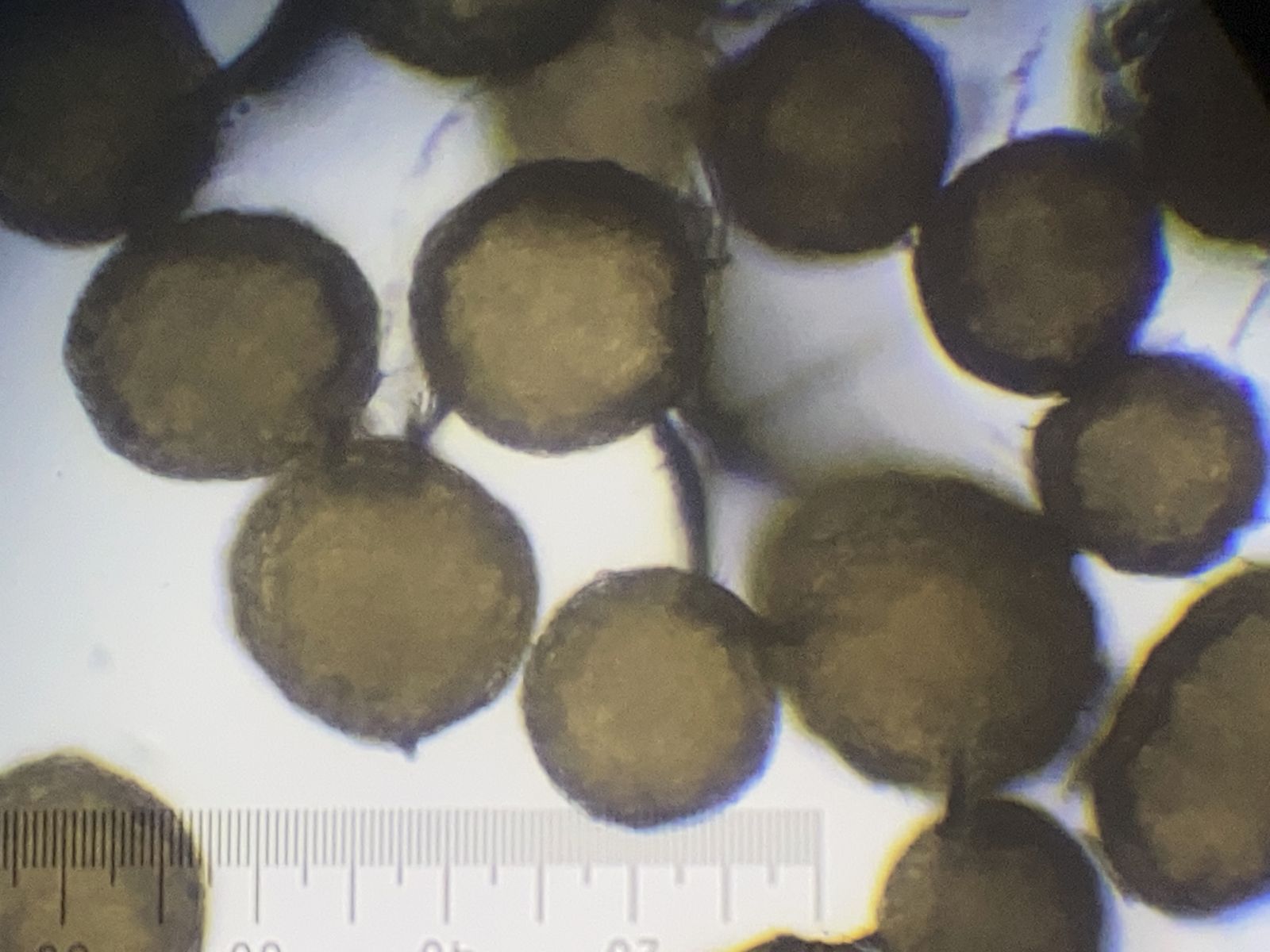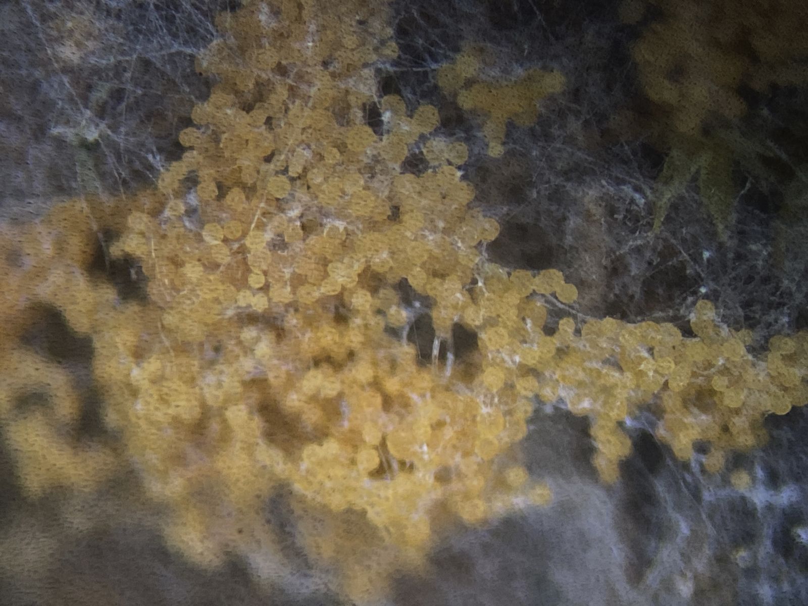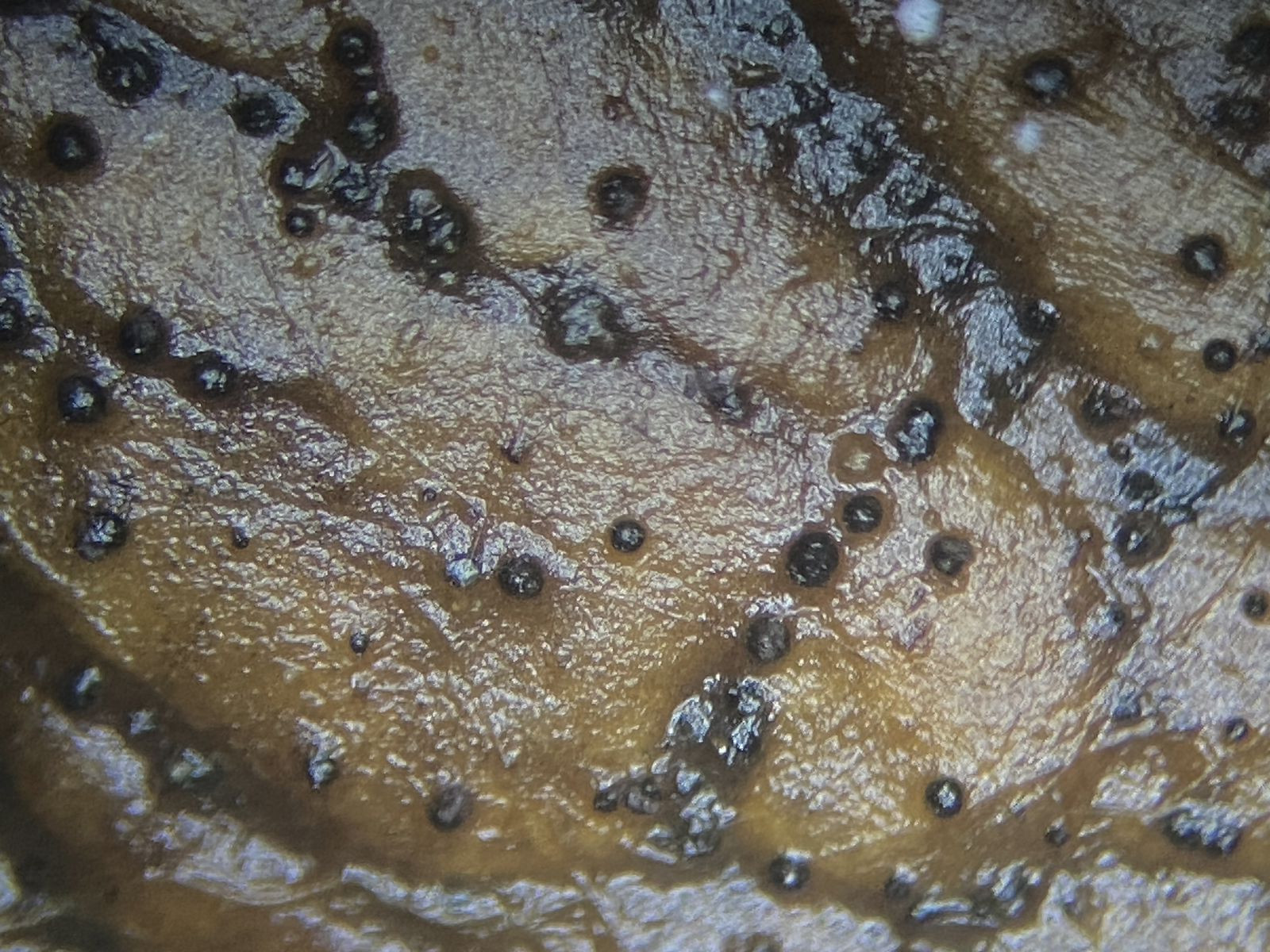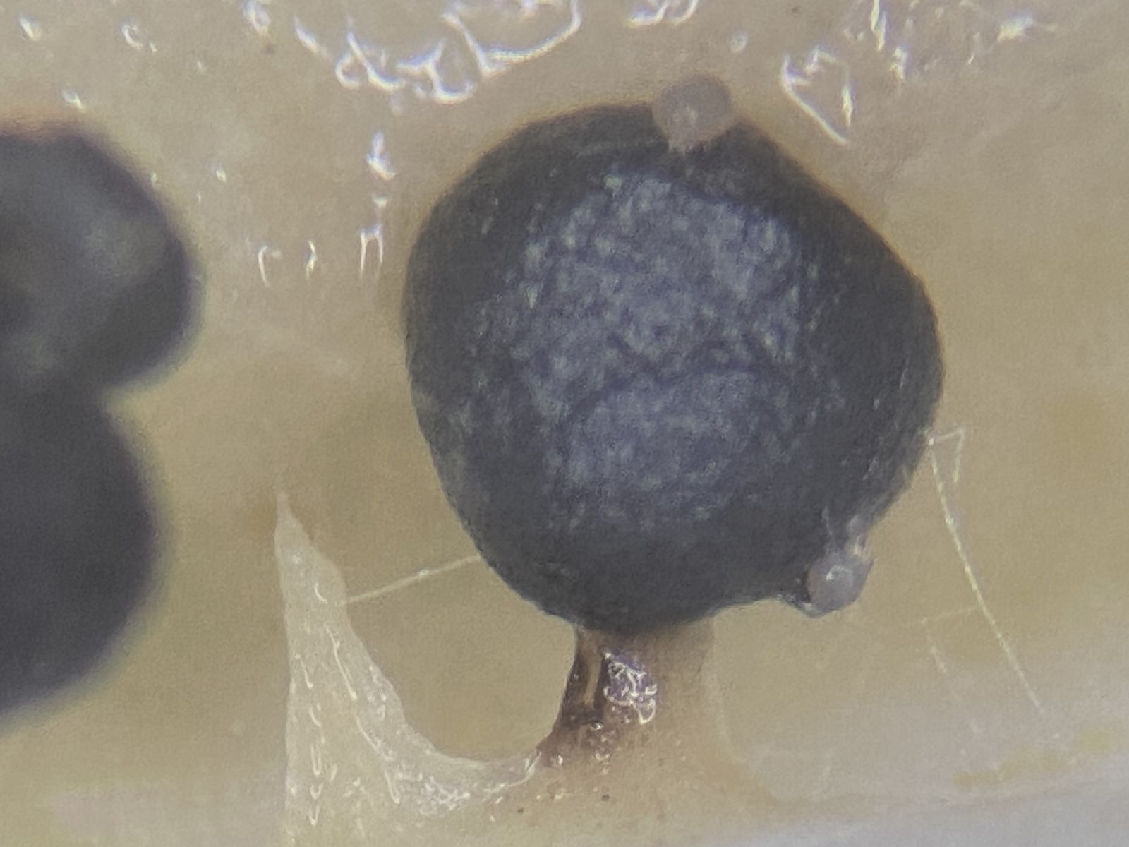 Diese Kugelmassen (40 -140 µm Ø pro Kugel) auf der Unterseite von Rinde sah ich ich erstmalig. Ich habe keine Ahnung, was das ist, und ziehe alles Mögliche in Betracht: Sklerotien, Pyknidien, Schleimpilzsporen, Insekteneier. Es gibt zwar viele Hyphen oder Spinngewebe, aber keine weiteren Strukturen. Wenn man die Kugeln zerdrückt, sieht man Kammerungen, die an Sporen oder Kalkplättchen erinnern.
