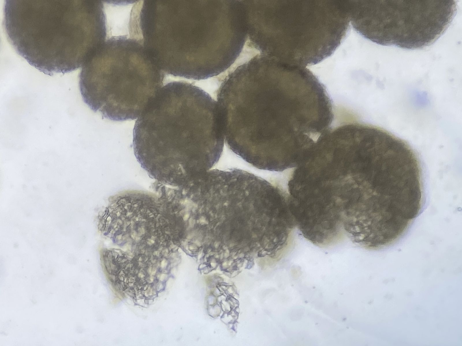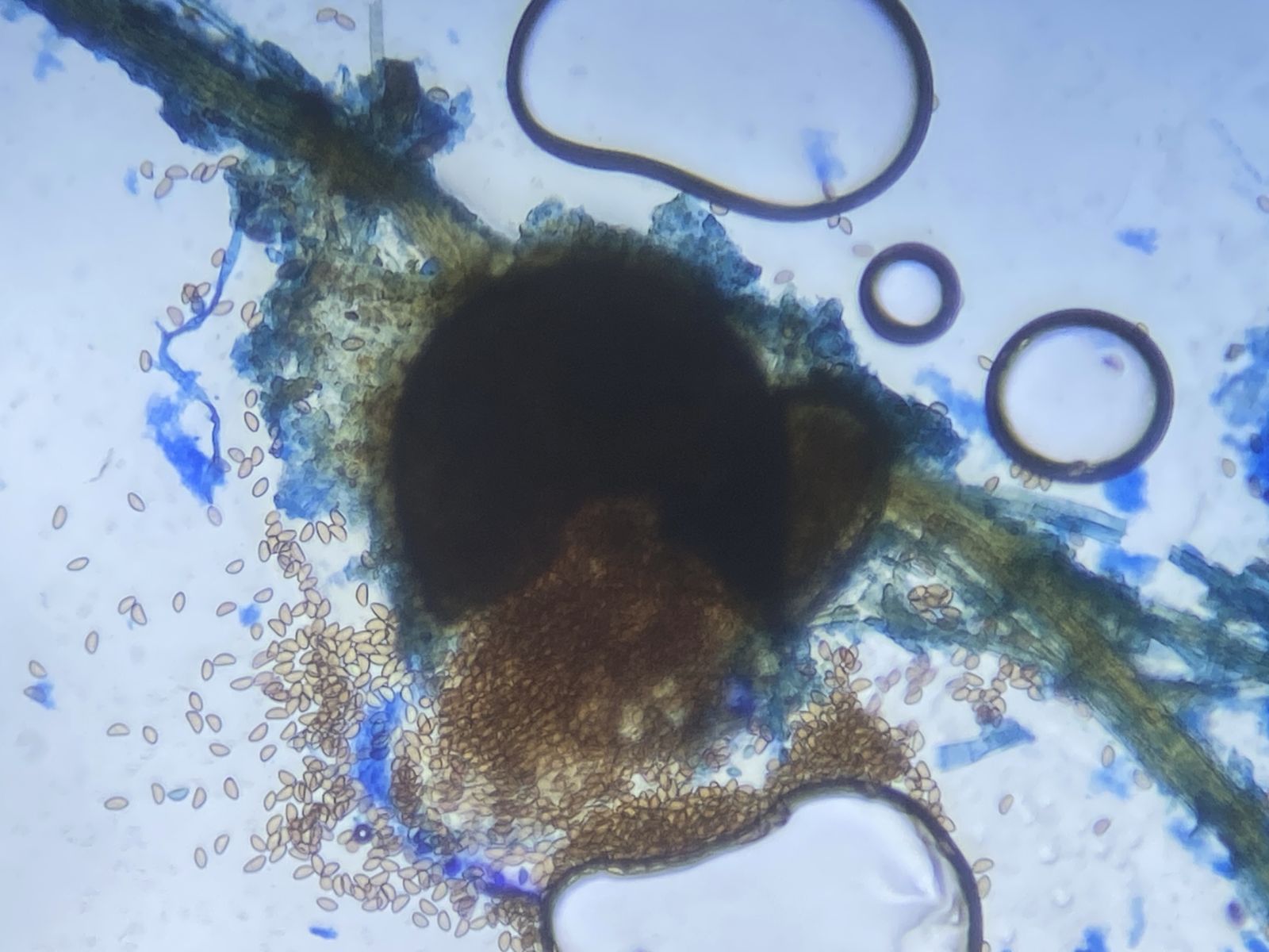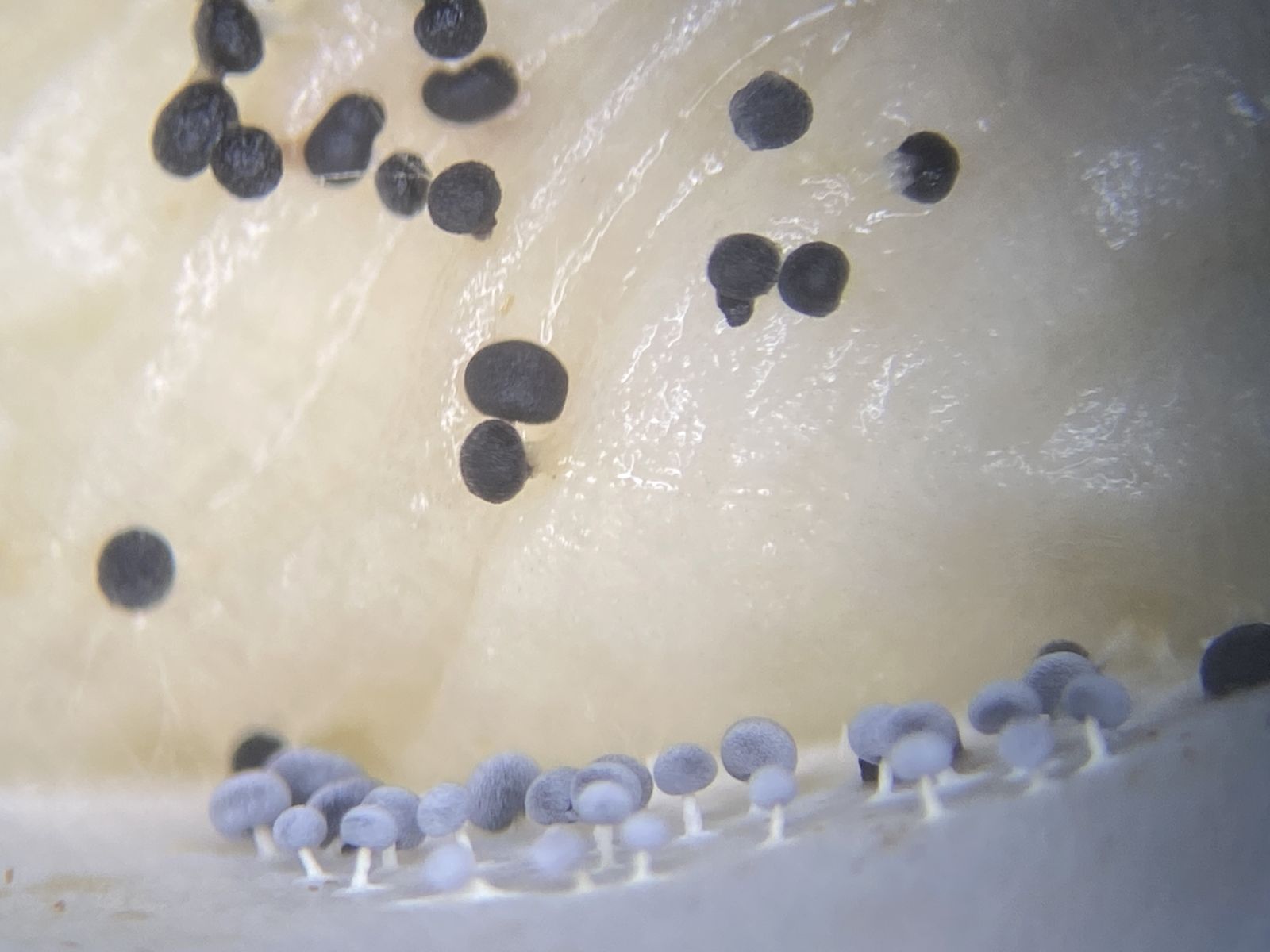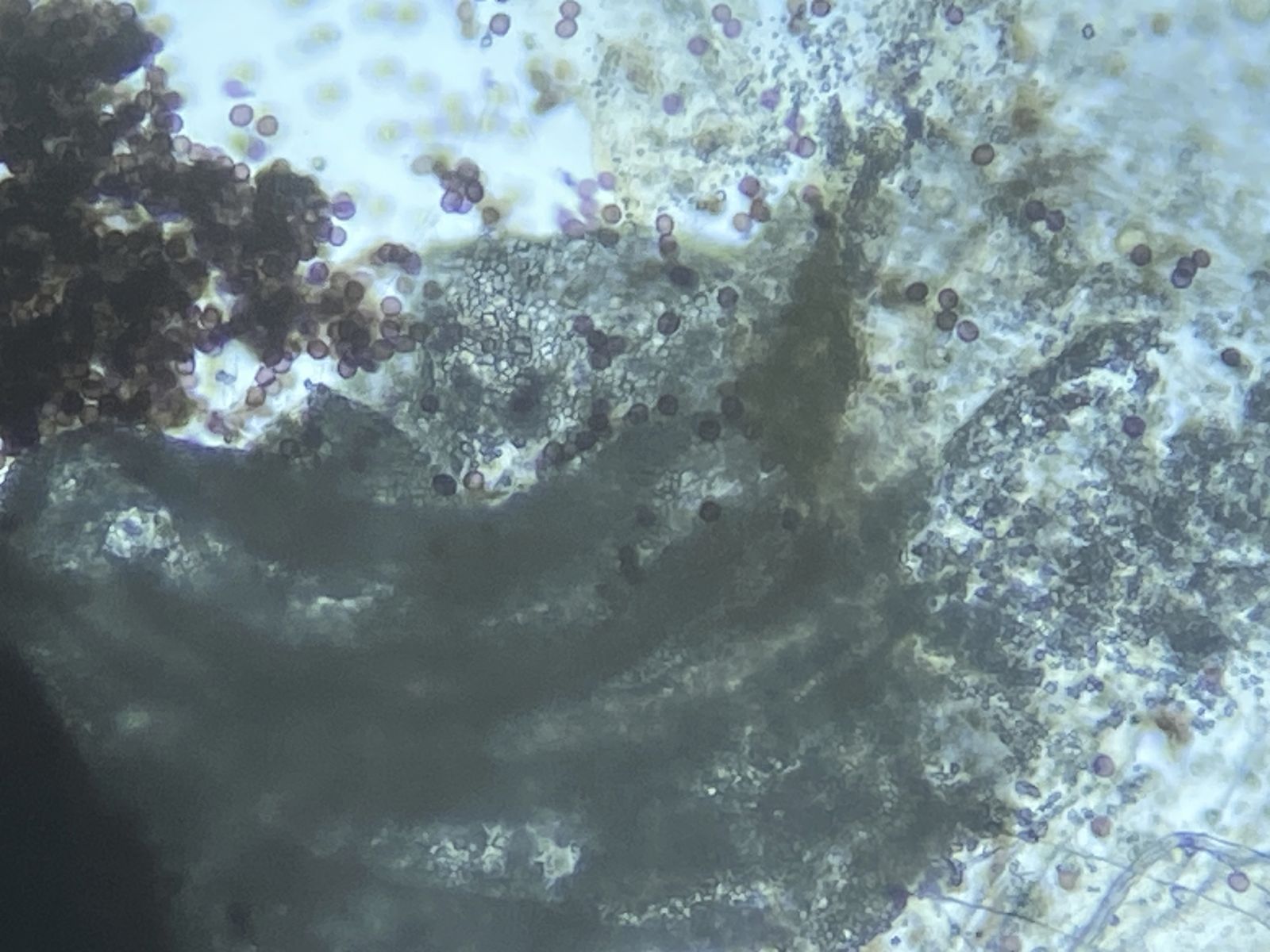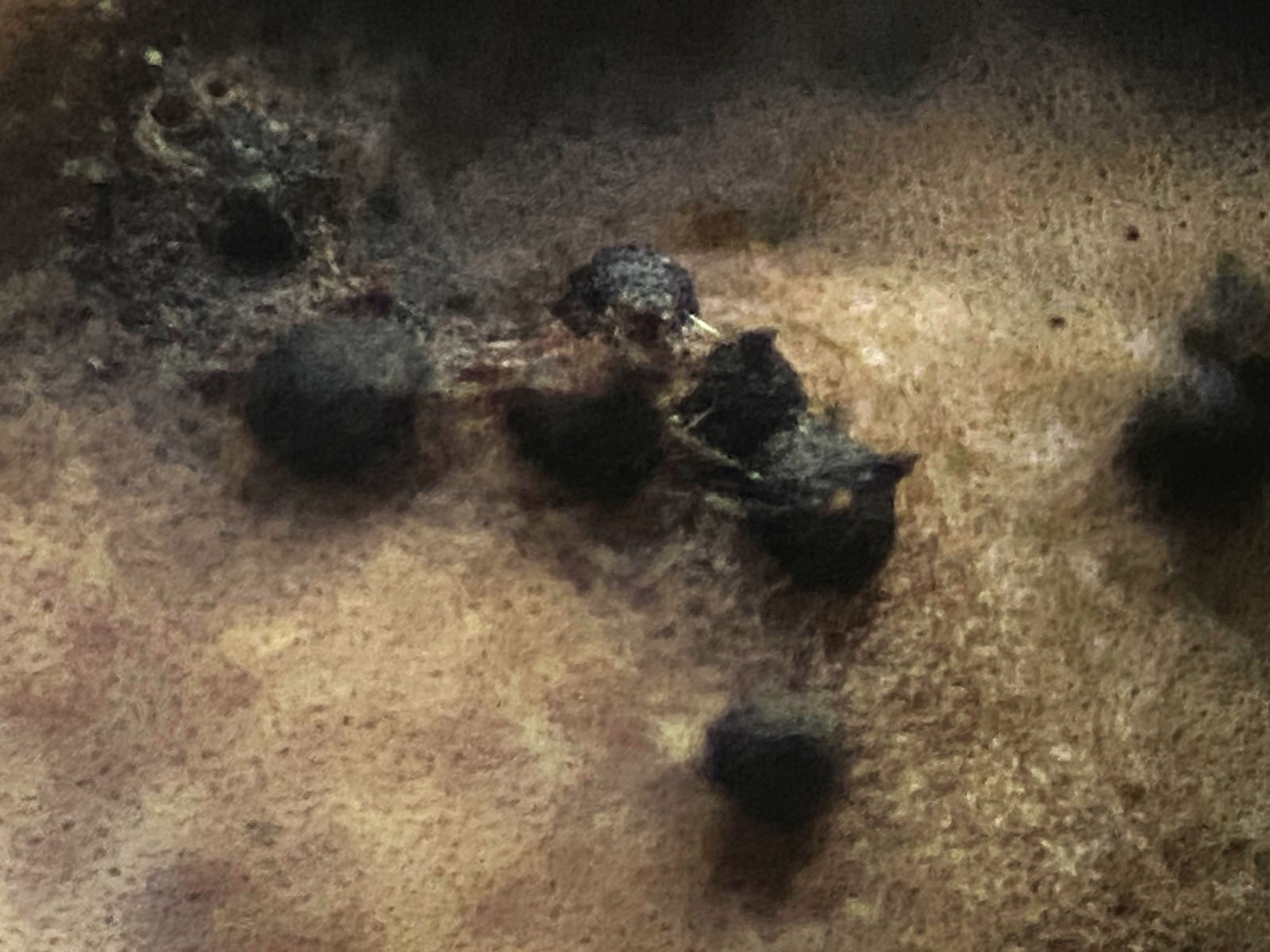 Diese Kugelmassen (40 -140 µm Ø pro Kugel) auf der Unterseite von Rinde sah ich ich erstmalig. Ich habe keine Ahnung, was das ist, und ziehe alles Mögliche in Betracht: Sklerotien, Pyknidien, Schleimpilzsporen, Insekteneier. Es gibt zwar viele Hyphen oder Spinngewebe, aber keine weiteren Strukturen. Wenn man die Kugeln zerdrückt, sieht man Kammerungen, die an Sporen oder Kalkplättchen erinnern.