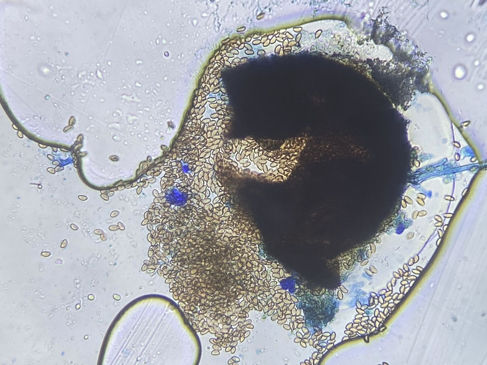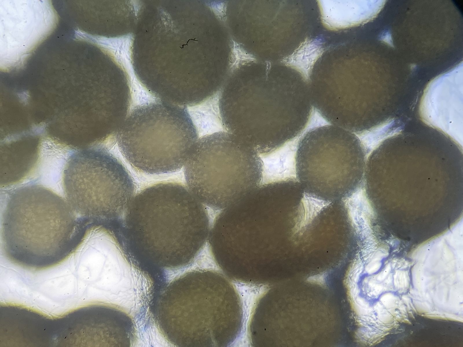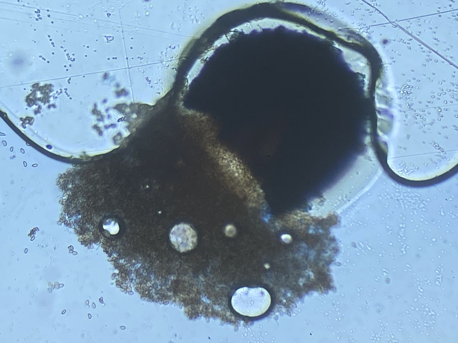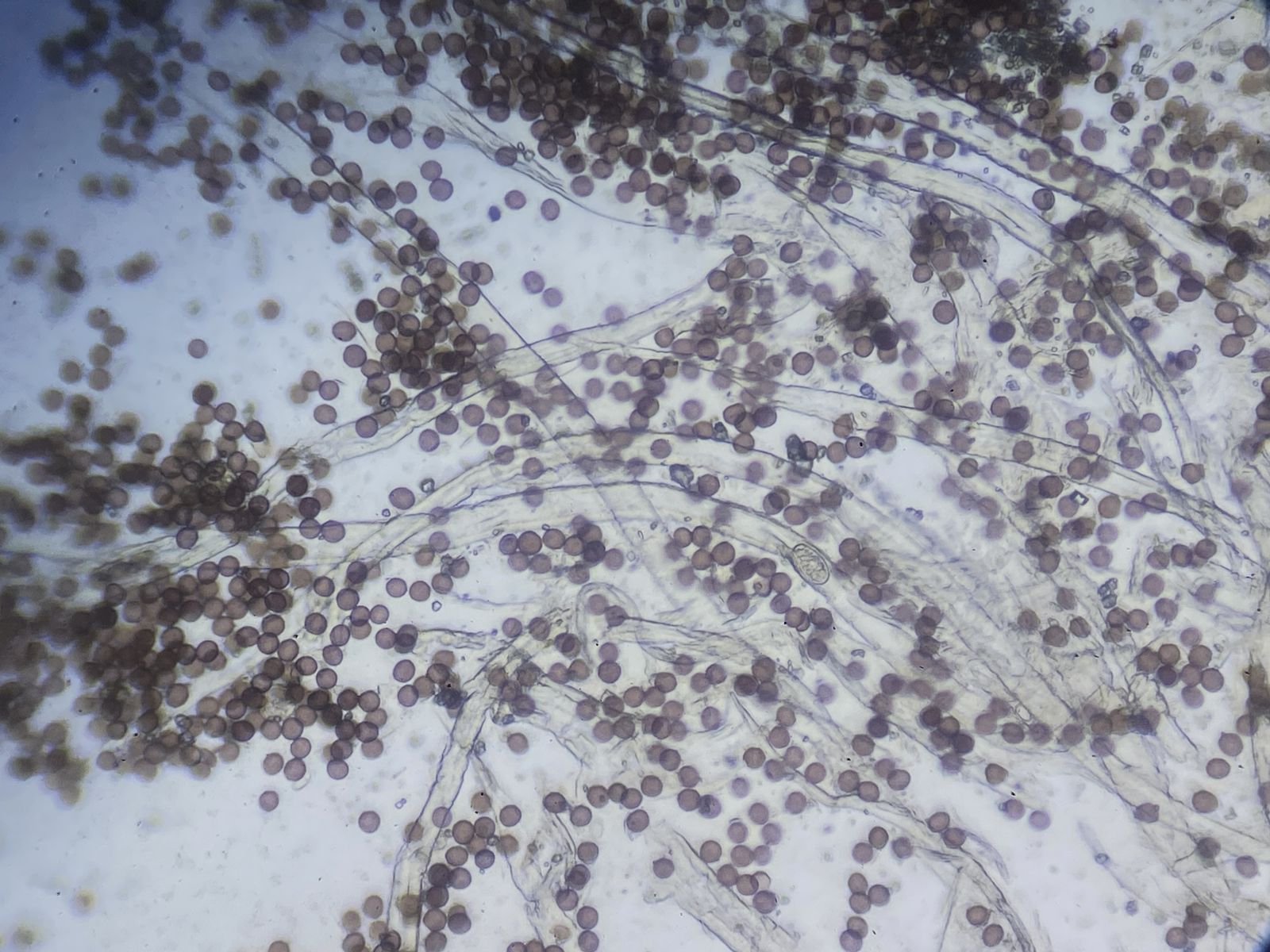 Diese Kugelmassen (40 -140 µm Ø pro Kugel) auf der Unterseite von Rinde sah ich ich erstmalig. Ich habe keine Ahnung, was das ist, und ziehe alles Mögliche in Betracht: Sklerotien, Pyknidien, Schleimpilzsporen, Insekteneier. Es gibt zwar viele Hyphen oder Spinngewebe, aber keine weiteren Strukturen. Wenn man die Kugeln zerdrückt, sieht man Kammerungen, die an Sporen oder Kalkplättchen erinnern.