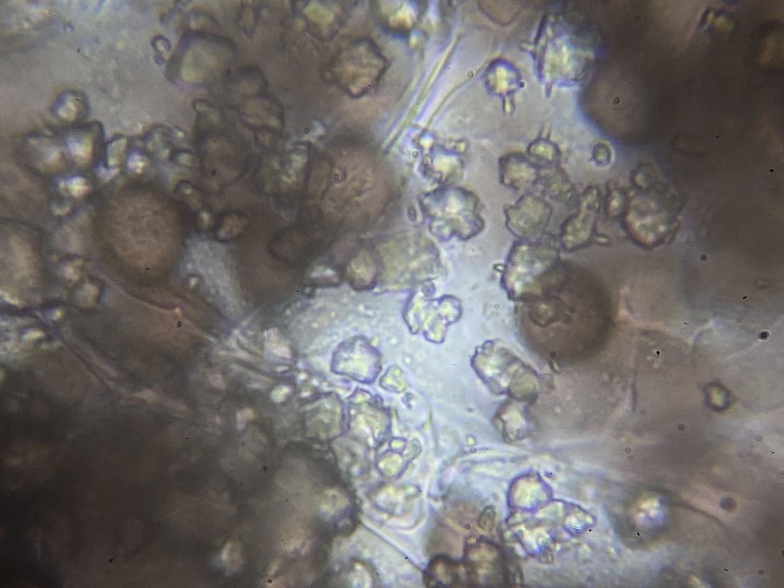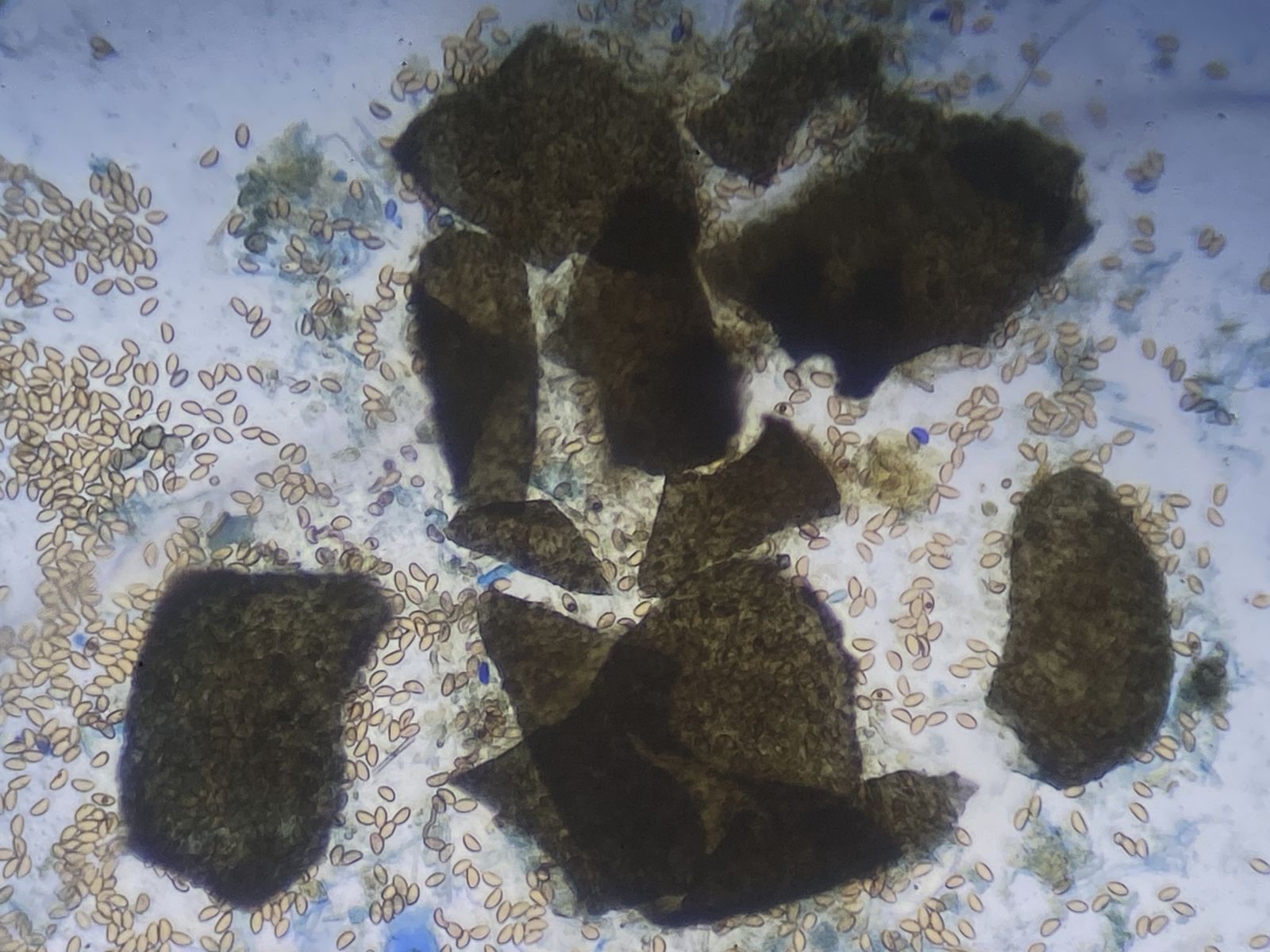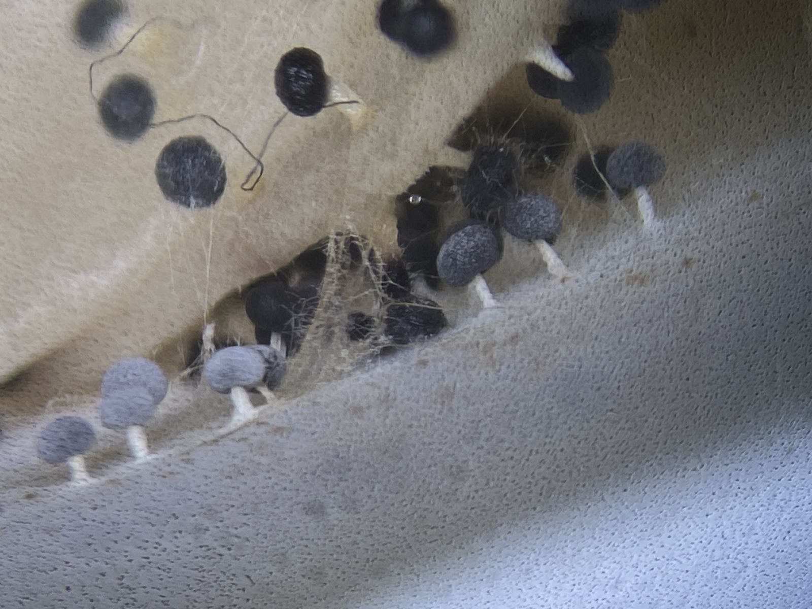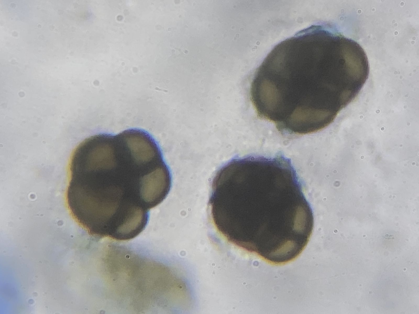 Diese Kugelmassen (40 -140 µm Ø pro Kugel) auf der Unterseite von Rinde sah ich ich erstmalig. Ich habe keine Ahnung, was das ist, und ziehe alles Mögliche in Betracht: Sklerotien, Pyknidien, Schleimpilzsporen, Insekteneier. Es gibt zwar viele Hyphen oder Spinngewebe, aber keine weiteren Strukturen. Wenn man die Kugeln zerdrückt, sieht man Kammerungen, die an Sporen oder Kalkplättchen erinnern.