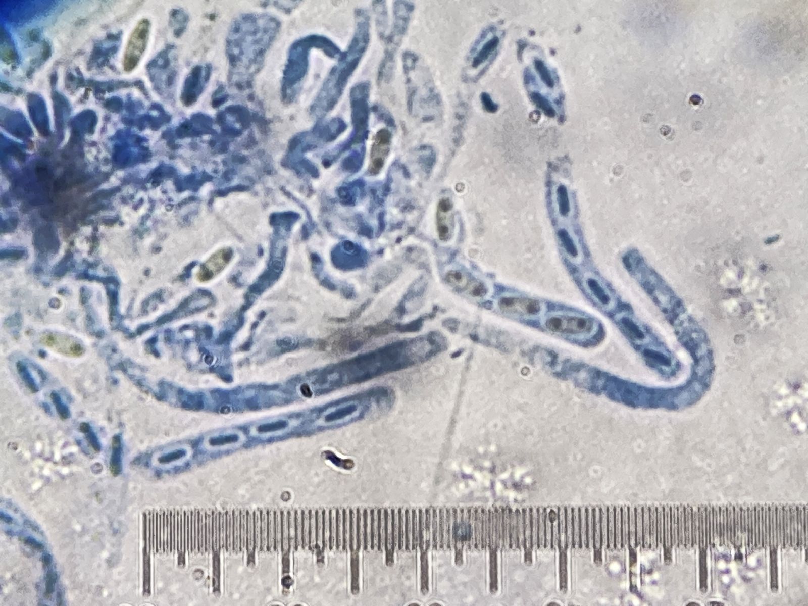 auf einem Fichtenzapfen fand ich diese Form. Aber für mich nicht bestimmbar. Die braunen kurzen Hyphen sind wenig septiert. Die hyalinen, cyanophilen Konidien werden innerhalb der Hyphen gebildet. Sie treten teils in langen Kette, teils in diffusen Haufen auf. Bei den Ketten sieht man einen deutlichen Abstand zwischen den einzelnen Konidien wie bei Arthrosporen. Manchmal erscheinen die Konidien bei den Hyphen im Durchlicht - aber dann sind sie nicht seriell ausgerichtet. Im Inneren der Hyphe wird eine Art Phyalide gebildet (siehe letztes Foto). Die Hauptform auf dem Zapfen war Trichoderma viride – daher bitte von einigen runden Fremdsporen absehen.