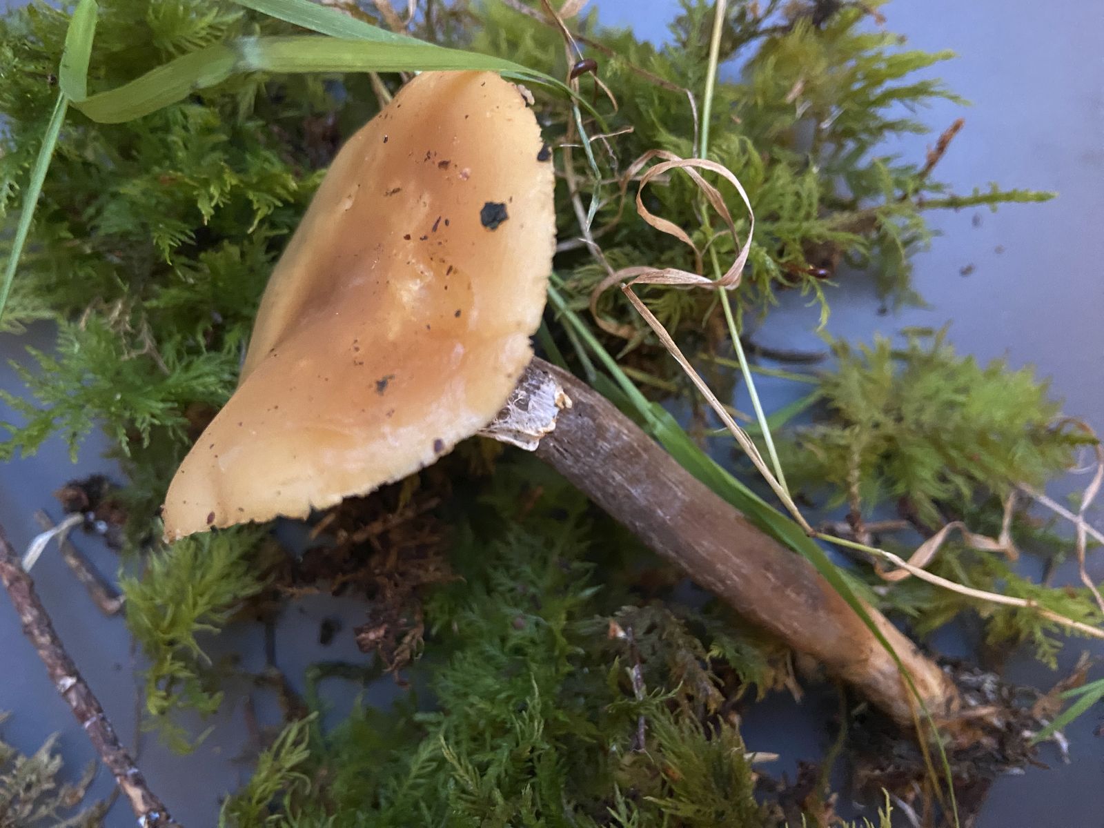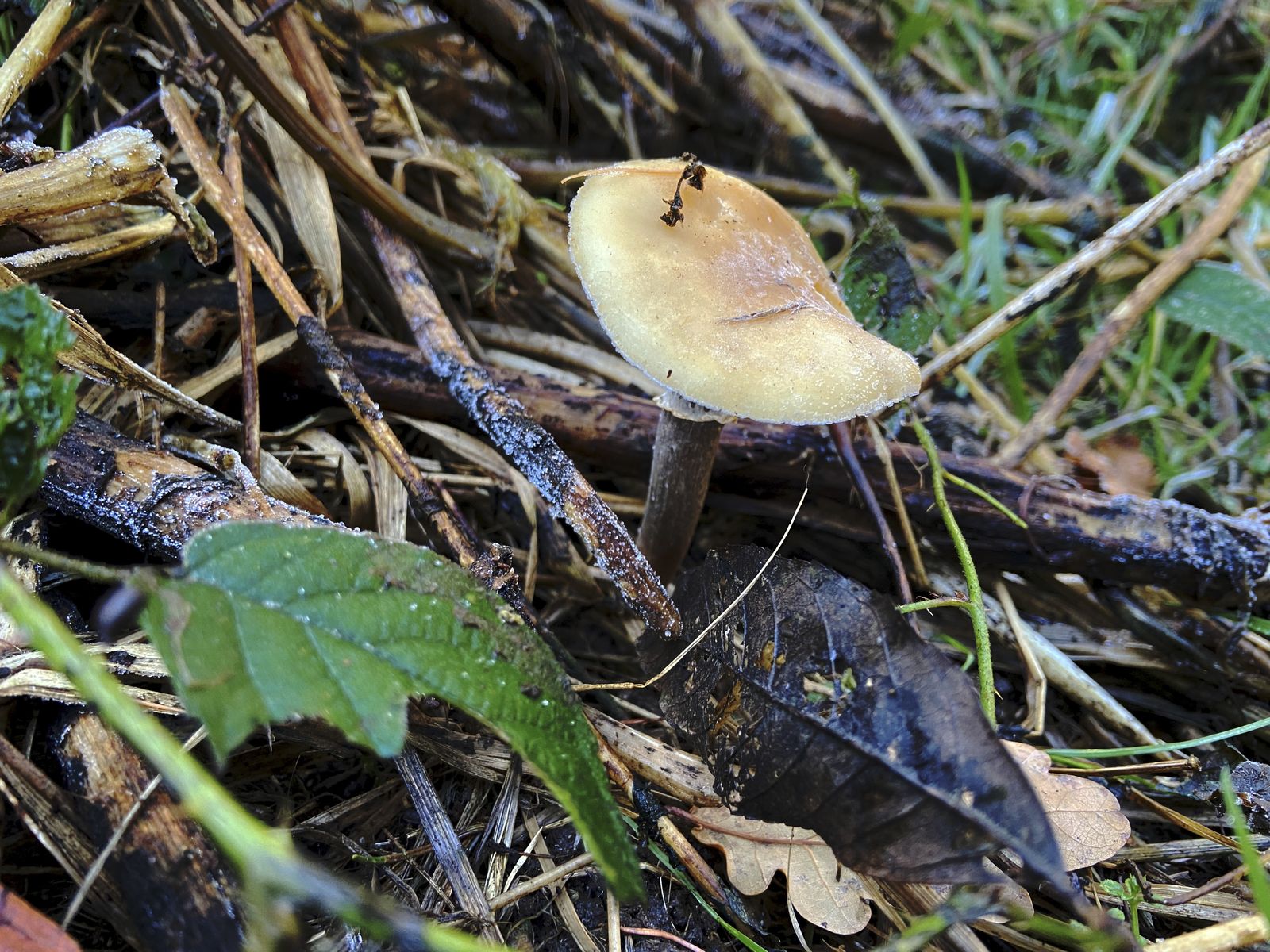 könnte es sein, dass sich dieser Pilz in der Jahreszeit geirrt hat? Er stand dieser Tage am Nadelwaldrand geschützt hinter einem Holzstoß im Gras bzw. auf Erde, könnte aber bereits einen Frost abbekommen haben.