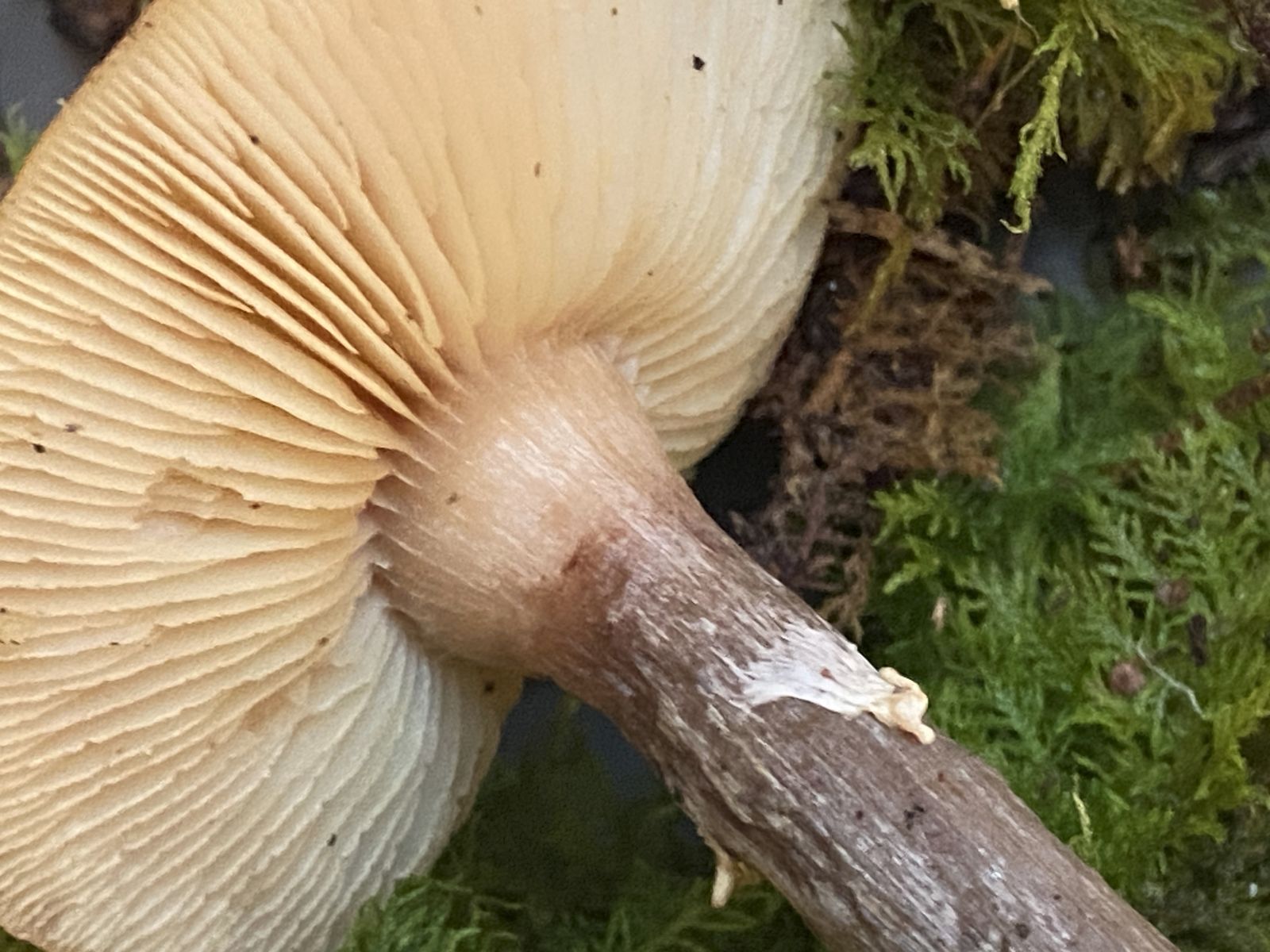 Hut-Ø 5 cm; schmutzig-gelb; Lamellen weiß-gelb, angewachsen (nicht grau!); Stiel schmutzig-schwarz, zur Basis etwas verjüngt, mit Ring; Geruch unbedeutend (Kälte)