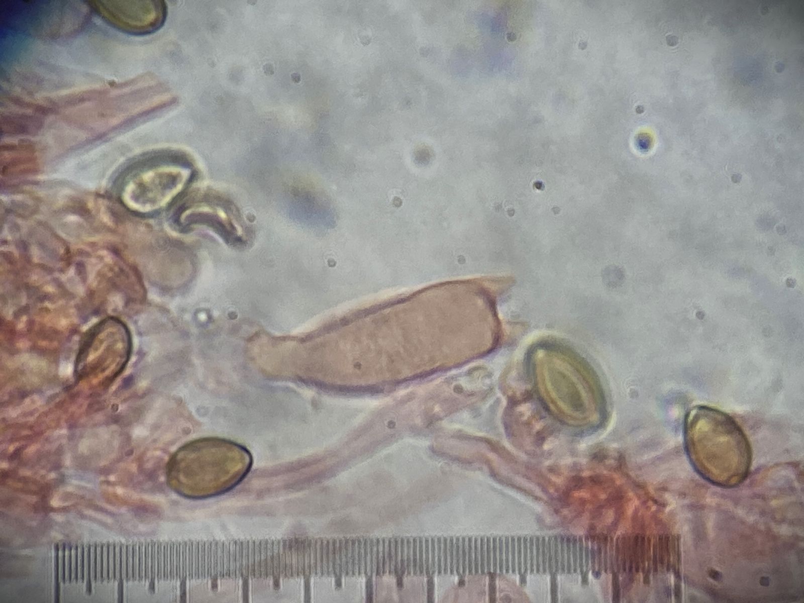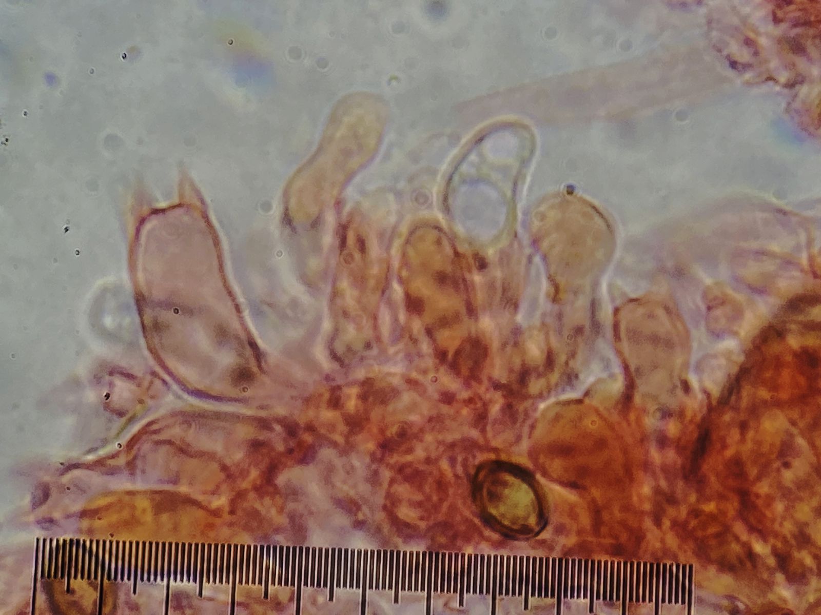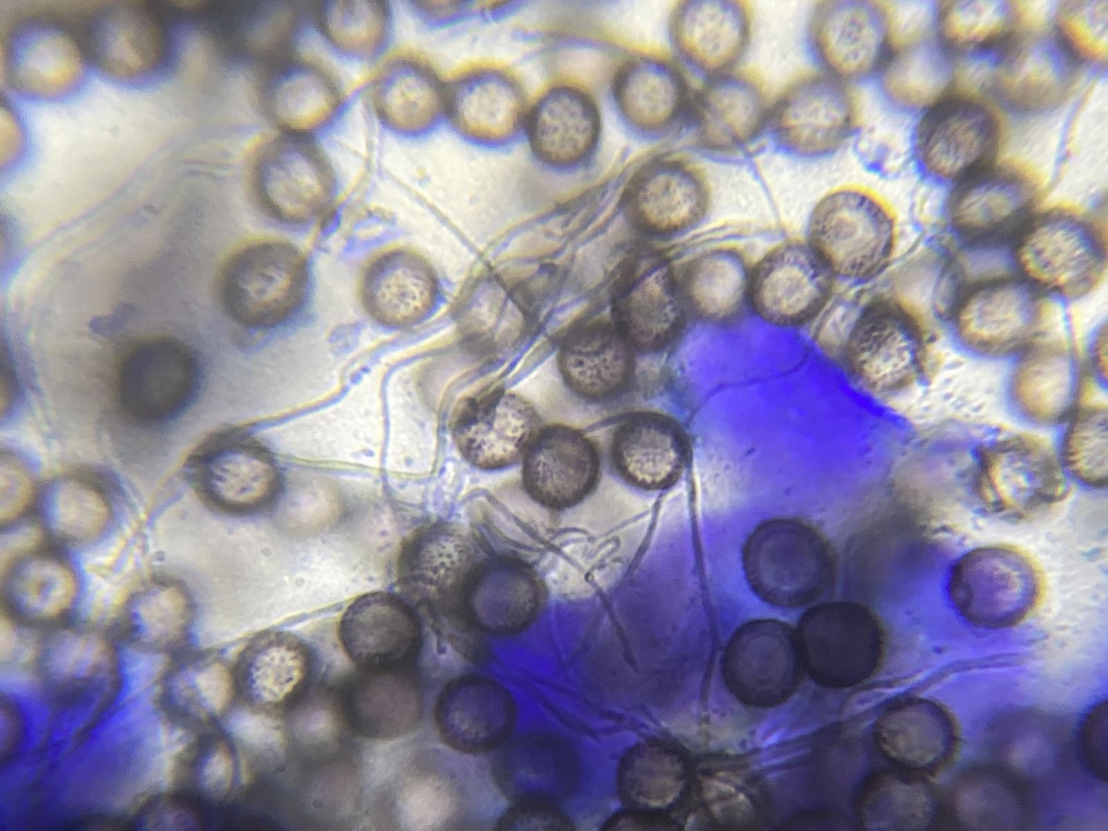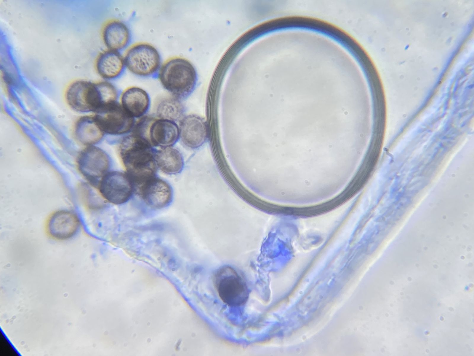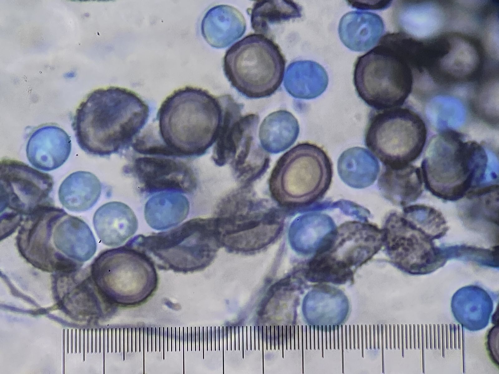 Der Pilz erinnert mich an die Fruchtkörper vom Mehltau-Hyperparasit Ampelomyces quisqualis. Dieser lässt aber auf Druck Massen an Konidien frei. Hier blieben auf Druck nur leere Hüllen zurück ohne jeglichen Konidienauswurf. Auffällig viele Kristalle waren auch zu sehen in Präparaten ohne Baumwollblau. Die Sporen vom Scytonostroma scheiden hier aus: sie sind amyloid, rund mit 5-6 x 4,5-6 µm.