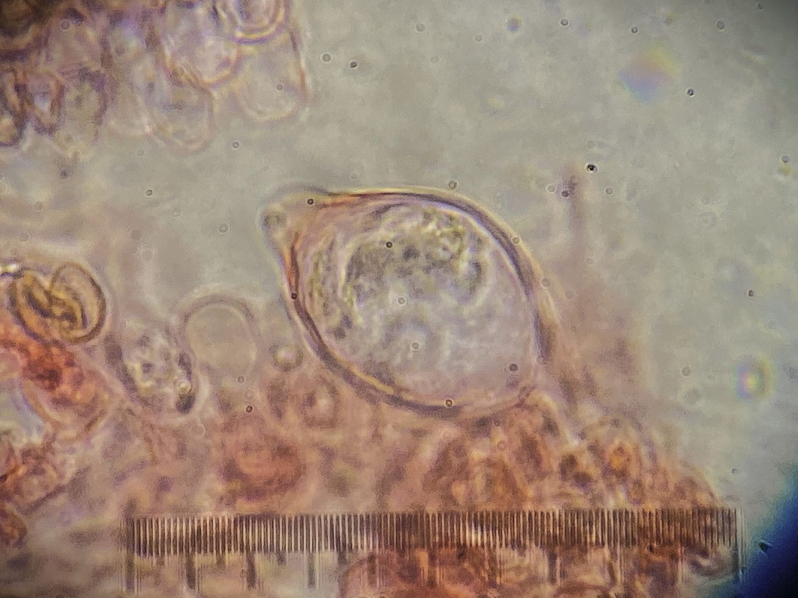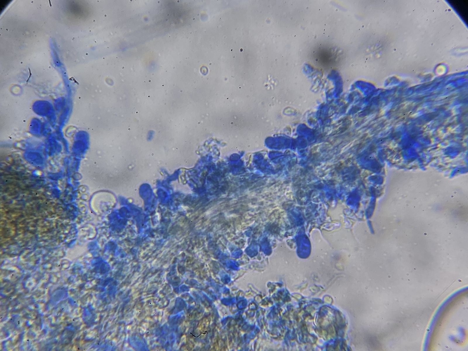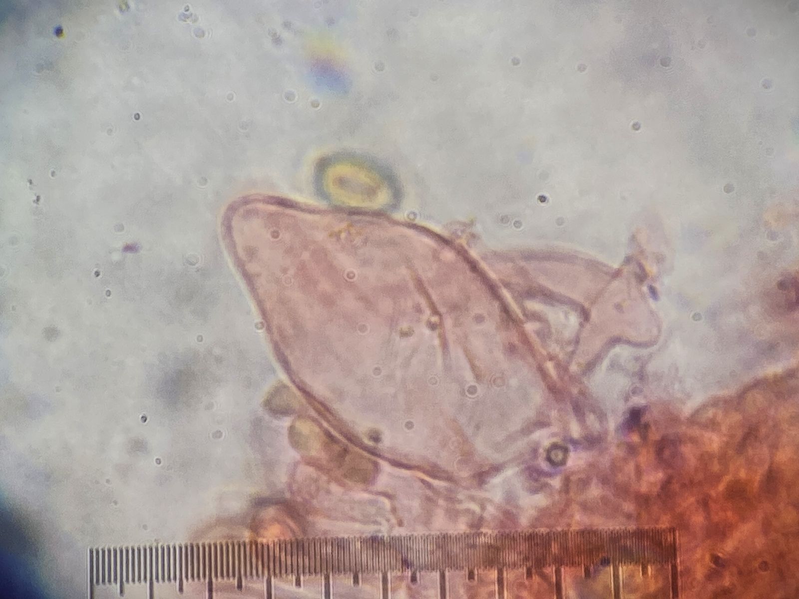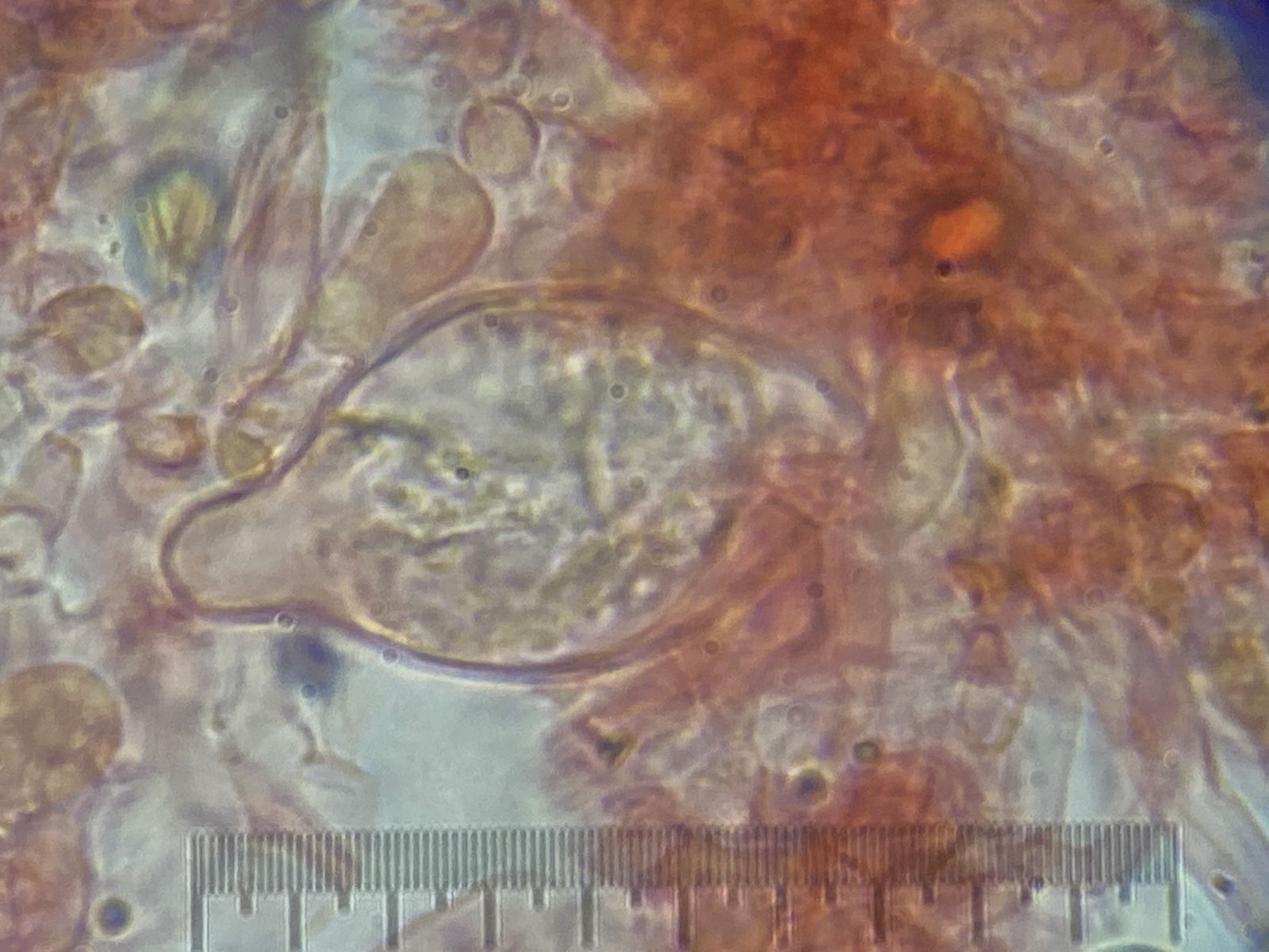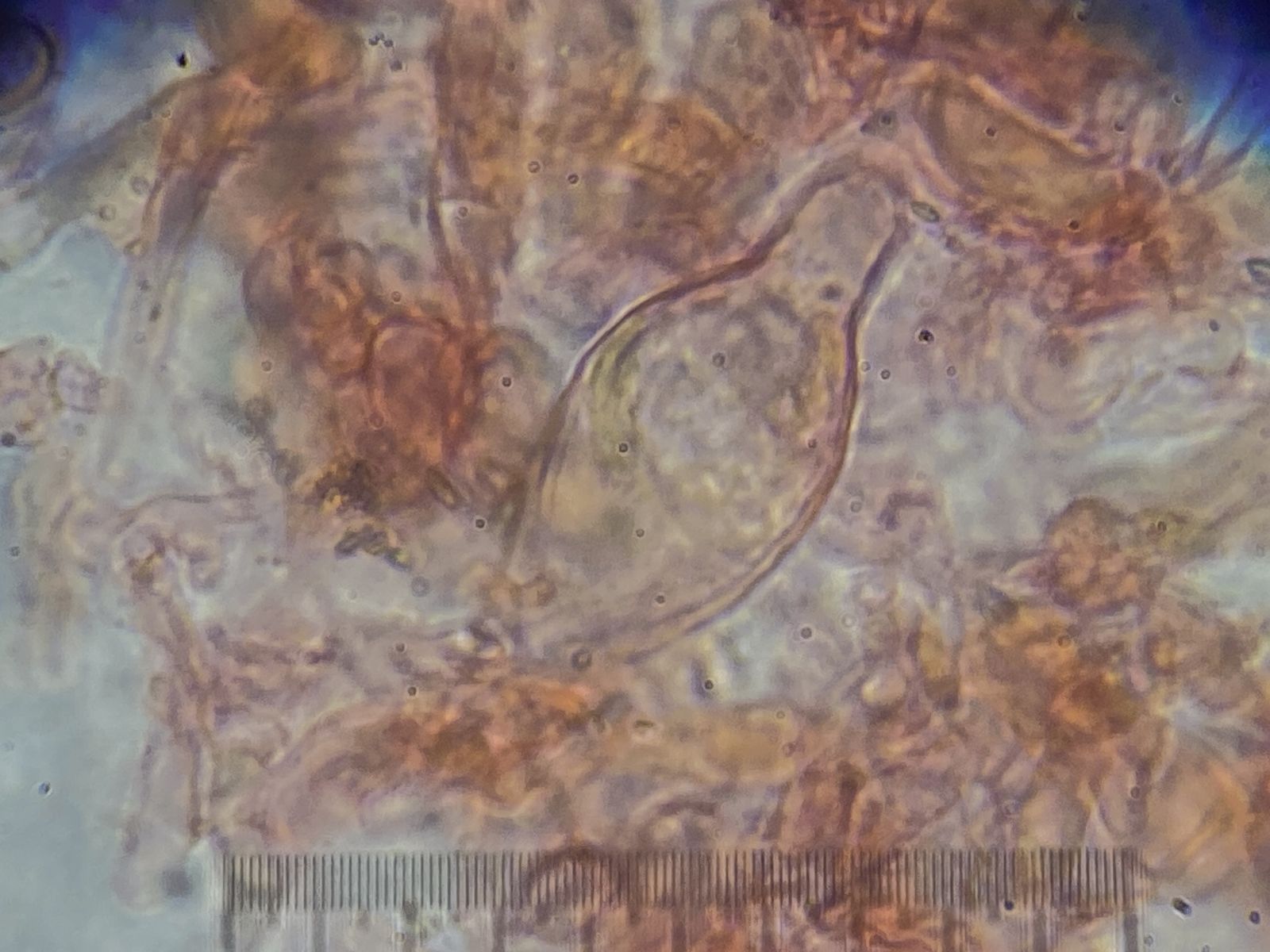 Der Pilz erinnert mich an die Fruchtkörper vom Mehltau-Hyperparasit Ampelomyces quisqualis. Dieser lässt aber auf Druck Massen an Konidien frei. Hier blieben auf Druck nur leere Hüllen zurück ohne jeglichen Konidienauswurf. Auffällig viele Kristalle waren auch zu sehen in Präparaten ohne Baumwollblau. Die Sporen vom Scytonostroma scheiden hier aus: sie sind amyloid, rund mit 5-6 x 4,5-6 µm.