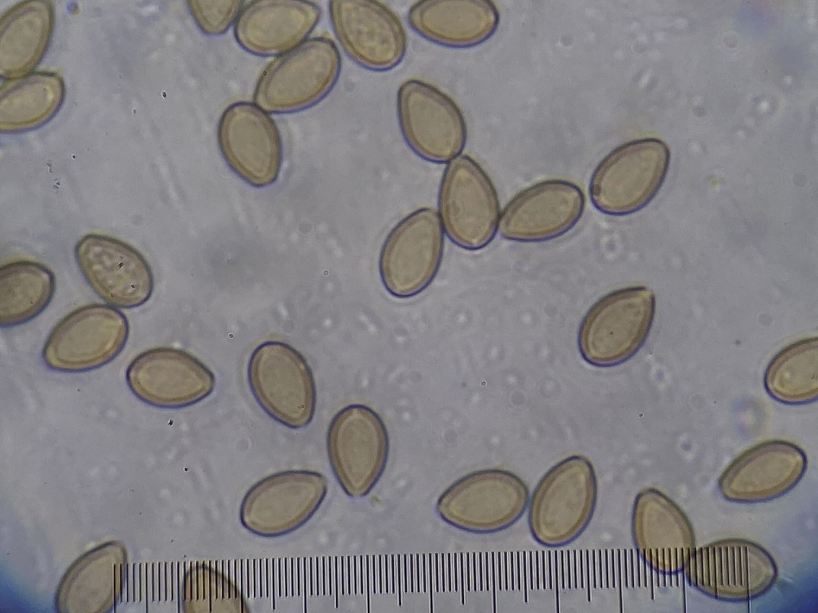 SPP unbekannt, da zu wenige Sp.; Sp. ca. 8-9 x 5-6 µm mit KP (nicht oliv! wie beim Rauchblättrigen Schwefelkopf)