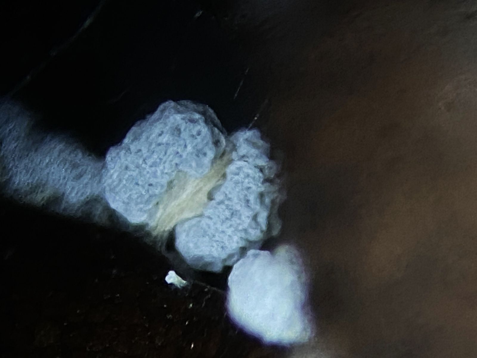 Um mir einmal Dendrohyphiden anzusehen, schälte ich den Mottenkugelpilz Scytinostroma portentosum mit Holz von einem morschen Ast. Danach verwahrte ich diese Schälstücke in einem Döschen. Nach einiger Zeit erschienen oben und unten Schimmelpilze. Die von oben konnte ich identifizieren, aber die beiden von unten, also auf dem Holz unter dem Mottenkugelpilzbelag, sind mir unbekannt. Vielleicht kennt die ja ein Experte.