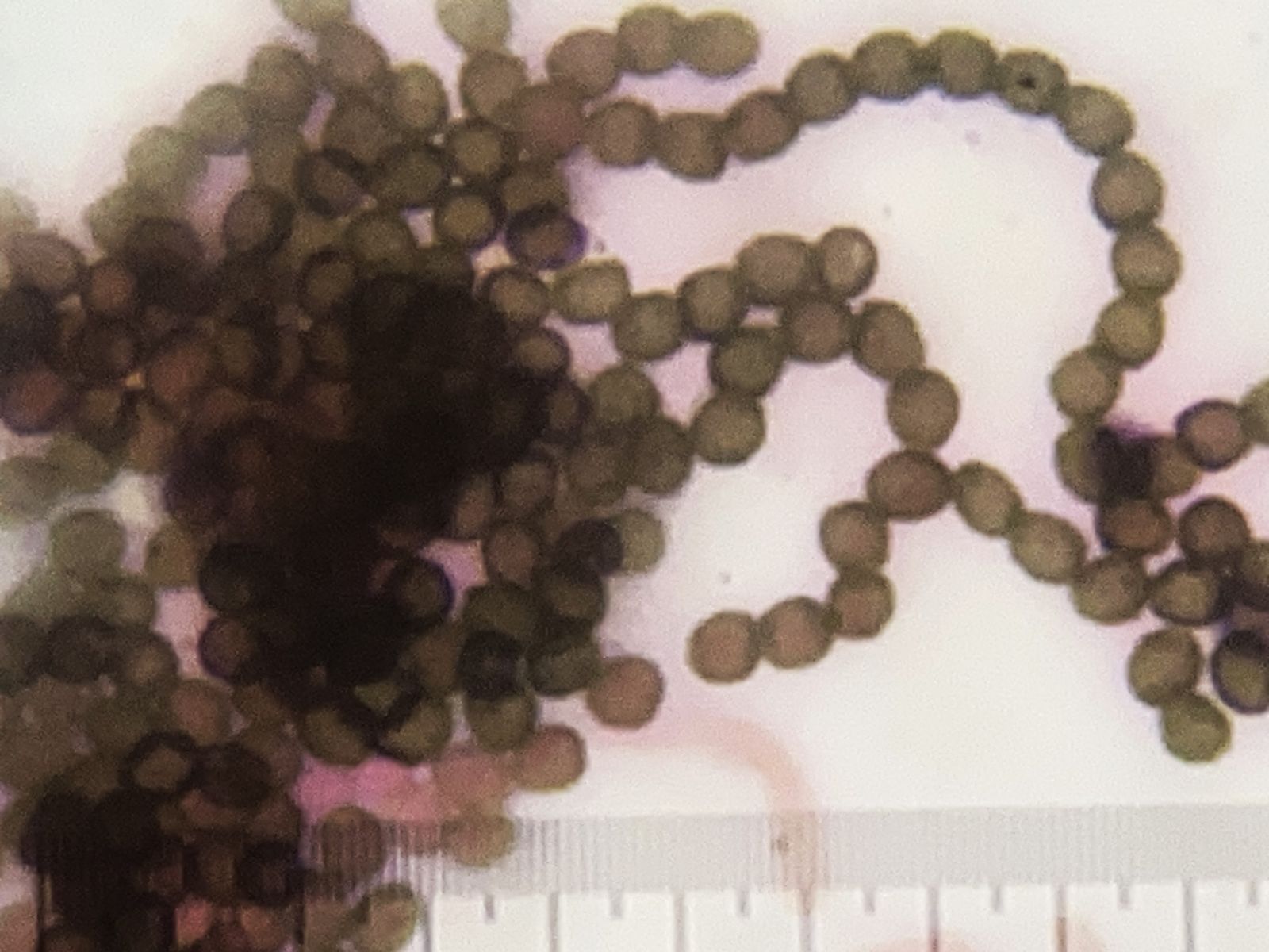 Da hier im 10er-Okular eine Skala integriert ist, wird Skala und Objekt immer zugleich vergrößert. Somit ist die Handy- oder Bildschirmvergößerung egal. Entscheidend ist nur das Objektiv (10x, 40x,100x). Die Größe des Objekts ergibt sich dann im Vergleich mit der Skala. Hier 0,6 µm pro Skaleneinheit beim 100er Objektiv.