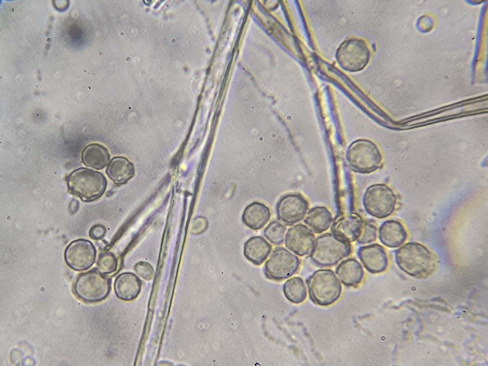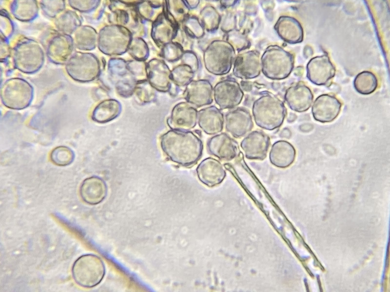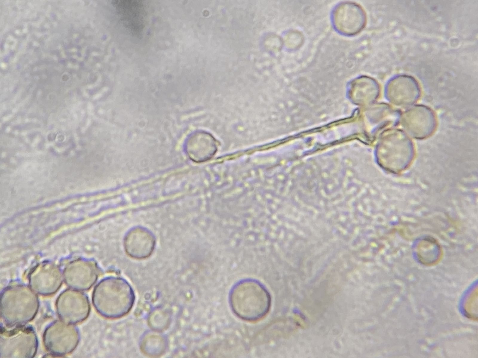 Kennt jemand diesen Schimmel- oder Jochpilz? Für Jochpilz spricht, dass ich eine Columella und eine Colarette, dagegen, dass ich Septen erahne. Aufgrund der runden, bräunlichen Konidien (5-6 µm) und hyalinen Hyphen jedenfalls kein Mucor, Rhizopus oder Absidia. Evl. doch ein Hyphomycet.
