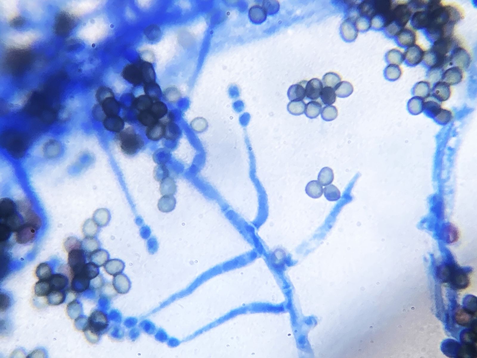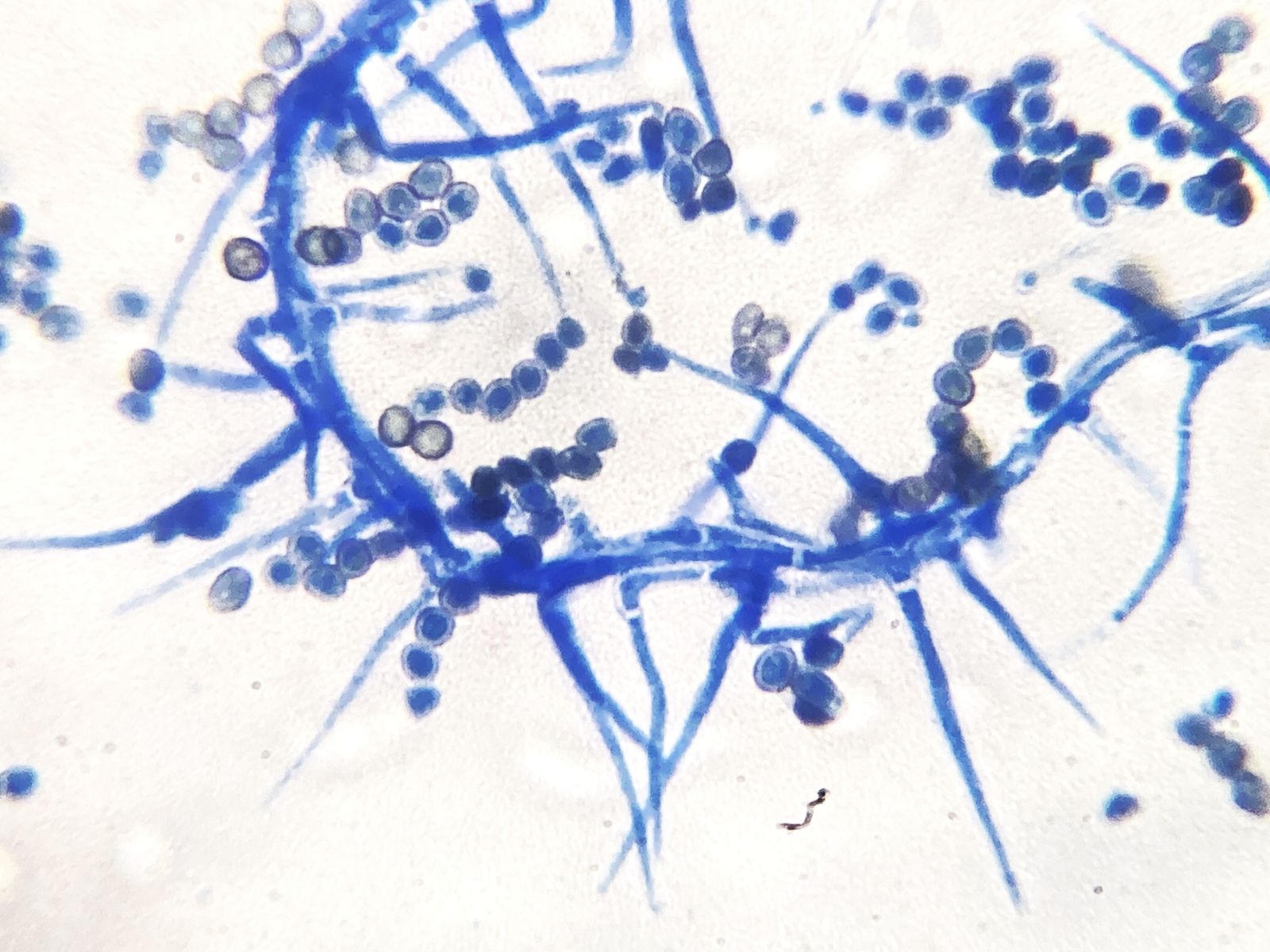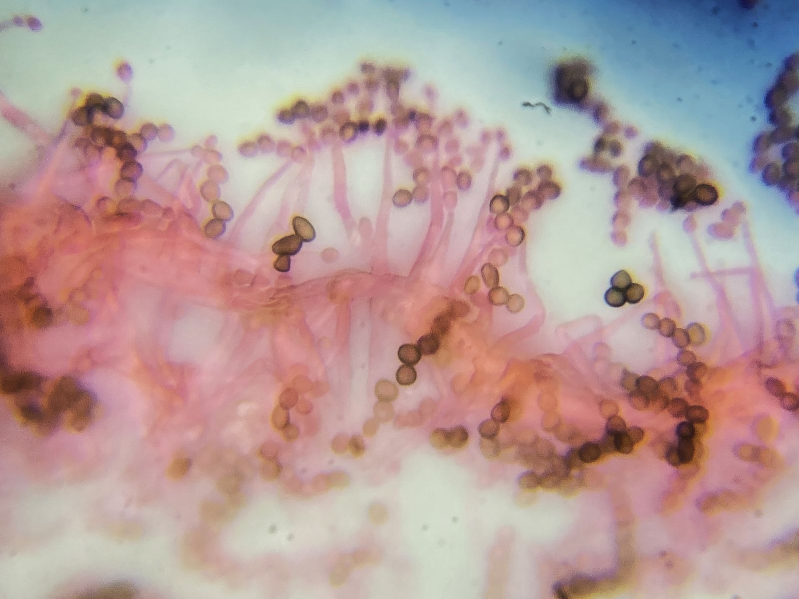 Kennt jemand diesen Schimmel- oder Jochpilz? Für Jochpilz spricht, dass ich eine Columella und eine Colarette, dagegen, dass ich Septen erahne. Aufgrund der runden, bräunlichen Konidien (5-6 µm) und hyalinen Hyphen jedenfalls kein Mucor, Rhizopus oder Absidia. Evl. doch ein Hyphomycet.