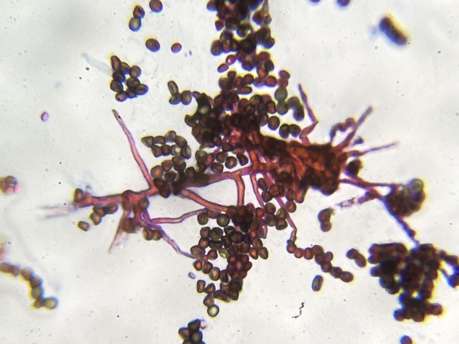 Dabei zeigt sich, dass Größe, Form und Farbe der Pollen deutlich anders sind als bei den Objekten in der Anfrage. Demnach kann es sich nicht um Pollen von Ahorn handeln. Vermutlich sind es Konidien der Art Nitrospora cf. oryzae. Dass ich keine zugehörigen Hyphen sah, könnte daran liegen, dass die Konidien bei dieser Gattung aktiv abgeschleudert werden. Oder ich hatte auf die separat liegenden dunklen Hyphen nicht geachtet, in der Meinung, diese würden zu Alternaria etc. gehören. Aber es gibt auch noch andere Hyphomycetenarten mit ähnlichen Konidien (z.B. Cordella sp.).