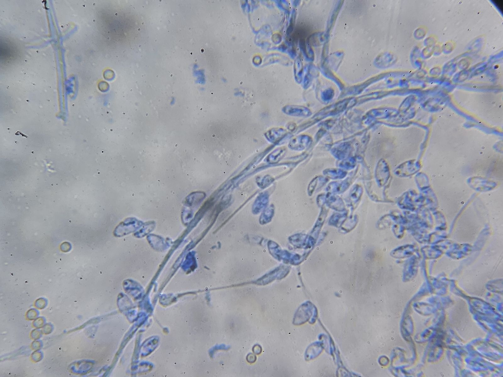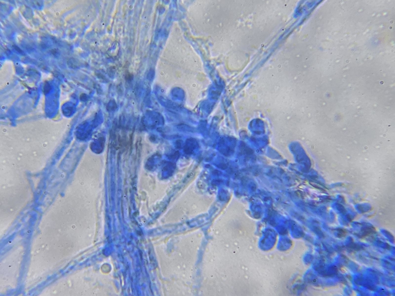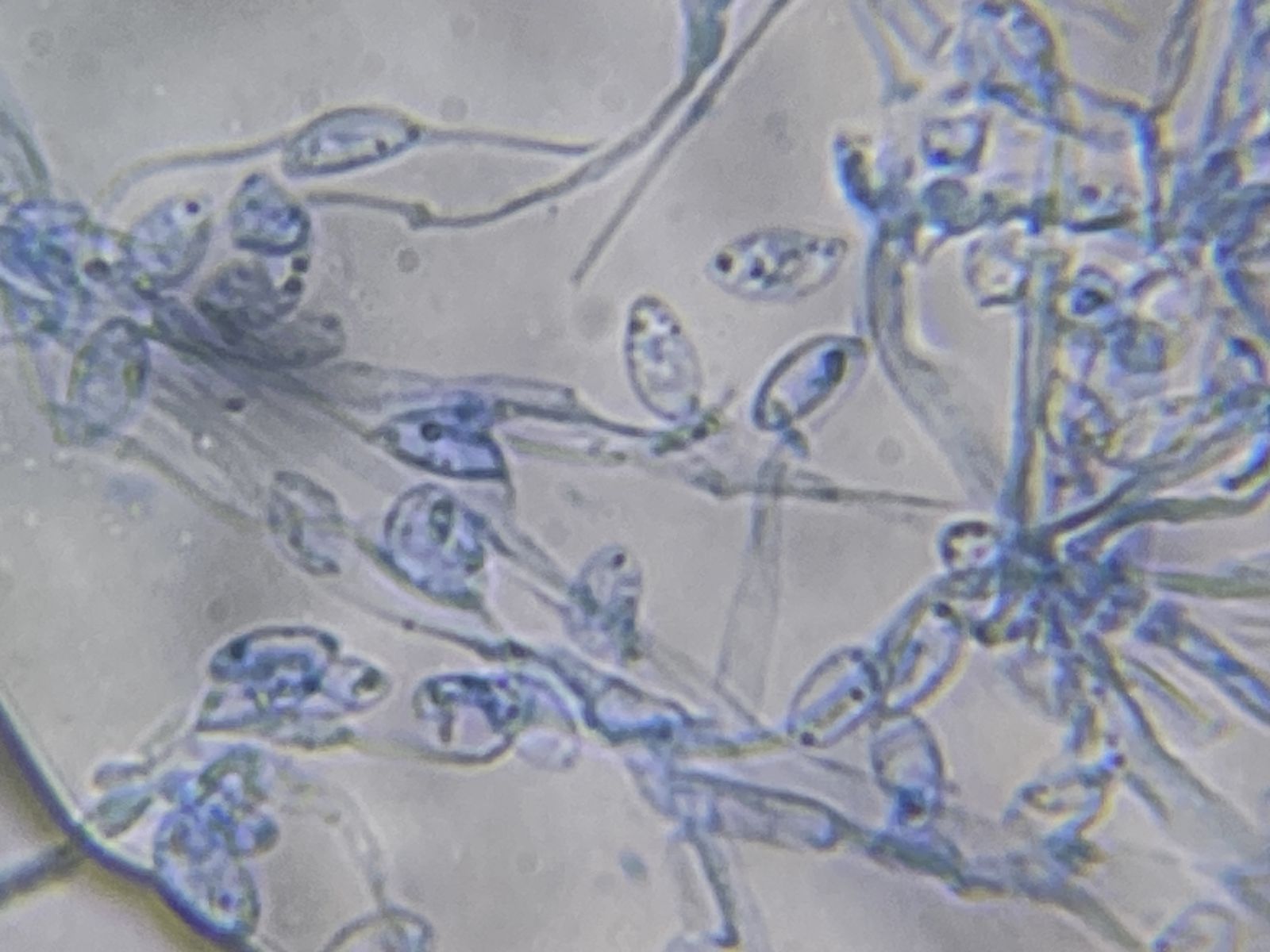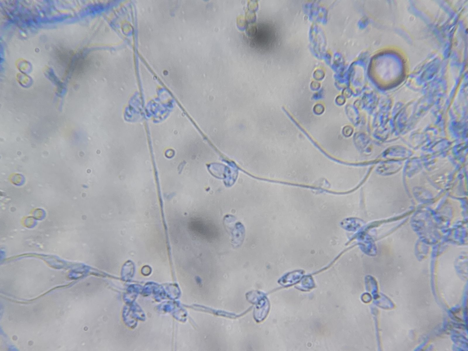 beim Leptoxyphium graminum werden die Konidien auch seitlich an den Hyphen gebildet. So etwas sah ich hier nicht. Bei syngliocladium acridiorum finden sich sehr ähnliche Sporen, aber nicht die dunklen Hyphenstränge. HG Tonio