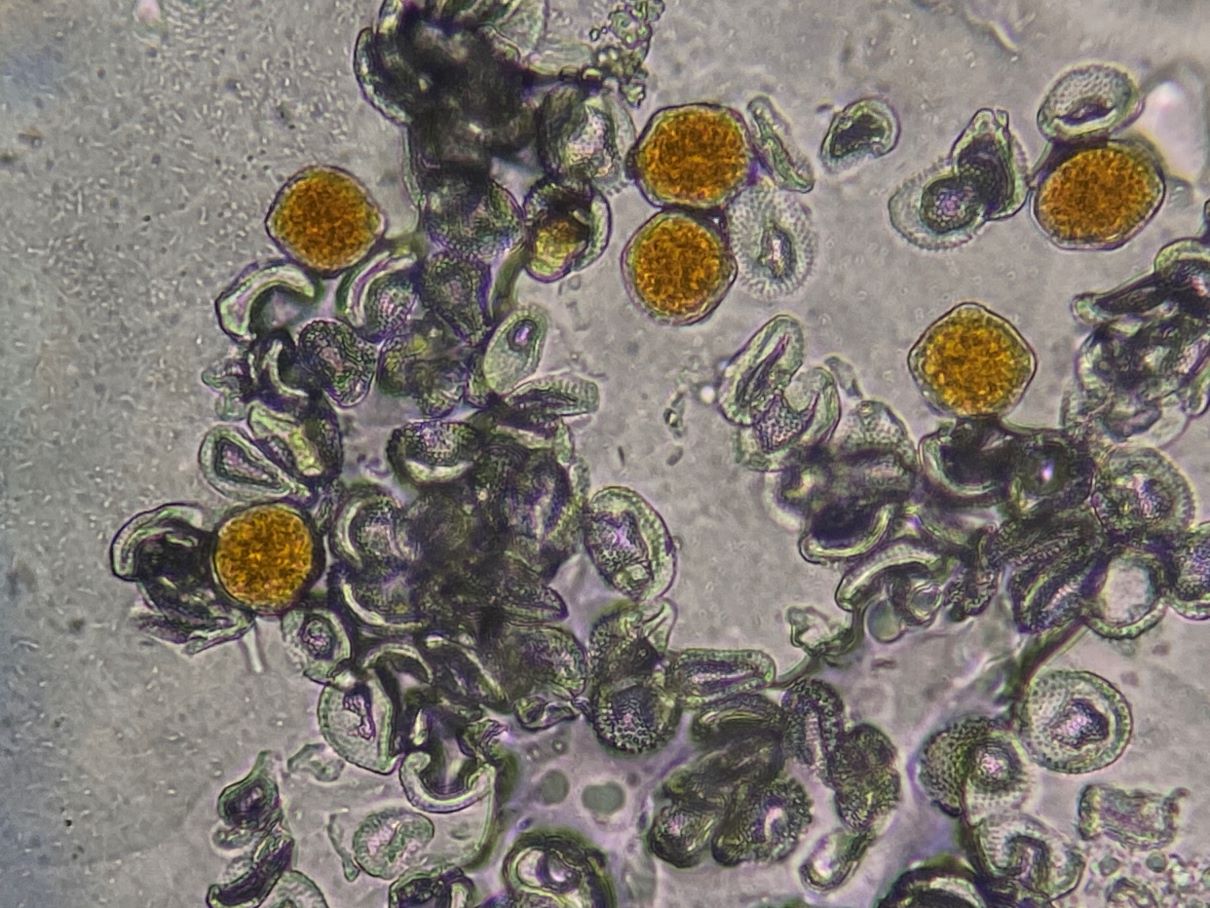 Die Formen auf den Fotos würde man wohl als Teliosporen und Uredosporen bezeichnen; dasselbe galt auch zunächst für mich. Aber mir kommen Zweifel. Bei diesem Phragmidium tuberculatum haben die Teliosporen in der Regel sechs Kammern. Diese Kammern werden hier gelegentlich zu runden orangen Objekten umgewandelt. Diese orangen Kugeln ähneln nun sehr den „Uredosporen“. Kann es sein, dass diese „Uredosporen“ Vermehrungszellen aus den Teliosporen sind? Basidien habe ich keine gesehen. Ich sah auch keine leeren Teliosporen, aber viele mit weniger als sechs Kammern/Kugeln.