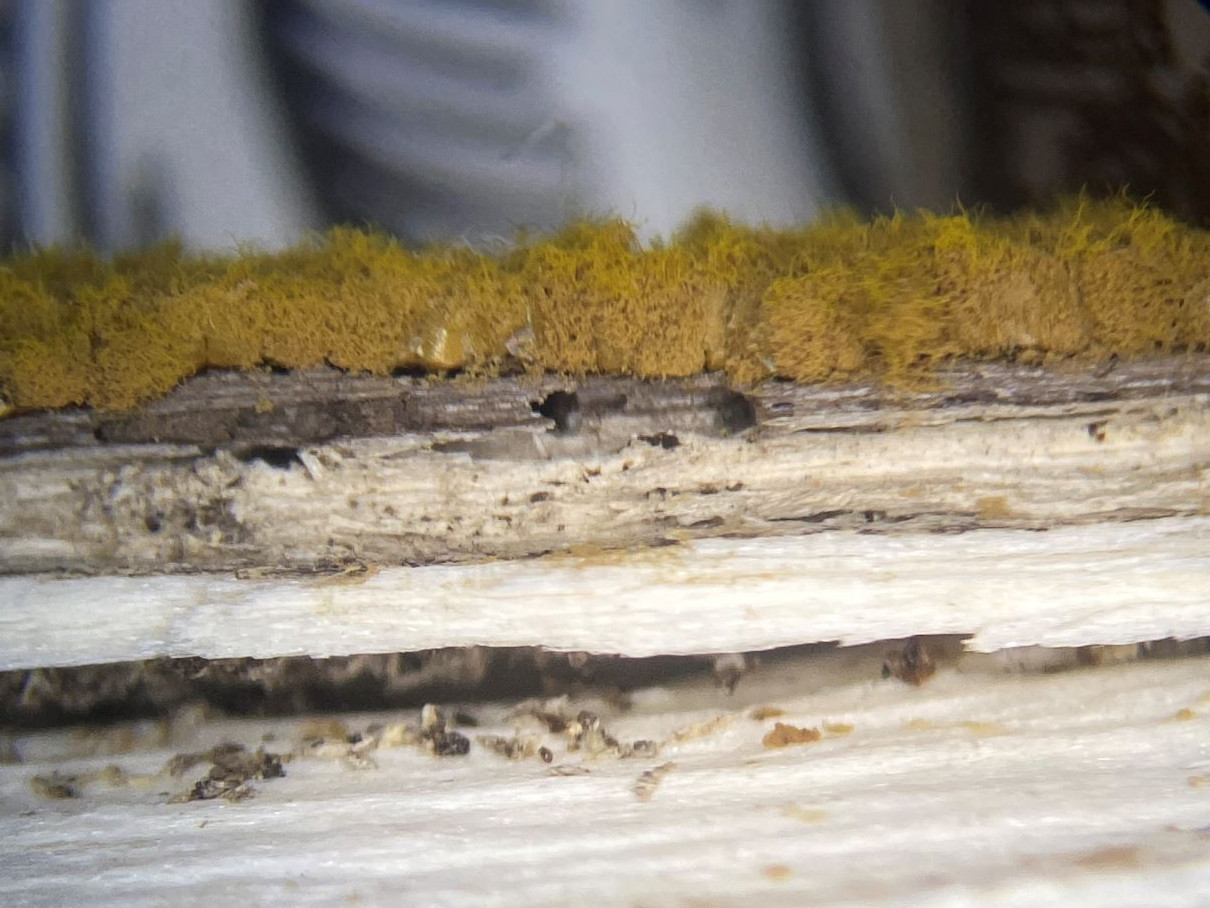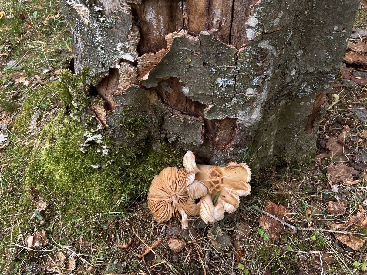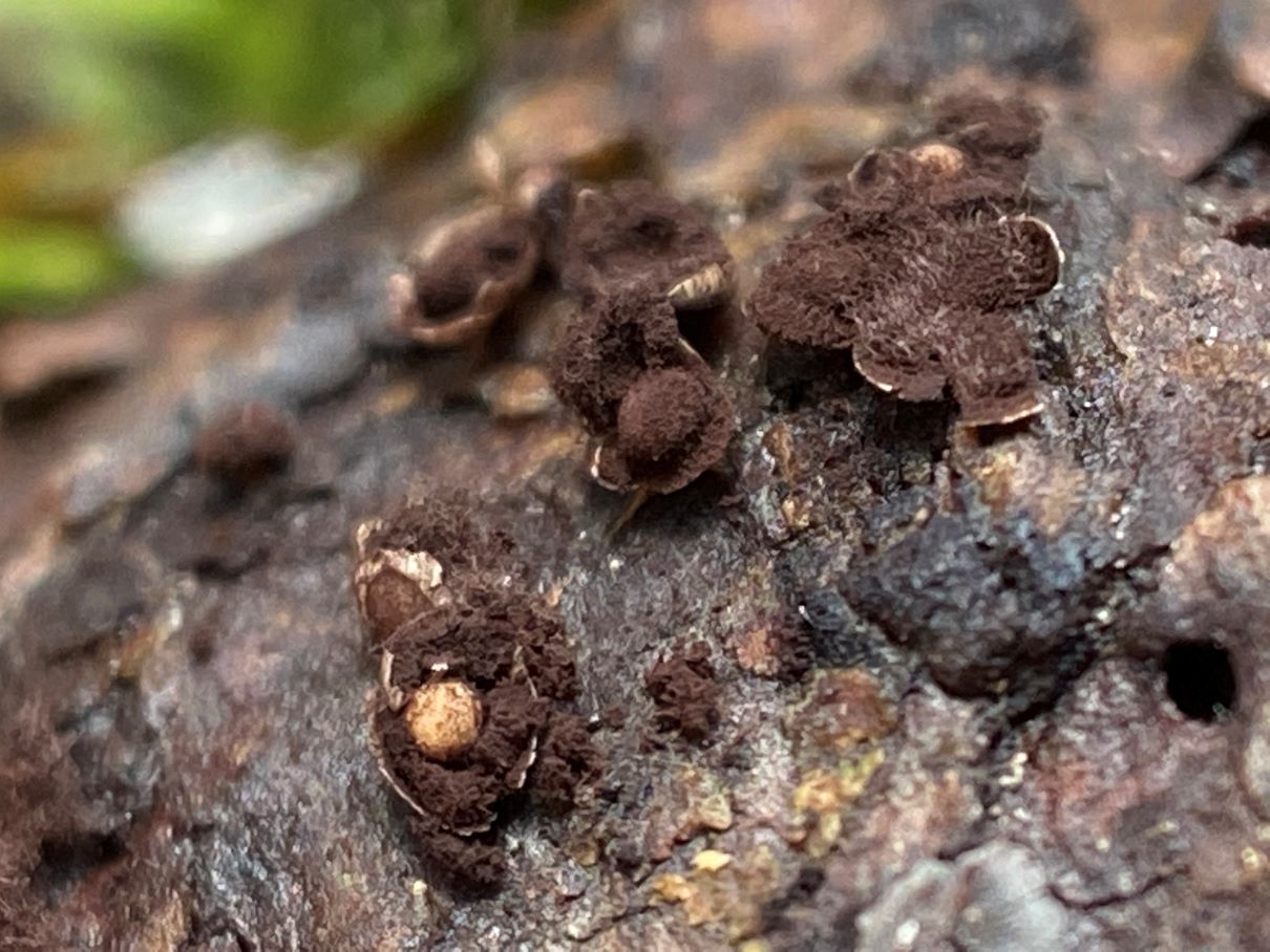 diesen braunen, flaumigen Aufwuchs auf anderen Trameten und auch solo auf dem Stubben kann ich nicht bestimmen. Könnte das die Braune Borstentramete (Coriolopsis gallica) sein? Leider gab es noch keine Ausprägung des Hymeniums.