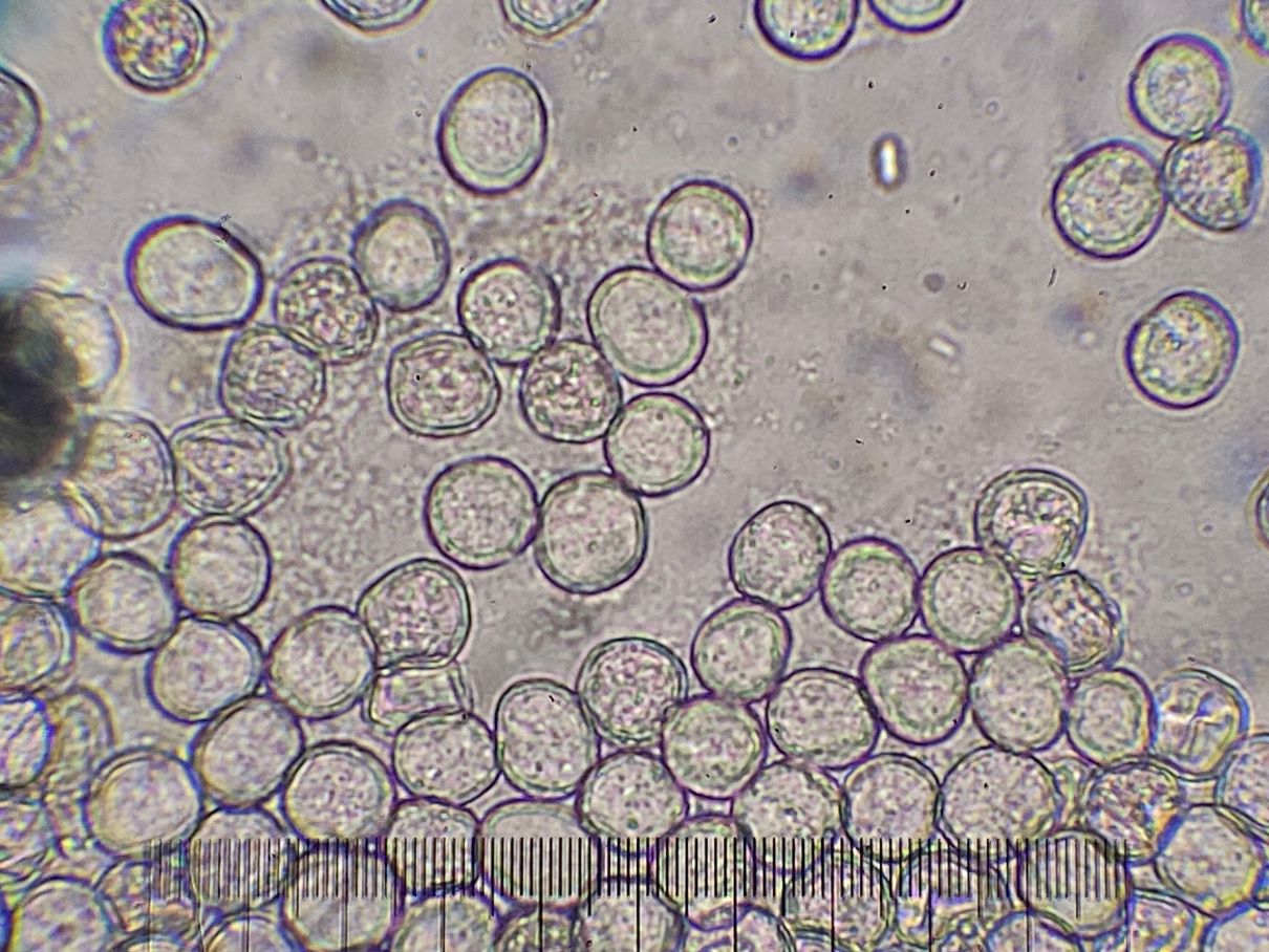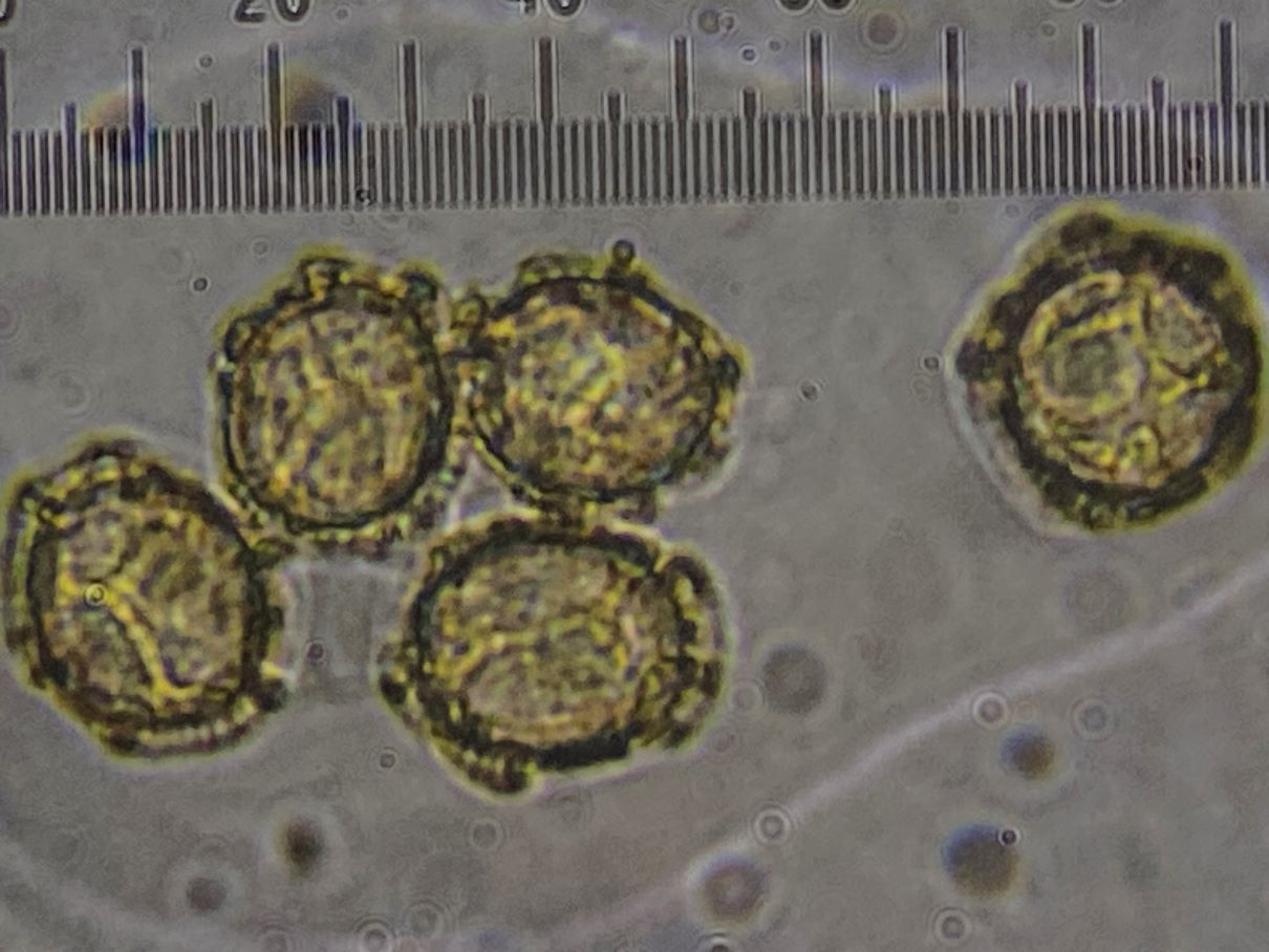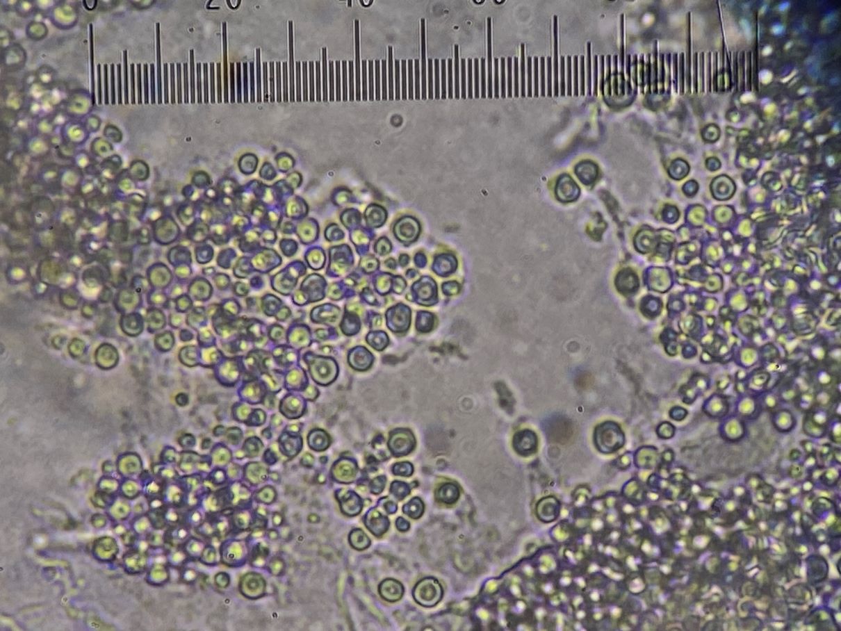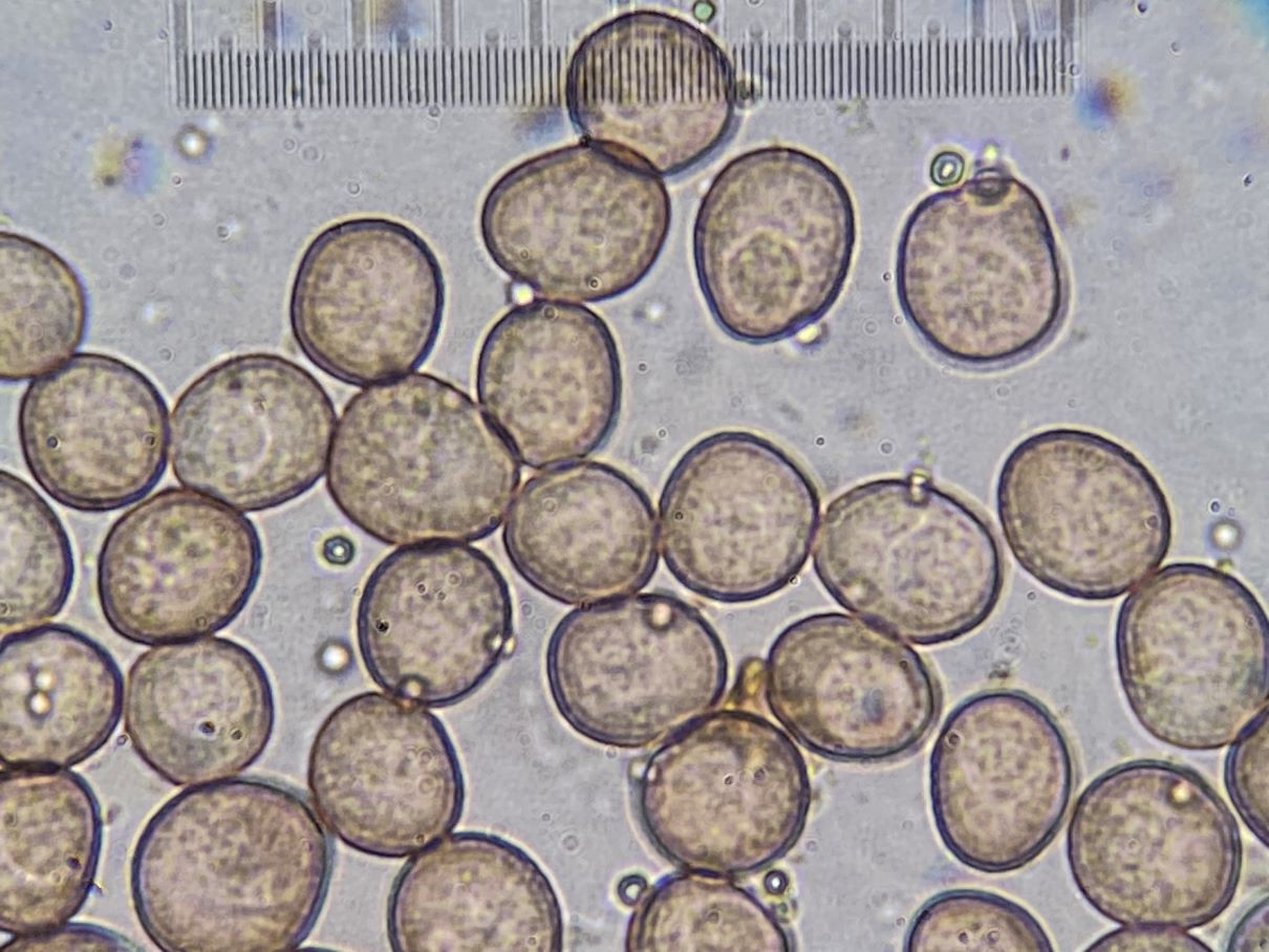 die Sporengröße ging tatsächlich bis ca. 10, 5 µm. Ich habe auch noch weitere Fotos. Z.B. seltsam gekammerte Sporen. Aber diese Fotos werden vermutlich auch nicht weiter helfen bei dem seltenen Pilz.